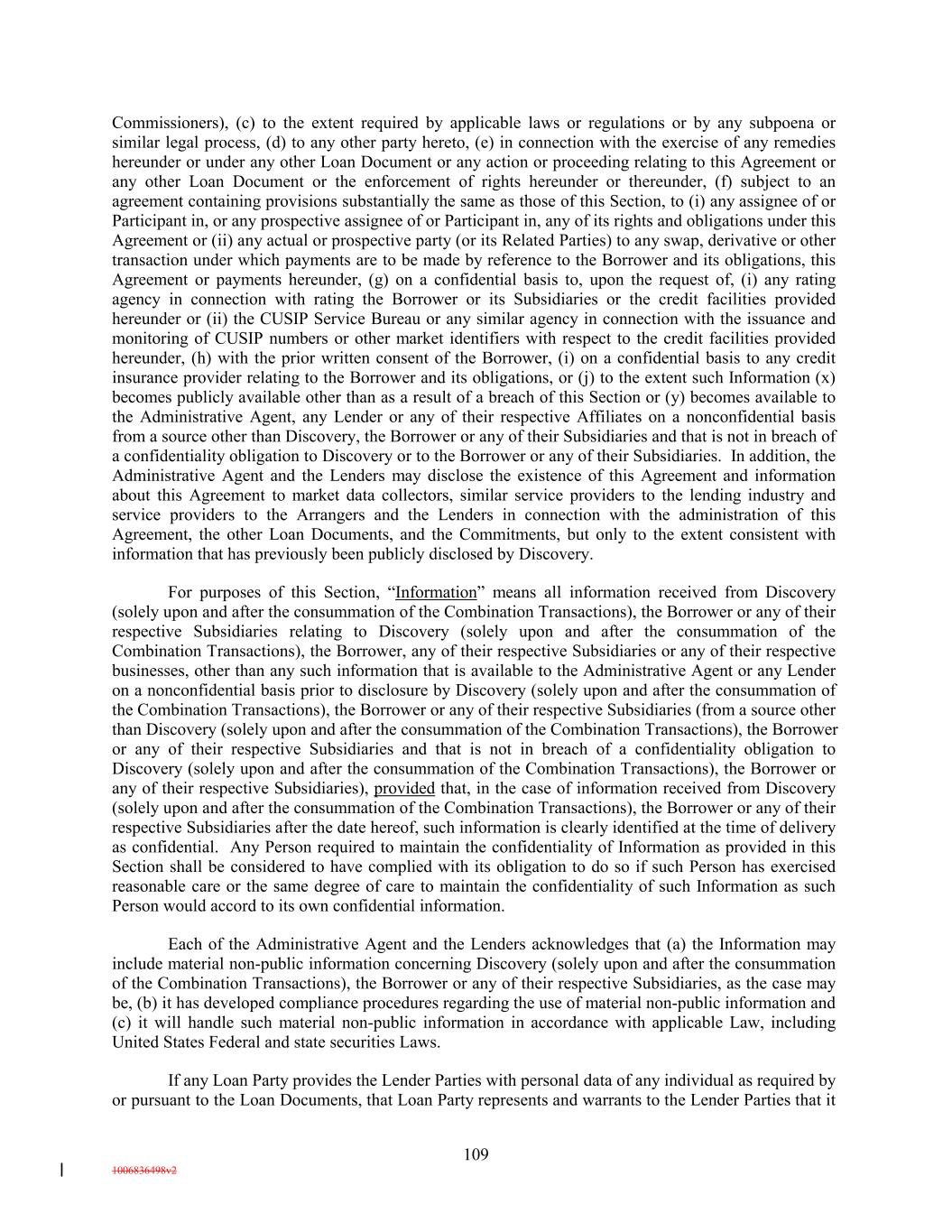 Commissioners), (c) to the extent required by applicable laws or regulations or by any subpoena or similar legal process, (d) to any other party hereto, (e) in connection with the exercise of any remedies hereunder or under any other Loan Document or any action or proceeding relating to this Agreement or any other Loan Document or the enforcement of rights hereunder or thereunder, (f) subject to an agreement containing provisions substantially the same as those of this Section, to (i) any assignee of or Participant in, or any prospective assignee of or Participant in, any of its rights and obligations under this Agreement or (ii) any actual or prospective party (or its Related Parties) to any swap, derivative or other transaction under which payments are to be made by reference to the Borrower and its obligations, this Agreement or payments hereunder, (g) on a confidential basis to, upon the request of, (i) any rating agency in connection with rating the Borrower or its Subsidiaries or the credit facilities provided hereunder or (ii) the CUSIP Service Bureau or any similar agency in connection with the issuance and monitoring of CUSIP numbers or other market identifiers with respect to the credit facilities provided hereunder, (h) with the prior written consent of the Borrower, (i) on a confidential basis to any credit insurance provider relating to the Borrower and its obligations, or (j) to the extent such Information (x) becomes publicly available other than as a result of a breach of this Section or (y) becomes available to the Administrative Agent, any Lender or any of their respective Affiliates on a nonconfidential basis from a source other than Discovery, the Borrower or any of their Subsidiaries and that is not in breach of a confidentiality obligation to Discovery or to the Borrower or any of their Subsidiaries. In addition, the Administrative Agent and the Lenders may disclose the existence of this Agreement and information about this Agreement to market data collectors, similar service providers to the lending industry and service providers to the Arrangers and the Lenders in connection with the administration of this Agreement, the other Loan Documents, and the Commitments, but only to the extent consistent with information that has previously been publicly disclosed by Discovery. For purposes of this Section, “Information” means all information received from Discovery (solely upon and after the consummation of the Combination Transactions), the Borrower or any of their respective Subsidiaries relating to Discovery (solely upon and after the consummation of the Combination Transactions), the Borrower, any of their respective Subsidiaries or any of their respective businesses, other than any such information that is available to the Administrative Agent or any Lender on a nonconfidential basis prior to disclosure by Discovery (solely upon and after the consummation of the Combination Transactions), the Borrower or any of their respective Subsidiaries (from a source other than Discovery (solely upon and after the consummation of the Combination Transactions), the Borrower or any of their respective Subsidiaries and that is not in breach of a confidentiality obligation to Discovery (solely upon and after the consummation of the Combination Transactions), the Borrower or any of their respective Subsidiaries), provided that, in the case of information received from Discovery (solely upon and after the consummation of the Combination Transactions), the Borrower or any of their respective Subsidiaries after the date hereof, such information is clearly identified at the time of delivery as confidential. Any Person required to maintain the confidentiality of Information as provided in this Section shall be considered to have complied with its obligation to do so if such Person has exercised reasonable care or the same degree of care to maintain the confidentiality of such Information as such Person would accord to its own confidential information. Each of the Administrative Agent and the Lenders acknowledges that (a) the Information may include material non-public information concerning Discovery (solely upon and after the consummation of the Combination Transactions), the Borrower or any of their respective Subsidiaries, as the case may be, (b) it has developed compliance procedures regarding the use of material non-public information and (c) it will handle such material non-public information in accordance with applicable Law, including United States Federal and state securities Laws. If any Loan Party provides the Lender Parties with personal data of any individual as required by or pursuant to the Loan Documents, that Loan Party represents and warrants to the Lender Parties that it 109 1006836498v2