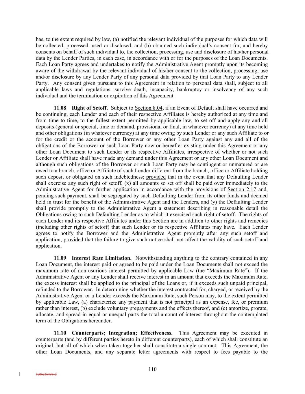 has, to the extent required by law, (a) notified the relevant individual of the purposes for which data will be collected, processed, used or disclosed, and (b) obtained such individual’s consent for, and hereby consents on behalf of such individual to, the collection, processing, use and disclosure of his/her personal data by the Lender Parties, in each case, in accordance with or for the purposes of the Loan Documents. Each Loan Party agrees and undertakes to notify the Administrative Agent promptly upon its becoming aware of the withdrawal by the relevant individual of his/her consent to the collection, processing, use and/or disclosure by any Lender Party of any personal data provided by that Loan Party to any Lender Party. Any consent given pursuant to this Agreement in relation to personal data shall, subject to all applicable laws and regulations, survive death, incapacity, bankruptcy or insolvency of any such individual and the termination or expiration of this Agreement. 11.08 Right of Setoff. Subject to Section 8.04, if an Event of Default shall have occurred and be continuing, each Lender and each of their respective Affiliates is hereby authorized at any time and from time to time, to the fullest extent permitted by applicable law, to set off and apply any and all deposits (general or special, time or demand, provisional or final, in whatever currency) at any time held and other obligations (in whatever currency) at any time owing by such Lender or any such Affiliate to or for the credit or the account of the Borrower or any other Loan Party against any and all of the obligations of the Borrower or such Loan Party now or hereafter existing under this Agreement or any other Loan Document to such Lender or its respective Affiliates, irrespective of whether or not such Lender or Affiliate shall have made any demand under this Agreement or any other Loan Document and although such obligations of the Borrower or such Loan Party may be contingent or unmatured or are owed to a branch, office or Affiliate of such Lender different from the branch, office or Affiliate holding such deposit or obligated on such indebtedness; provided that in the event that any Defaulting Lender shall exercise any such right of setoff, (x) all amounts so set off shall be paid over immediately to the Administrative Agent for further application in accordance with the provisions of Section 2.17 and, pending such payment, shall be segregated by such Defaulting Lender from its other funds and deemed held in trust for the benefit of the Administrative Agent and the Lenders, and (y) the Defaulting Lender shall provide promptly to the Administrative Agent a statement describing in reasonable detail the Obligations owing to such Defaulting Lender as to which it exercised such right of setoff. The rights of each Lender and its respective Affiliates under this Section are in addition to other rights and remedies (including other rights of setoff) that such Lender or its respective Affiliates may have. Each Lender agrees to notify the Borrower and the Administrative Agent promptly after any such setoff and application, provided that the failure to give such notice shall not affect the validity of such setoff and application. 11.09 Interest Rate Limitation. Notwithstanding anything to the contrary contained in any Loan Document, the interest paid or agreed to be paid under the Loan Documents shall not exceed the maximum rate of non-usurious interest permitted by applicable Law (the “Maximum Rate”). If the Administrative Agent or any Lender shall receive interest in an amount that exceeds the Maximum Rate, the excess interest shall be applied to the principal of the Loans or, if it exceeds such unpaid principal, refunded to the Borrower. In determining whether the interest contracted for, charged, or received by the Administrative Agent or a Lender exceeds the Maximum Rate, such Person may, to the extent permitted by applicable Law, (a) characterize any payment that is not principal as an expense, fee, or premium rather than interest, (b) exclude voluntary prepayments and the effects thereof, and (c) amortize, prorate, allocate, and spread in equal or unequal parts the total amount of interest throughout the contemplated term of the Obligations hereunder. 11.10 Counterparts; Integration; Effectiveness. This Agreement may be executed in counterparts (and by different parties hereto in different counterparts), each of which shall constitute an original, but all of which when taken together shall constitute a single contract. This Agreement, the other Loan Documents, and any separate letter agreements with respect to fees payable to the 110 1006836498v2
