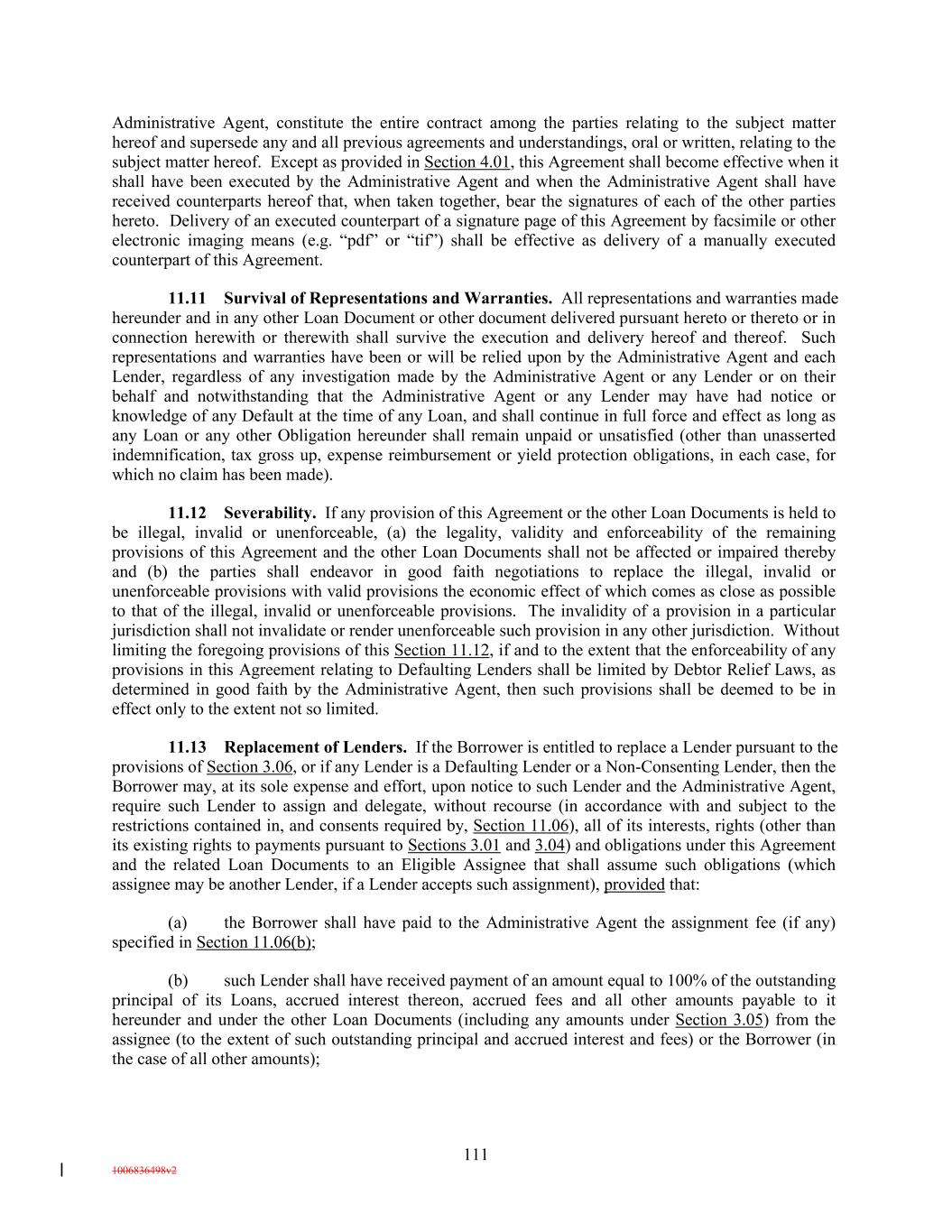 Administrative Agent, constitute the entire contract among the parties relating to the subject matter hereof and supersede any and all previous agreements and understandings, oral or written, relating to the subject matter hereof. Except as provided in Section 4.01, this Agreement shall become effective when it shall have been executed by the Administrative Agent and when the Administrative Agent shall have received counterparts hereof that, when taken together, bear the signatures of each of the other parties hereto. Delivery of an executed counterpart of a signature page of this Agreement by facsimile or other electronic imaging means (e.g. “pdf” or “tif”) shall be effective as delivery of a manually executed counterpart of this Agreement. 11.11 Survival of Representations and Warranties. All representations and warranties made hereunder and in any other Loan Document or other document delivered pursuant hereto or thereto or in connection herewith or therewith shall survive the execution and delivery hereof and thereof. Such representations and warranties have been or will be relied upon by the Administrative Agent and each Lender, regardless of any investigation made by the Administrative Agent or any Lender or on their behalf and notwithstanding that the Administrative Agent or any Lender may have had notice or knowledge of any Default at the time of any Loan, and shall continue in full force and effect as long as any Loan or any other Obligation hereunder shall remain unpaid or unsatisfied (other than unasserted indemnification, tax gross up, expense reimbursement or yield protection obligations, in each case, for which no claim has been made). 11.12 Severability. If any provision of this Agreement or the other Loan Documents is held to be illegal, invalid or unenforceable, (a) the legality, validity and enforceability of the remaining provisions of this Agreement and the other Loan Documents shall not be affected or impaired thereby and (b) the parties shall endeavor in good faith negotiations to replace the illegal, invalid or unenforceable provisions with valid provisions the economic effect of which comes as close as possible to that of the illegal, invalid or unenforceable provisions. The invalidity of a provision in a particular jurisdiction shall not invalidate or render unenforceable such provision in any other jurisdiction. Without limiting the foregoing provisions of this Section 11.12, if and to the extent that the enforceability of any provisions in this Agreement relating to Defaulting Lenders shall be limited by Debtor Relief Laws, as determined in good faith by the Administrative Agent, then such provisions shall be deemed to be in effect only to the extent not so limited. 11.13 Replacement of Lenders. If the Borrower is entitled to replace a Lender pursuant to the provisions of Section 3.06, or if any Lender is a Defaulting Lender or a Non-Consenting Lender, then the Borrower may, at its sole expense and effort, upon notice to such Lender and the Administrative Agent, require such Lender to assign and delegate, without recourse (in accordance with and subject to the restrictions contained in, and consents required by, Section 11.06), all of its interests, rights (other than its existing rights to payments pursuant to Sections 3.01 and 3.04) and obligations under this Agreement and the related Loan Documents to an Eligible Assignee that shall assume such obligations (which assignee may be another Lender, if a Lender accepts such assignment), provided that: (a) the Borrower shall have paid to the Administrative Agent the assignment fee (if any) specified in Section 11.06(b); (b) such Lender shall have received payment of an amount equal to 100% of the outstanding principal of its Loans, accrued interest thereon, accrued fees and all other amounts payable to it hereunder and under the other Loan Documents (including any amounts under Section 3.05) from the assignee (to the extent of such outstanding principal and accrued interest and fees) or the Borrower (in the case of all other amounts); 111 1006836498v2