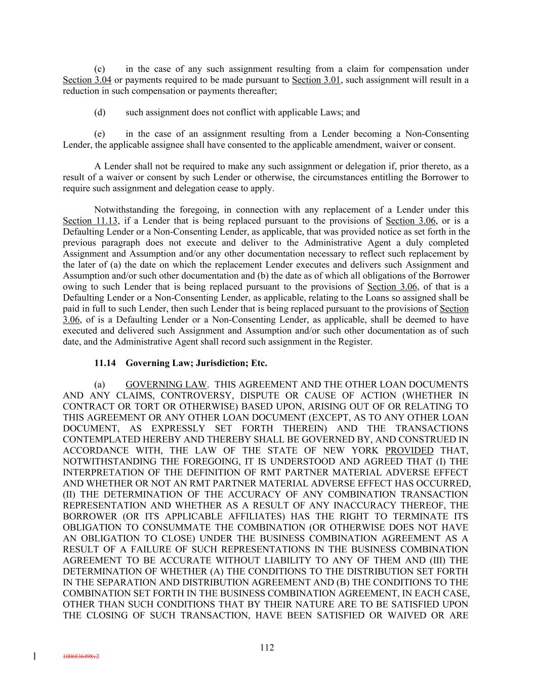 (c) in the case of any such assignment resulting from a claim for compensation under Section 3.04 or payments required to be made pursuant to Section 3.01, such assignment will result in a reduction in such compensation or payments thereafter; (d) such assignment does not conflict with applicable Laws; and (e) in the case of an assignment resulting from a Lender becoming a Non-Consenting Lender, the applicable assignee shall have consented to the applicable amendment, waiver or consent. A Lender shall not be required to make any such assignment or delegation if, prior thereto, as a result of a waiver or consent by such Lender or otherwise, the circumstances entitling the Borrower to require such assignment and delegation cease to apply. Notwithstanding the foregoing, in connection with any replacement of a Lender under this Section 11.13, if a Lender that is being replaced pursuant to the provisions of Section 3.06, or is a Defaulting Lender or a Non-Consenting Lender, as applicable, that was provided notice as set forth in the previous paragraph does not execute and deliver to the Administrative Agent a duly completed Assignment and Assumption and/or any other documentation necessary to reflect such replacement by the later of (a) the date on which the replacement Lender executes and delivers such Assignment and Assumption and/or such other documentation and (b) the date as of which all obligations of the Borrower owing to such Lender that is being replaced pursuant to the provisions of Section 3.06, of that is a Defaulting Lender or a Non-Consenting Lender, as applicable, relating to the Loans so assigned shall be paid in full to such Lender, then such Lender that is being replaced pursuant to the provisions of Section 3.06, of is a Defaulting Lender or a Non-Consenting Lender, as applicable, shall be deemed to have executed and delivered such Assignment and Assumption and/or such other documentation as of such date, and the Administrative Agent shall record such assignment in the Register. 11.14 Governing Law; Jurisdiction; Etc. (a) GOVERNING LAW. THIS AGREEMENT AND THE OTHER LOAN DOCUMENTS AND ANY CLAIMS, CONTROVERSY, DISPUTE OR CAUSE OF ACTION (WHETHER IN CONTRACT OR TORT OR OTHERWISE) BASED UPON, ARISING OUT OF OR RELATING TO THIS AGREEMENT OR ANY OTHER LOAN DOCUMENT (EXCEPT, AS TO ANY OTHER LOAN DOCUMENT, AS EXPRESSLY SET FORTH THEREIN) AND THE TRANSACTIONS CONTEMPLATED HEREBY AND THEREBY SHALL BE GOVERNED BY, AND CONSTRUED IN ACCORDANCE WITH, THE LAW OF THE STATE OF NEW YORK PROVIDED THAT, NOTWITHSTANDING THE FOREGOING, IT IS UNDERSTOOD AND AGREED THAT (I) THE INTERPRETATION OF THE DEFINITION OF RMT PARTNER MATERIAL ADVERSE EFFECT AND WHETHER OR NOT AN RMT PARTNER MATERIAL ADVERSE EFFECT HAS OCCURRED, (II) THE DETERMINATION OF THE ACCURACY OF ANY COMBINATION TRANSACTION REPRESENTATION AND WHETHER AS A RESULT OF ANY INACCURACY THEREOF, THE BORROWER (OR ITS APPLICABLE AFFILIATES) HAS THE RIGHT TO TERMINATE ITS OBLIGATION TO CONSUMMATE THE COMBINATION (OR OTHERWISE DOES NOT HAVE AN OBLIGATION TO CLOSE) UNDER THE BUSINESS COMBINATION AGREEMENT AS A RESULT OF A FAILURE OF SUCH REPRESENTATIONS IN THE BUSINESS COMBINATION AGREEMENT TO BE ACCURATE WITHOUT LIABILITY TO ANY OF THEM AND (III) THE DETERMINATION OF WHETHER (A) THE CONDITIONS TO THE DISTRIBUTION SET FORTH IN THE SEPARATION AND DISTRIBUTION AGREEMENT AND (B) THE CONDITIONS TO THE COMBINATION SET FORTH IN THE BUSINESS COMBINATION AGREEMENT, IN EACH CASE, OTHER THAN SUCH CONDITIONS THAT BY THEIR NATURE ARE TO BE SATISFIED UPON THE CLOSING OF SUCH TRANSACTION, HAVE BEEN SATISFIED OR WAIVED OR ARE 112 1006836498v2
