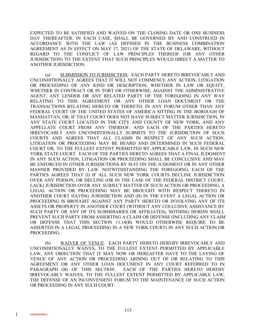 EXPECTED TO BE SATISFIED AND WAIVED ON THE CLOSING DATE OR ONE BUSINESS DAY THEREAFTER, IN EACH CASE, SHALL BE GOVERNED BY AND CONSTRUED IN ACCORDANCE WITH THE LAW (AS DEFINED IN THE BUSINESS COMBINATION AGREEMENT AS IN EFFECT ON MAY 17, 2021) OF THE STATE OF DELAWARE, WITHOUT REGARD TO THE CONFLICT OF LAW PRINCIPLES THEREOF (OR ANY OTHER JURISDICTION) TO THE EXTENT THAT SUCH PRINCIPLES WOULD DIRECT A MATTER TO ANOTHER JURISDICTION. (a) SUBMISSION TO JURISDICTION. EACH PARTY HERETO IRREVOCABLY AND UNCONDITIONALLY AGREES THAT IT WILL NOT COMMENCE ANY ACTION, LITIGATION OR PROCEEDING OF ANY KIND OR DESCRIPTION, WHETHER IN LAW OR EQUITY, WHETHER IN CONTRACT OR IN TORT OR OTHERWISE, AGAINST THE ADMINISTRATIVE AGENT, ANY LENDER OR ANY RELATED PARTY OF THE FOREGOING IN ANY WAY RELATING TO THIS AGREEMENT OR ANY OTHER LOAN DOCUMENT OR THE TRANSACTIONS RELATING HERETO OR THERETO, IN ANY FORUM OTHER THAN ANY FEDERAL COURT OF THE UNITED STATES OF AMERICA SITTING IN THE BOROUGH OF MANHATTAN, OR, IF THAT COURT DOES NOT HAVE SUBJECT MATTER JURISDICTION, IN ANY STATE COURT LOCATED IN THE CITY AND COUNTY OF NEW YORK, AND ANY APPELLATE COURT FROM ANY THEREOF, AND EACH OF THE PARTIES HERETO IRREVOCABLY AND UNCONDITIONALLY SUBMITS TO THE JURISDICTION OF SUCH COURTS AND AGREES THAT ALL CLAIMS IN RESPECT OF ANY SUCH ACTION, LITIGATION OR PROCEEDING MAY BE HEARD AND DETERMINED IN SUCH FEDERAL COURT OR, TO THE FULLEST EXTENT PERMITTED BY APPLICABLE LAW, IN SUCH NEW YORK STATE COURT. EACH OF THE PARTIES HERETO AGREES THAT A FINAL JUDGMENT IN ANY SUCH ACTION, LITIGATION OR PROCEEDING SHALL BE CONCLUSIVE AND MAY BE ENFORCED IN OTHER JURISDICTIONS BY SUIT ON THE JUDGMENT OR IN ANY OTHER MANNER PROVIDED BY LAW. NOTWITHSTANDING THE FOREGOING, EACH OF THE PARTIES AGREES THAT (I) IF ALL SUCH NEW YORK COURTS DECLINE JURISDICTION OVER ANY PERSON, OR DECLINE (OR IN THE CASE OF THE FEDERAL DISTRICT COURT, LACK) JURISDICTION OVER ANY SUBJECT MATTER OF SUCH ACTION OR PROCEEDING, A LEGAL ACTION OR PROCEEDING MAY BE BROUGHT WITH RESPECT THERETO IN ANOTHER COURT HAVING JURISDICTION AND (II) IN THE EVENT A LEGAL ACTION OR PROCEEDING IS BROUGHT AGAINST ANY PARTY HERETO OR INVOLVING ANY OF ITS ASSETS OR PROPERTY IN ANOTHER COURT (WITHOUT ANY COLLUSIVE ASSISTANCE BY SUCH PARTY OR ANY OF ITS SUBSIDIARIES OR AFFILIATES), NOTHING HEREIN SHALL PREVENT SUCH PARTY FROM ASSERTING A CLAIM OR DEFENSE (INCLUDING ANY CLAIM OR DEFENSE THAT THIS SECTION 11.14(B) WOULD OTHERWISE REQUIRE TO BE ASSERTED IN A LEGAL PROCEEDING IN A NEW YORK COURT) IN ANY SUCH ACTION OR PROCEEDING. (b) WAIVER OF VENUE. EACH PARTY HERETO HEREBY IRREVOCABLY AND UNCONDITIONALLY WAIVES, TO THE FULLEST EXTENT PERMITTED BY APPLICABLE LAW, ANY OBJECTION THAT IT MAY NOW OR HEREAFTER HAVE TO THE LAYING OF VENUE OF ANY ACTION OR PROCEEDING ARISING OUT OF OR RELATING TO THIS AGREEMENT OR ANY OTHER LOAN DOCUMENT IN ANY COURT REFERRED TO IN PARAGRAPH (B) OF THIS SECTION. EACH OF THE PARTIES HERETO HEREBY IRREVOCABLY WAIVES, TO THE FULLEST EXTENT PERMITTED BY APPLICABLE LAW, THE DEFENSE OF AN INCONVENIENT FORUM TO THE MAINTENANCE OF SUCH ACTION OR PROCEEDING IN ANY SUCH COURT. 113 1006836498v2