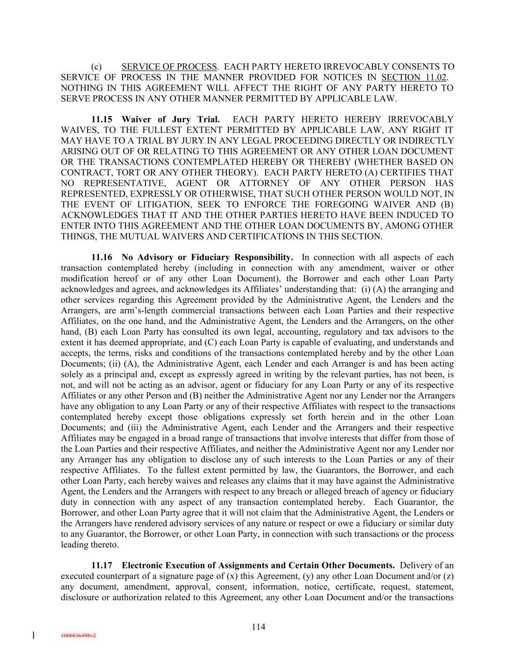 (c) SERVICE OF PROCESS. EACH PARTY HERETO IRREVOCABLY CONSENTS TO SERVICE OF PROCESS IN THE MANNER PROVIDED FOR NOTICES IN SECTION 11.02. NOTHING IN THIS AGREEMENT WILL AFFECT THE RIGHT OF ANY PARTY HERETO TO SERVE PROCESS IN ANY OTHER MANNER PERMITTED BY APPLICABLE LAW. 11.15 Waiver of Jury Trial. EACH PARTY HERETO HEREBY IRREVOCABLY WAIVES, TO THE FULLEST EXTENT PERMITTED BY APPLICABLE LAW, ANY RIGHT IT MAY HAVE TO A TRIAL BY JURY IN ANY LEGAL PROCEEDING DIRECTLY OR INDIRECTLY ARISING OUT OF OR RELATING TO THIS AGREEMENT OR ANY OTHER LOAN DOCUMENT OR THE TRANSACTIONS CONTEMPLATED HEREBY OR THEREBY (WHETHER BASED ON CONTRACT, TORT OR ANY OTHER THEORY). EACH PARTY HERETO (A) CERTIFIES THAT NO REPRESENTATIVE, AGENT OR ATTORNEY OF ANY OTHER PERSON HAS REPRESENTED, EXPRESSLY OR OTHERWISE, THAT SUCH OTHER PERSON WOULD NOT, IN THE EVENT OF LITIGATION, SEEK TO ENFORCE THE FOREGOING WAIVER AND (B) ACKNOWLEDGES THAT IT AND THE OTHER PARTIES HERETO HAVE BEEN INDUCED TO ENTER INTO THIS AGREEMENT AND THE OTHER LOAN DOCUMENTS BY, AMONG OTHER THINGS, THE MUTUAL WAIVERS AND CERTIFICATIONS IN THIS SECTION. 11.16 No Advisory or Fiduciary Responsibility. In connection with all aspects of each transaction contemplated hereby (including in connection with any amendment, waiver or other modification hereof or of any other Loan Document), the Borrower and each other Loan Party acknowledges and agrees, and acknowledges its Affiliates’ understanding that: (i) (A) the arranging and other services regarding this Agreement provided by the Administrative Agent, the Lenders and the Arrangers, are arm’s-length commercial transactions between each Loan Parties and their respective Affiliates, on the one hand, and the Administrative Agent, the Lenders and the Arrangers, on the other hand, (B) each Loan Party has consulted its own legal, accounting, regulatory and tax advisors to the extent it has deemed appropriate, and (C) each Loan Party is capable of evaluating, and understands and accepts, the terms, risks and conditions of the transactions contemplated hereby and by the other Loan Documents; (ii) (A), the Administrative Agent, each Lender and each Arranger is and has been acting solely as a principal and, except as expressly agreed in writing by the relevant parties, has not been, is not, and will not be acting as an advisor, agent or fiduciary for any Loan Party or any of its respective Affiliates or any other Person and (B) neither the Administrative Agent nor any Lender nor the Arrangers have any obligation to any Loan Party or any of their respective Affiliates with respect to the transactions contemplated hereby except those obligations expressly set forth herein and in the other Loan Documents; and (iii) the Administrative Agent, each Lender and the Arrangers and their respective Affiliates may be engaged in a broad range of transactions that involve interests that differ from those of the Loan Parties and their respective Affiliates, and neither the Administrative Agent nor any Lender nor any Arranger has any obligation to disclose any of such interests to the Loan Parties or any of their respective Affiliates. To the fullest extent permitted by law, the Guarantors, the Borrower, and each other Loan Party, each hereby waives and releases any claims that it may have against the Administrative Agent, the Lenders and the Arrangers with respect to any breach or alleged breach of agency or fiduciary duty in connection with any aspect of any transaction contemplated hereby. Each Guarantor, the Borrower, and other Loan Party agree that it will not claim that the Administrative Agent, the Lenders or the Arrangers have rendered advisory services of any nature or respect or owe a fiduciary or similar duty to any Guarantor, the Borrower, or other Loan Party, in connection with such transactions or the process leading thereto. 11.17 Electronic Execution of Assignments and Certain Other Documents. Delivery of an executed counterpart of a signature page of (x) this Agreement, (y) any other Loan Document and/or (z) any document, amendment, approval, consent, information, notice, certificate, request, statement, disclosure or authorization related to this Agreement, any other Loan Document and/or the transactions 114 1006836498v2