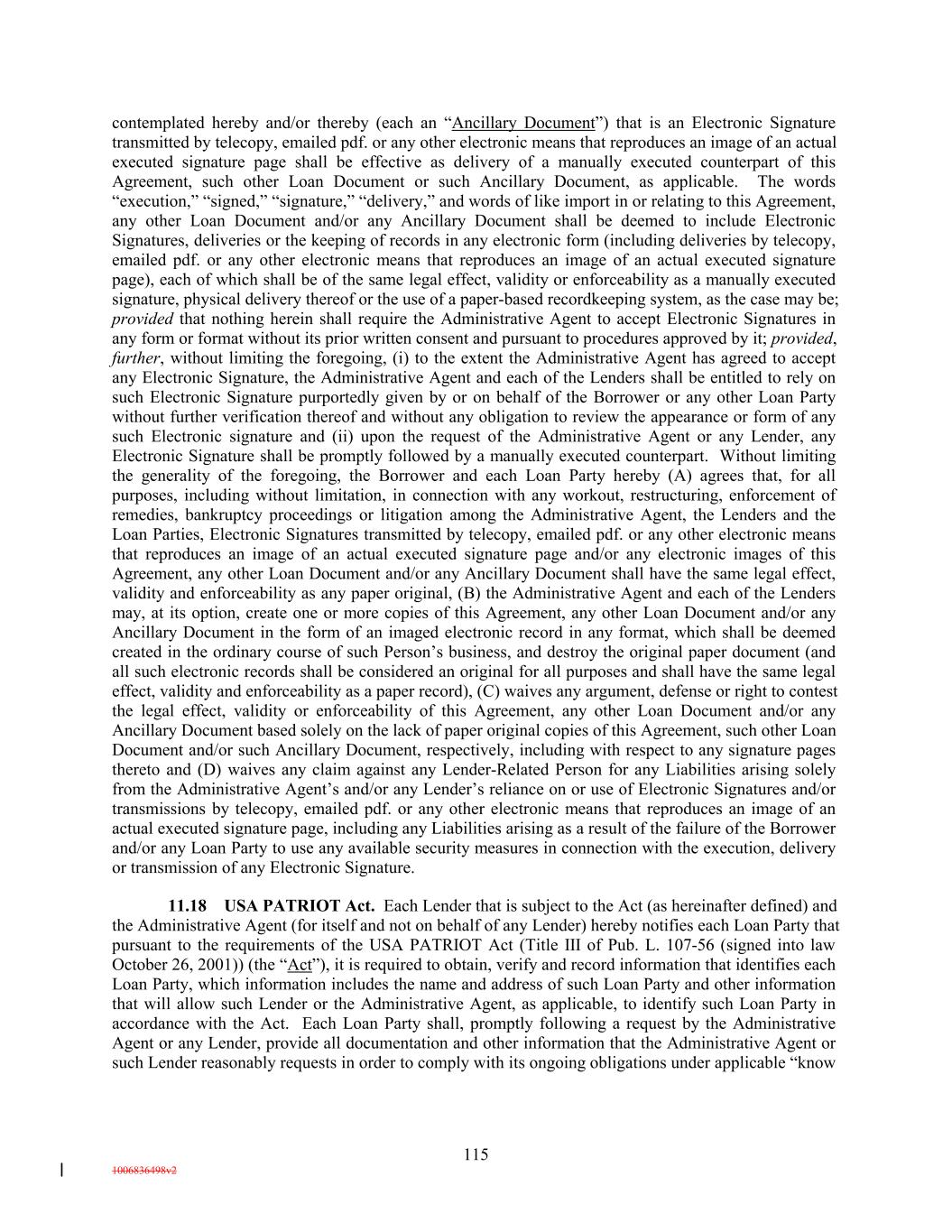contemplated hereby and/or thereby (each an “Ancillary Document”) that is an Electronic Signature transmitted by telecopy, emailed pdf. or any other electronic means that reproduces an image of an actual executed signature page shall be effective as delivery of a manually executed counterpart of this Agreement, such other Loan Document or such Ancillary Document, as applicable. The words “execution,” “signed,” “signature,” “delivery,” and words of like import in or relating to this Agreement, any other Loan Document and/or any Ancillary Document shall be deemed to include Electronic Signatures, deliveries or the keeping of records in any electronic form (including deliveries by telecopy, emailed pdf. or any other electronic means that reproduces an image of an actual executed signature page), each of which shall be of the same legal effect, validity or enforceability as a manually executed signature, physical delivery thereof or the use of a paper-based recordkeeping system, as the case may be; provided that nothing herein shall require the Administrative Agent to accept Electronic Signatures in any form or format without its prior written consent and pursuant to procedures approved by it; provided, further, without limiting the foregoing, (i) to the extent the Administrative Agent has agreed to accept any Electronic Signature, the Administrative Agent and each of the Lenders shall be entitled to rely on such Electronic Signature purportedly given by or on behalf of the Borrower or any other Loan Party without further verification thereof and without any obligation to review the appearance or form of any such Electronic signature and (ii) upon the request of the Administrative Agent or any Lender, any Electronic Signature shall be promptly followed by a manually executed counterpart. Without limiting the generality of the foregoing, the Borrower and each Loan Party hereby (A) agrees that, for all purposes, including without limitation, in connection with any workout, restructuring, enforcement of remedies, bankruptcy proceedings or litigation among the Administrative Agent, the Lenders and the Loan Parties, Electronic Signatures transmitted by telecopy, emailed pdf. or any other electronic means that reproduces an image of an actual executed signature page and/or any electronic images of this Agreement, any other Loan Document and/or any Ancillary Document shall have the same legal effect, validity and enforceability as any paper original, (B) the Administrative Agent and each of the Lenders may, at its option, create one or more copies of this Agreement, any other Loan Document and/or any Ancillary Document in the form of an imaged electronic record in any format, which shall be deemed created in the ordinary course of such Person’s business, and destroy the original paper document (and all such electronic records shall be considered an original for all purposes and shall have the same legal effect, validity and enforceability as a paper record), (C) waives any argument, defense or right to contest the legal effect, validity or enforceability of this Agreement, any other Loan Document and/or any Ancillary Document based solely on the lack of paper original copies of this Agreement, such other Loan Document and/or such Ancillary Document, respectively, including with respect to any signature pages thereto and (D) waives any claim against any Lender-Related Person for any Liabilities arising solely from the Administrative Agent’s and/or any Lender’s reliance on or use of Electronic Signatures and/or transmissions by telecopy, emailed pdf. or any other electronic means that reproduces an image of an actual executed signature page, including any Liabilities arising as a result of the failure of the Borrower and/or any Loan Party to use any available security measures in connection with the execution, delivery or transmission of any Electronic Signature. 11.18 USA PATRIOT Act. Each Lender that is subject to the Act (as hereinafter defined) and the Administrative Agent (for itself and not on behalf of any Lender) hereby notifies each Loan Party that pursuant to the requirements of the USA PATRIOT Act (Title III of Pub. L. 107-56 (signed into law October 26, 2001)) (the “Act”), it is required to obtain, verify and record information that identifies each Loan Party, which information includes the name and address of such Loan Party and other information that will allow such Lender or the Administrative Agent, as applicable, to identify such Loan Party in accordance with the Act. Each Loan Party shall, promptly following a request by the Administrative Agent or any Lender, provide all documentation and other information that the Administrative Agent or such Lender reasonably requests in order to comply with its ongoing obligations under applicable “know 115 1006836498v2