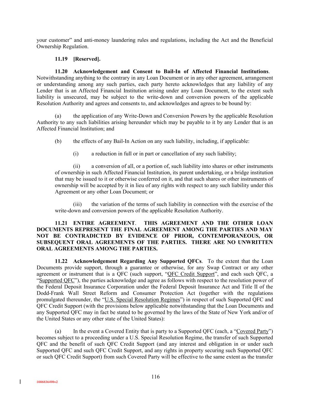 your customer” and anti-money laundering rules and regulations, including the Act and the Beneficial Ownership Regulation. 11.19 [Reserved]. 11.20 Acknowledgement and Consent to Bail-In of Affected Financial Institutions. Notwithstanding anything to the contrary in any Loan Document or in any other agreement, arrangement or understanding among any such parties, each party hereto acknowledges that any liability of any Lender that is an Affected Financial Institution arising under any Loan Document, to the extent such liability is unsecured, may be subject to the write-down and conversion powers of the applicable Resolution Authority and agrees and consents to, and acknowledges and agrees to be bound by: (a) the application of any Write-Down and Conversion Powers by the applicable Resolution Authority to any such liabilities arising hereunder which may be payable to it by any Lender that is an Affected Financial Institution; and (b) the effects of any Bail-In Action on any such liability, including, if applicable: (i) a reduction in full or in part or cancellation of any such liability; (ii) a conversion of all, or a portion of, such liability into shares or other instruments of ownership in such Affected Financial Institution, its parent undertaking, or a bridge institution that may be issued to it or otherwise conferred on it, and that such shares or other instruments of ownership will be accepted by it in lieu of any rights with respect to any such liability under this Agreement or any other Loan Document; or (iii) the variation of the terms of such liability in connection with the exercise of the write-down and conversion powers of the applicable Resolution Authority. 11.21 ENTIRE AGREEMENT. THIS AGREEMENT AND THE OTHER LOAN DOCUMENTS REPRESENT THE FINAL AGREEMENT AMONG THE PARTIES AND MAY NOT BE CONTRADICTED BY EVIDENCE OF PRIOR, CONTEMPORANEOUS, OR SUBSEQUENT ORAL AGREEMENTS OF THE PARTIES. THERE ARE NO UNWRITTEN ORAL AGREEMENTS AMONG THE PARTIES. 11.22 Acknowledgement Regarding Any Supported QFCs. To the extent that the Loan Documents provide support, through a guarantee or otherwise, for any Swap Contract or any other agreement or instrument that is a QFC (such support, “QFC Credit Support”, and each such QFC, a “Supported QFC”), the parties acknowledge and agree as follows with respect to the resolution power of the Federal Deposit Insurance Corporation under the Federal Deposit Insurance Act and Title II of the Dodd-Frank Wall Street Reform and Consumer Protection Act (together with the regulations promulgated thereunder, the “U.S. Special Resolution Regimes”) in respect of such Supported QFC and QFC Credit Support (with the provisions below applicable notwithstanding that the Loan Documents and any Supported QFC may in fact be stated to be governed by the laws of the State of New York and/or of the United States or any other state of the United States): (a) In the event a Covered Entity that is party to a Supported QFC (each, a “Covered Party”) becomes subject to a proceeding under a U.S. Special Resolution Regime, the transfer of such Supported QFC and the benefit of such QFC Credit Support (and any interest and obligation in or under such Supported QFC and such QFC Credit Support, and any rights in property securing such Supported QFC or such QFC Credit Support) from such Covered Party will be effective to the same extent as the transfer 116 1006836498v2