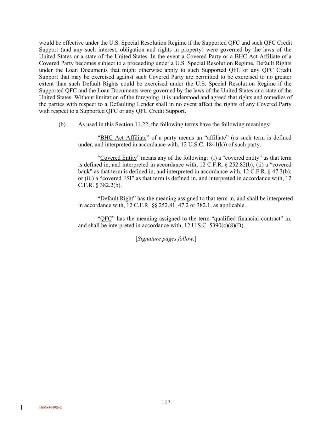 would be effective under the U.S. Special Resolution Regime if the Supported QFC and such QFC Credit Support (and any such interest, obligation and rights in property) were governed by the laws of the United States or a state of the United States. In the event a Covered Party or a BHC Act Affiliate of a Covered Party becomes subject to a proceeding under a U.S. Special Resolution Regime, Default Rights under the Loan Documents that might otherwise apply to such Supported QFC or any QFC Credit Support that may be exercised against such Covered Party are permitted to be exercised to no greater extent than such Default Rights could be exercised under the U.S. Special Resolution Regime if the Supported QFC and the Loan Documents were governed by the laws of the United States or a state of the United States. Without limitation of the foregoing, it is understood and agreed that rights and remedies of the parties with respect to a Defaulting Lender shall in no event affect the rights of any Covered Party with respect to a Supported QFC or any QFC Credit Support. (b) As used in this Section 11.22, the following terms have the following meanings: “BHC Act Affiliate” of a party means an “affiliate” (as such term is defined under, and interpreted in accordance with, 12 U.S.C. 1841(k)) of such party. “Covered Entity” means any of the following: (i) a “covered entity” as that term is defined in, and interpreted in accordance with, 12 C.F.R. § 252.82(b); (ii) a “covered bank” as that term is defined in, and interpreted in accordance with, 12 C.F.R. § 47.3(b); or (iii) a “covered FSI” as that term is defined in, and interpreted in accordance with, 12 C.F.R. § 382.2(b). “Default Right” has the meaning assigned to that term in, and shall be interpreted in accordance with, 12 C.F.R. §§ 252.81, 47.2 or 382.1, as applicable. “QFC” has the meaning assigned to the term “qualified financial contract” in, and shall be interpreted in accordance with, 12 U.S.C. 5390(c)(8)(D). [Signature pages follow.] 117 1006836498v2