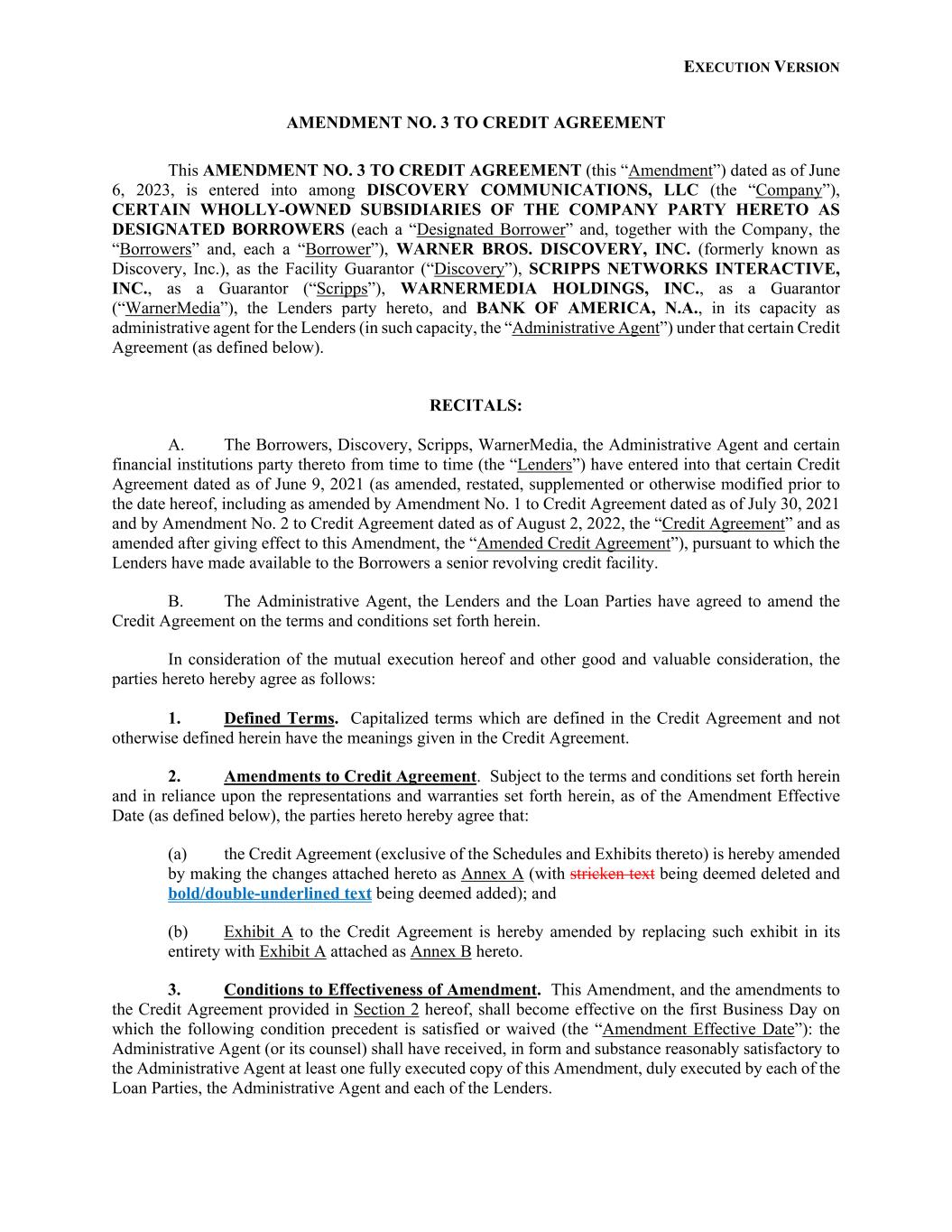 EXECUTION VERSION AMENDMENT NO. 3 TO CREDIT AGREEMENT This AMENDMENT NO. 3 TO CREDIT AGREEMENT (this “Amendment”) dated as of June 6, 2023, is entered into among DISCOVERY COMMUNICATIONS, LLC (the “Company”), CERTAIN WHOLLY-OWNED SUBSIDIARIES OF THE COMPANY PARTY HERETO AS DESIGNATED BORROWERS (each a “Designated Borrower” and, together with the Company, the “Borrowers” and, each a “Borrower”), WARNER BROS. DISCOVERY, INC. (formerly known as Discovery, Inc.), as the Facility Guarantor (“Discovery”), SCRIPPS NETWORKS INTERACTIVE, INC., as a Guarantor (“Scripps”), WARNERMEDIA HOLDINGS, INC., as a Guarantor (“WarnerMedia”), the Lenders party hereto, and BANK OF AMERICA, N.A., in its capacity as administrative agent for the Lenders (in such capacity, the “Administrative Agent”) under that certain Credit Agreement (as defined below). RECITALS: A. The Borrowers, Discovery, Scripps, WarnerMedia, the Administrative Agent and certain financial institutions party thereto from time to time (the “Lenders”) have entered into that certain Credit Agreement dated as of June 9, 2021 (as amended, restated, supplemented or otherwise modified prior to the date hereof, including as amended by Amendment No. 1 to Credit Agreement dated as of July 30, 2021 and by Amendment No. 2 to Credit Agreement dated as of August 2, 2022, the “Credit Agreement” and as amended after giving effect to this Amendment, the “Amended Credit Agreement”), pursuant to which the Lenders have made available to the Borrowers a senior revolving credit facility. B. The Administrative Agent, the Lenders and the Loan Parties have agreed to amend the Credit Agreement on the terms and conditions set forth herein. In consideration of the mutual execution hereof and other good and valuable consideration, the parties hereto hereby agree as follows: 1. Defined Terms. Capitalized terms which are defined in the Credit Agreement and not otherwise defined herein have the meanings given in the Credit Agreement. 2. Amendments to Credit Agreement. Subject to the terms and conditions set forth herein and in reliance upon the representations and warranties set forth herein, as of the Amendment Effective Date (as defined below), the parties hereto hereby agree that: (a) the Credit Agreement (exclusive of the Schedules and Exhibits thereto) is hereby amended by making the changes attached hereto as Annex A (with stricken text being deemed deleted and bold/double-underlined text being deemed added); and (b) Exhibit A to the Credit Agreement is hereby amended by replacing such exhibit in its entirety with Exhibit A attached as Annex B hereto. 3. Conditions to Effectiveness of Amendment. This Amendment, and the amendments to the Credit Agreement provided in Section 2 hereof, shall become effective on the first Business Day on which the following condition precedent is satisfied or waived (the “Amendment Effective Date”): the Administrative Agent (or its counsel) shall have received, in form and substance reasonably satisfactory to the Administrative Agent at least one fully executed copy of this Amendment, duly executed by each of the Loan Parties, the Administrative Agent and each of the Lenders.