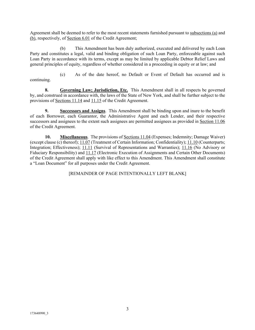 3 173648990_3 Agreement shall be deemed to refer to the most recent statements furnished pursuant to subsections (a) and (b), respectively, of Section 6.01 of the Credit Agreement; (b) This Amendment has been duly authorized, executed and delivered by each Loan Party and constitutes a legal, valid and binding obligation of such Loan Party, enforceable against such Loan Party in accordance with its terms, except as may be limited by applicable Debtor Relief Laws and general principles of equity, regardless of whether considered in a proceeding in equity or at law; and (c) As of the date hereof, no Default or Event of Default has occurred and is continuing. 8. Governing Law; Jurisdiction, Etc. This Amendment shall in all respects be governed by, and construed in accordance with, the laws of the State of New York, and shall be further subject to the provisions of Sections 11.14 and 11.15 of the Credit Agreement. 9. Successors and Assigns. This Amendment shall be binding upon and inure to the benefit of each Borrower, each Guarantor, the Administrative Agent and each Lender, and their respective successors and assignees to the extent such assignees are permitted assignees as provided in Section 11.06 of the Credit Agreement. 10. Miscellaneous. The provisions of Sections 11.04 (Expenses; Indemnity; Damage Waiver) (except clause (c) thereof); 11.07 (Treatment of Certain Information; Confidentiality); 11.10 (Counterparts; Integration; Effectiveness); 11.11 (Survival of Representations and Warranties); 11.16 (No Advisory or Fiduciary Responsibility) and 11.17 (Electronic Execution of Assignments and Certain Other Documents) of the Credit Agreement shall apply with like effect to this Amendment. This Amendment shall constitute a “Loan Document” for all purposes under the Credit Agreement. [REMAINDER OF PAGE INTENTIONALLY LEFT BLANK]