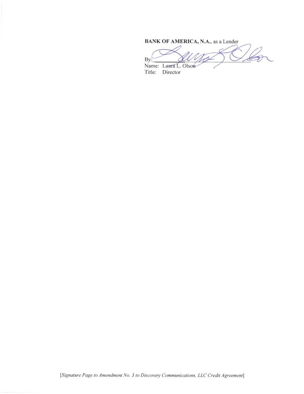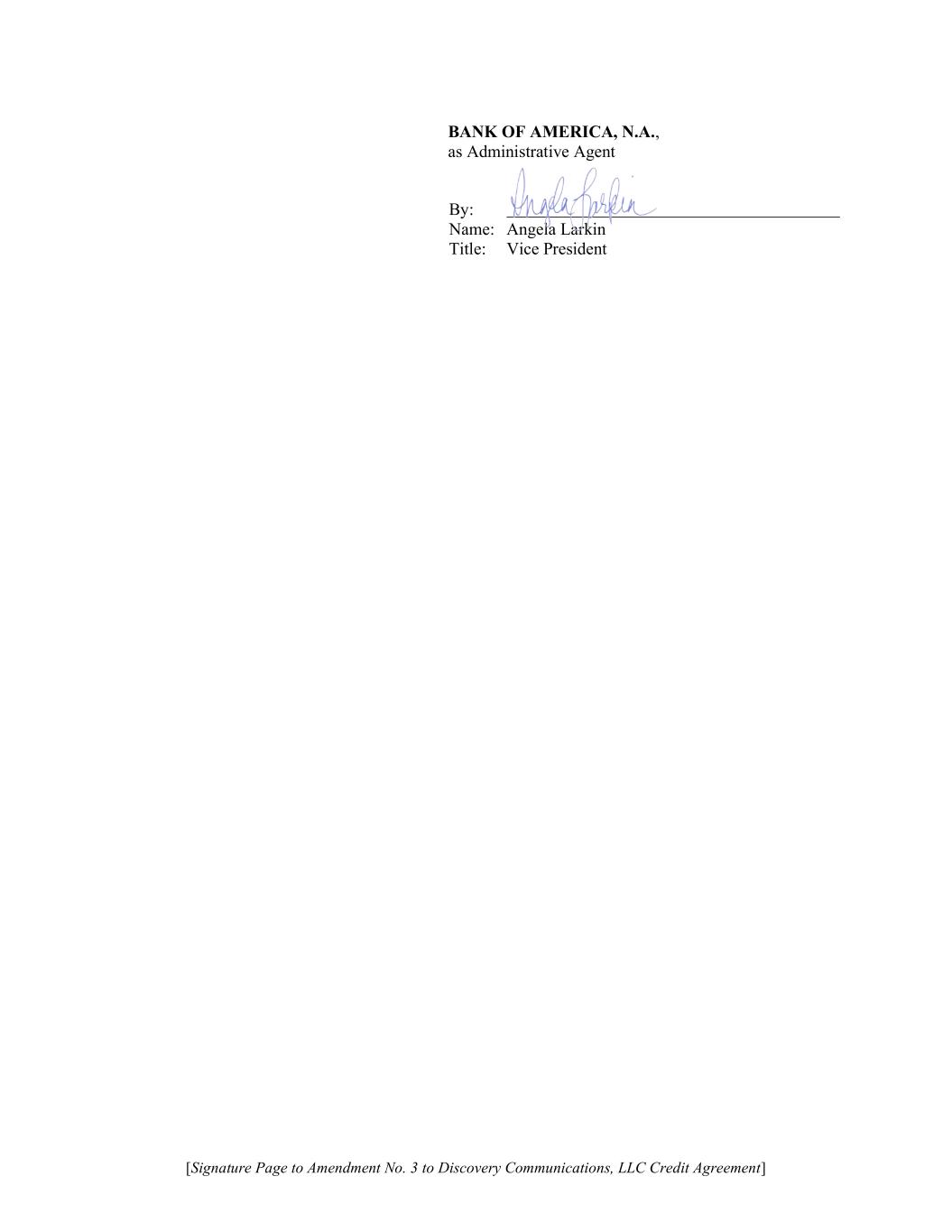 [Signature Page to Amendment No. 3 to Discovery Communications, LLC Credit Agreement] BANK OF AMERICA, N.A., as Administrative Agent By: Name: Angela Larkin Title: Vice President
