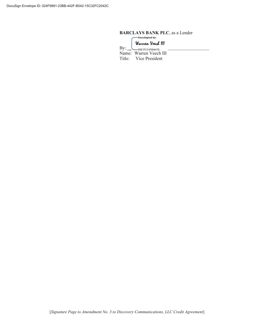 [Signature Page to Amendment No. 3 to Discovery Communications, LLC Credit Agreement] BARCLAYS BANK PLC, as a Lender By: ___________ Name: Warren Veech III Title: Vice President DocuSign Envelope ID: 024F9991-23BB-442F-B542-15C32FC2042C