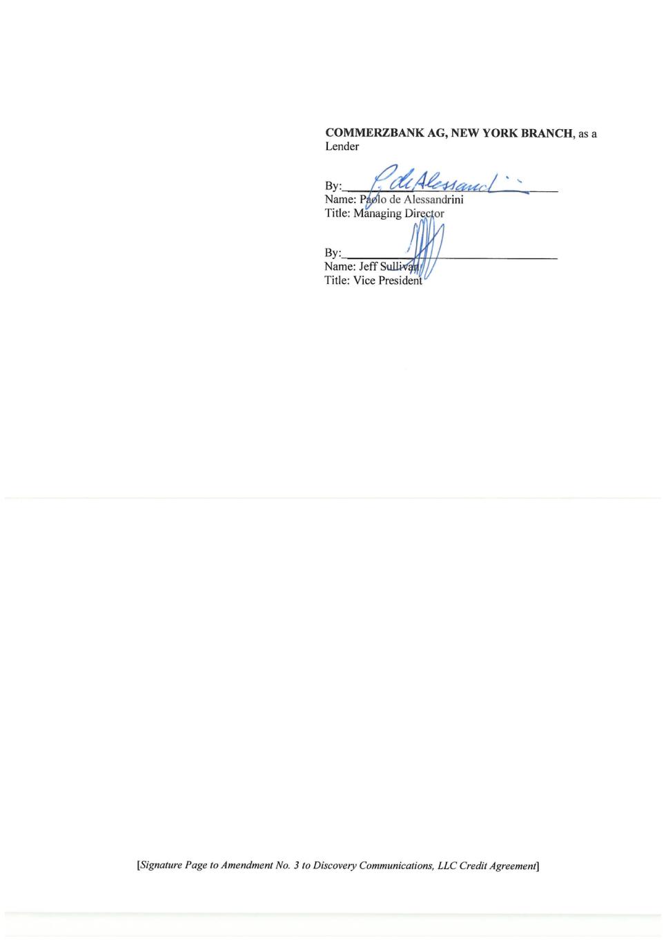 [Signature Page to Amendment No. 3 to Discovery Communications, LLC Credit Agreement] JPMORGAN CHASE BANK, N.A., as a Lender By: ___________ Name: Ryan Zimmerman Title: Executive Director