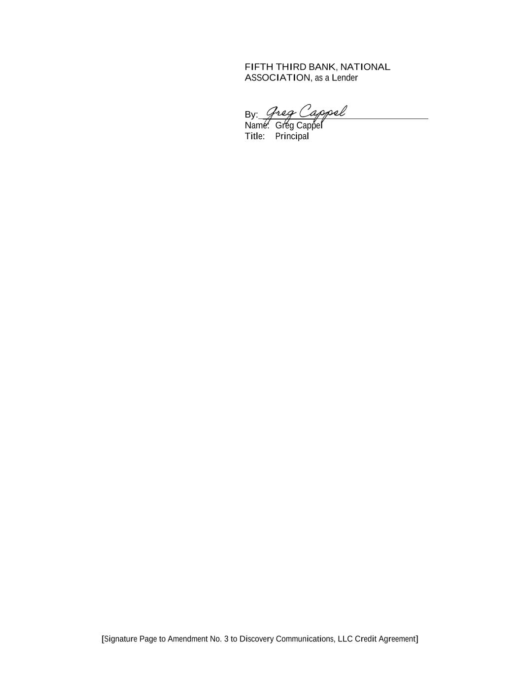 [Signature Page to Amendment No. 3 to Discovery Communications, LLC Credit Agreement] FIFTH THIRD BANK, NATIONAL ASSOCIATION, as a Lender By: ___________ Name: Greg Cappel Title: Principal