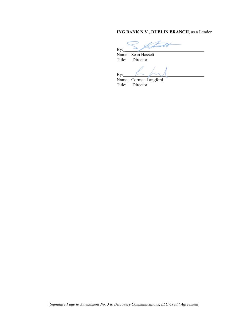 [Signature Page to Amendment No. 3 to Discovery Communications, LLC Credit Agreement] ING BANK N.V., DUBLIN BRANCH, as a Lender By: ___________ Name: Sean Hassett Title: Director By: ___________ Name: Cormac Langford Title: Director