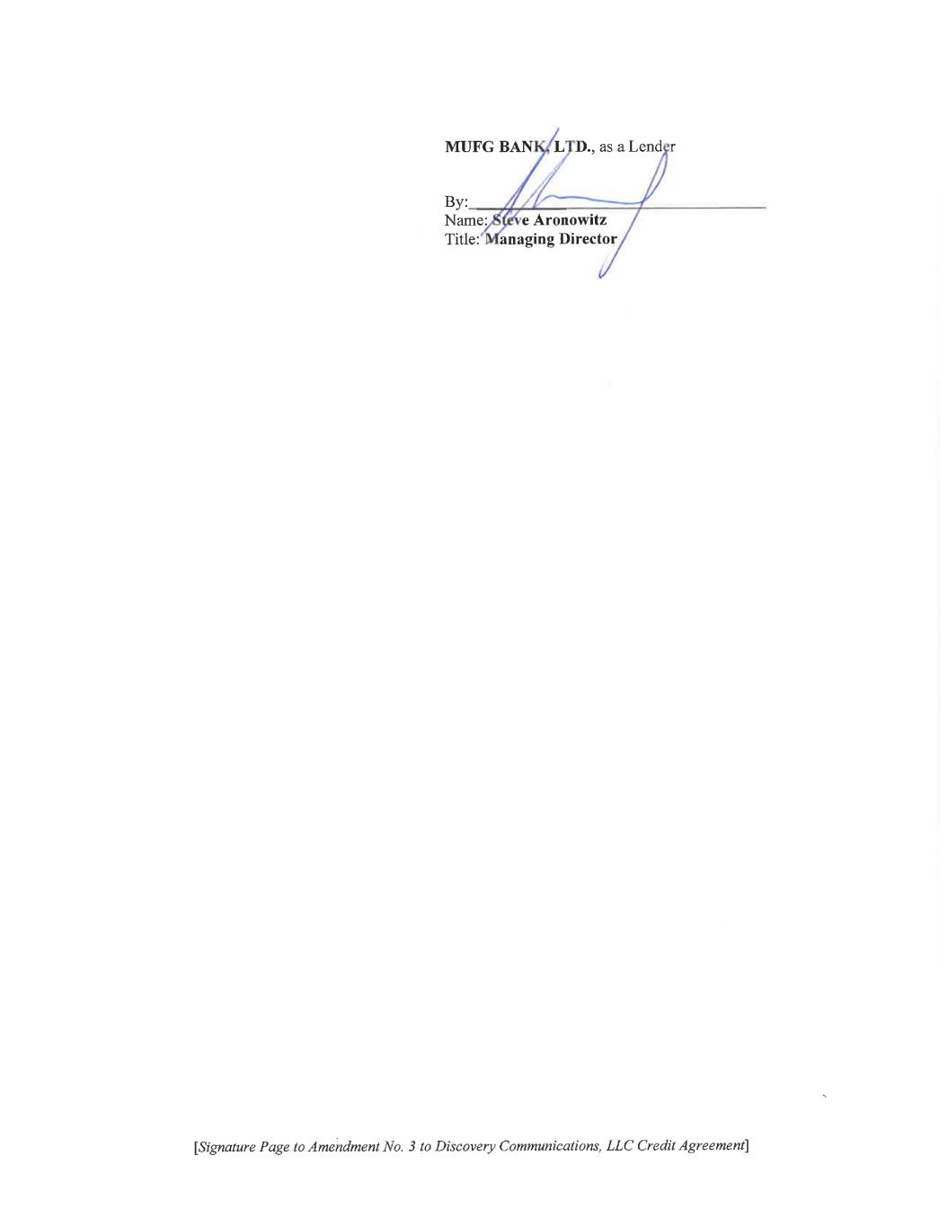 [Signature Page to Amendment No. 3 to Discovery Communications, LLC Credit Agreement] MIZUHO BANK, LTD., as a Lender By: ___________ Name: Tracy Rahn Title: Executive Director