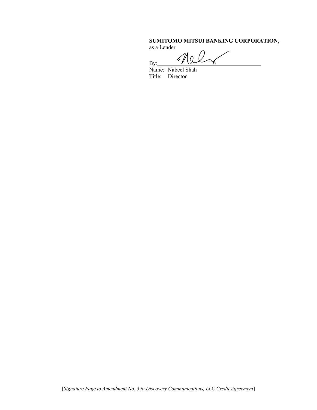 [Signature Page to Amendment No. 3 to Discovery Communications, LLC Credit Agreement] SUMITOMO MITSUI BANKING CORPORATION, as a Lender By:___________ Name: Nabeel Shah Title: Director