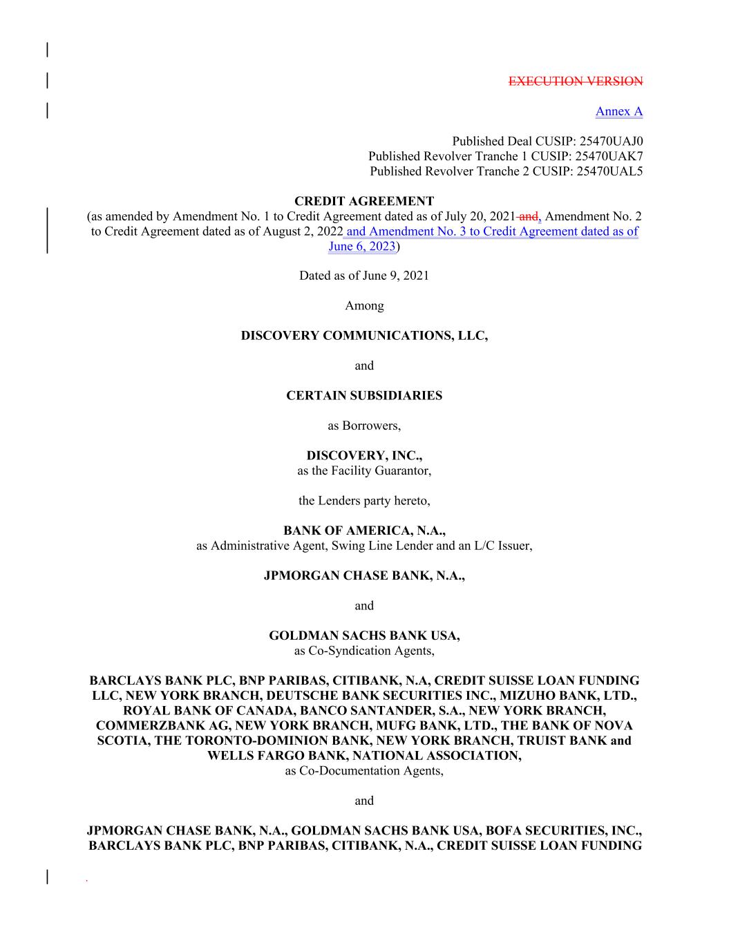 EXECUTION VERSION Annex A Published Deal CUSIP: 25470UAJ0 Published Revolver Tranche 1 CUSIP: 25470UAK7 Published Revolver Tranche 2 CUSIP: 25470UAL5 CREDIT AGREEMENT (as amended by Amendment No. 1 to Credit Agreement dated as of July 20, 2021 and, Amendment No. 2 to Credit Agreement dated as of August 2, 2022 and Amendment No. 3 to Credit Agreement dated as of June 6, 2023) Dated as of June 9, 2021 Among DISCOVERY COMMUNICATIONS, LLC, and CERTAIN SUBSIDIARIES as Borrowers, DISCOVERY, INC., as the Facility Guarantor, the Lenders party hereto, BANK OF AMERICA, N.A., as Administrative Agent, Swing Line Lender and an L/C Issuer, JPMORGAN CHASE BANK, N.A., and GOLDMAN SACHS BANK USA, as Co-Syndication Agents, BARCLAYS BANK PLC, BNP PARIBAS, CITIBANK, N.A, CREDIT SUISSE LOAN FUNDING LLC, NEW YORK BRANCH, DEUTSCHE BANK SECURITIES INC., MIZUHO BANK, LTD., ROYAL BANK OF CANADA, BANCO SANTANDER, S.A., NEW YORK BRANCH, COMMERZBANK AG, NEW YORK BRANCH, MUFG BANK, LTD., THE BANK OF NOVA SCOTIA, THE TORONTO-DOMINION BANK, NEW YORK BRANCH, TRUIST BANK and WELLS FARGO BANK, NATIONAL ASSOCIATION, as Co-Documentation Agents, and JPMORGAN CHASE BANK, N.A., GOLDMAN SACHS BANK USA, BOFA SECURITIES, INC., BARCLAYS BANK PLC, BNP PARIBAS, CITIBANK, N.A., CREDIT SUISSE LOAN FUNDING .