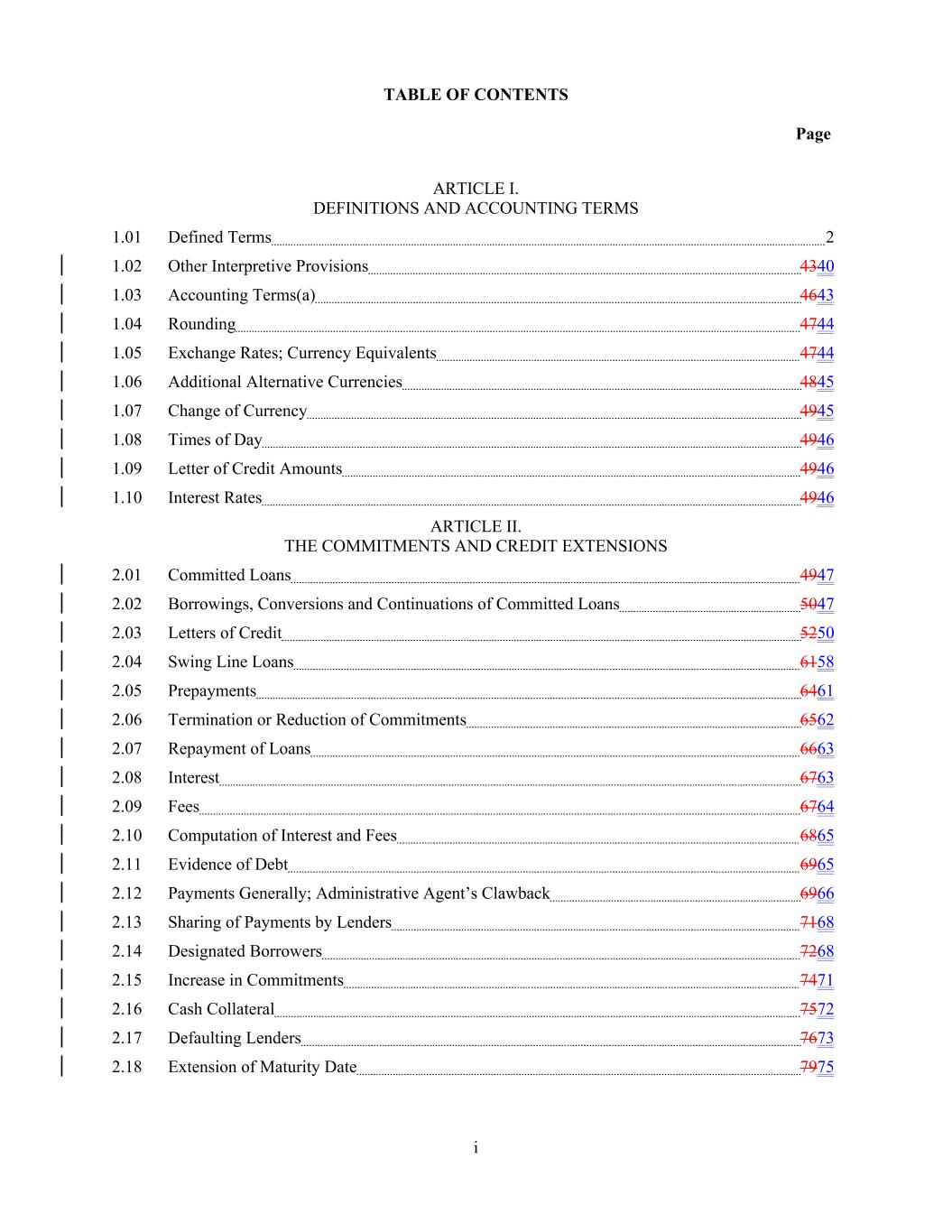 TABLE OF CONTENTS Page ARTICLE I. DEFINITIONS AND ACCOUNTING TERMS 1.01 Defined Terms 2 1.02 Other Interpretive Provisions 4340 1.03 Accounting Terms(a) 4643 1.04 Rounding 4744 1.05 Exchange Rates; Currency Equivalents 4744 1.06 Additional Alternative Currencies 4845 1.07 Change of Currency 4945 1.08 Times of Day 4946 1.09 Letter of Credit Amounts 4946 1.10 Interest Rates 4946 ARTICLE II. THE COMMITMENTS AND CREDIT EXTENSIONS 2.01 Committed Loans 4947 2.02 Borrowings, Conversions and Continuations of Committed Loans 5047 2.03 Letters of Credit 5250 2.04 Swing Line Loans 6158 2.05 Prepayments 6461 2.06 Termination or Reduction of Commitments 6562 2.07 Repayment of Loans 6663 2.08 Interest 6763 2.09 Fees 6764 2.10 Computation of Interest and Fees 6865 2.11 Evidence of Debt 6965 2.12 Payments Generally; Administrative Agent’s Clawback 6966 2.13 Sharing of Payments by Lenders 7168 2.14 Designated Borrowers 7268 2.15 Increase in Commitments 7471 2.16 Cash Collateral 7572 2.17 Defaulting Lenders 7673 2.18 Extension of Maturity Date 7975 i