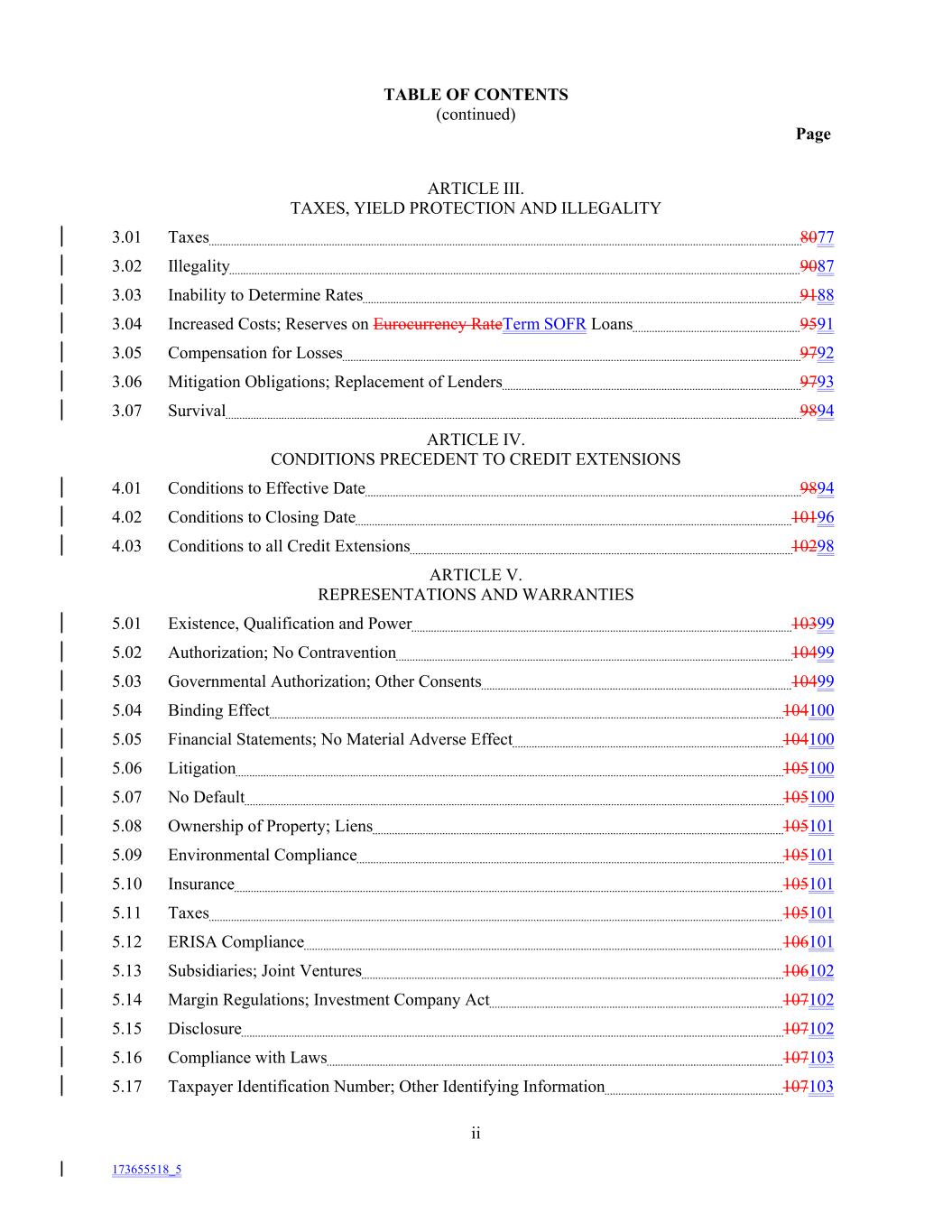 TABLE OF CONTENTS (continued) Page ARTICLE III. TAXES, YIELD PROTECTION AND ILLEGALITY 3.01 Taxes 8077 3.02 Illegality 9087 3.03 Inability to Determine Rates 9188 3.04 Increased Costs; Reserves on Eurocurrency RateTerm SOFR Loans 9591 3.05 Compensation for Losses 9792 3.06 Mitigation Obligations; Replacement of Lenders 9793 3.07 Survival 9894 ARTICLE IV. CONDITIONS PRECEDENT TO CREDIT EXTENSIONS 4.01 Conditions to Effective Date 9894 4.02 Conditions to Closing Date 10196 4.03 Conditions to all Credit Extensions 10298 ARTICLE V. REPRESENTATIONS AND WARRANTIES 5.01 Existence, Qualification and Power 10399 5.02 Authorization; No Contravention 10499 5.03 Governmental Authorization; Other Consents 10499 5.04 Binding Effect 104100 5.05 Financial Statements; No Material Adverse Effect 104100 5.06 Litigation 105100 5.07 No Default 105100 5.08 Ownership of Property; Liens 105101 5.09 Environmental Compliance 105101 5.10 Insurance 105101 5.11 Taxes 105101 5.12 ERISA Compliance 106101 5.13 Subsidiaries; Joint Ventures 106102 5.14 Margin Regulations; Investment Company Act 107102 5.15 Disclosure 107102 5.16 Compliance with Laws 107103 5.17 Taxpayer Identification Number; Other Identifying Information 107103 ii 173655518_5