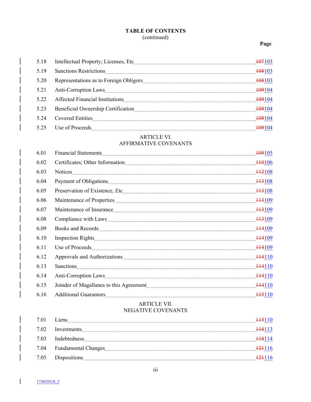 TABLE OF CONTENTS (continued) Page 5.18 Intellectual Property; Licenses, Etc 107103 5.19 Sanctions Restrictions 108103 5.20 Representations as to Foreign Obligors 108103 5.21 Anti-Corruption Laws 109104 5.22 Affected Financial Institutions 109104 5.23 Beneficial Ownership Certification 109104 5.24 Covered Entities 109104 5.25 Use of Proceeds 109104 ARTICLE VI. AFFIRMATIVE COVENANTS 6.01 Financial Statements 109105 6.02 Certificates; Other Information 110106 6.03 Notices 112108 6.04 Payment of Obligations 113108 6.05 Preservation of Existence, Etc 113108 6.06 Maintenance of Properties 113109 6.07 Maintenance of Insurance 113109 6.08 Compliance with Laws 113109 6.09 Books and Records 114109 6.10 Inspection Rights 114109 6.11 Use of Proceeds 114109 6.12 Approvals and Authorizations 114110 6.13 Sanctions 114110 6.14 Anti-Corruption Laws 114110 6.15 Joinder of Magallanes to this Agreement 114110 6.16 Additional Guarantors 115110 ARTICLE VII. NEGATIVE COVENANTS 7.01 Liens 115110 7.02 Investments 118113 7.03 Indebtedness 118114 7.04 Fundamental Changes 121116 7.05 Dispositions 121116 iii 173655518_5