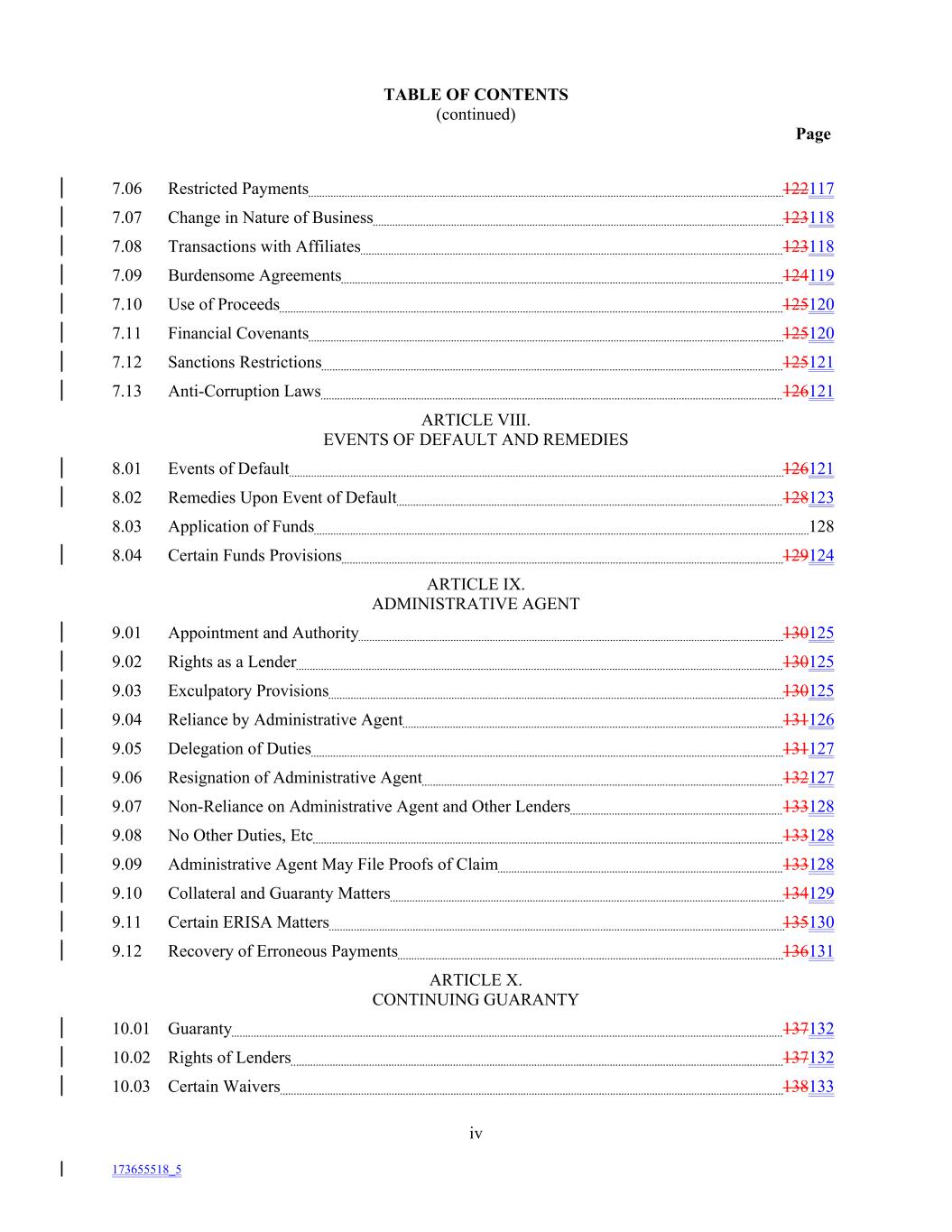 TABLE OF CONTENTS (continued) Page 7.06 Restricted Payments 122117 7.07 Change in Nature of Business 123118 7.08 Transactions with Affiliates 123118 7.09 Burdensome Agreements 124119 7.10 Use of Proceeds 125120 7.11 Financial Covenants 125120 7.12 Sanctions Restrictions 125121 7.13 Anti-Corruption Laws 126121 ARTICLE VIII. EVENTS OF DEFAULT AND REMEDIES 8.01 Events of Default 126121 8.02 Remedies Upon Event of Default 128123 8.03 Application of Funds 128 8.04 Certain Funds Provisions 129124 ARTICLE IX. ADMINISTRATIVE AGENT 9.01 Appointment and Authority 130125 9.02 Rights as a Lender 130125 9.03 Exculpatory Provisions 130125 9.04 Reliance by Administrative Agent 131126 9.05 Delegation of Duties 131127 9.06 Resignation of Administrative Agent 132127 9.07 Non-Reliance on Administrative Agent and Other Lenders 133128 9.08 No Other Duties, Etc 133128 9.09 Administrative Agent May File Proofs of Claim 133128 9.10 Collateral and Guaranty Matters 134129 9.11 Certain ERISA Matters 135130 9.12 Recovery of Erroneous Payments 136131 ARTICLE X. CONTINUING GUARANTY 10.01 Guaranty 137132 10.02 Rights of Lenders 137132 10.03 Certain Waivers 138133 iv 173655518_5