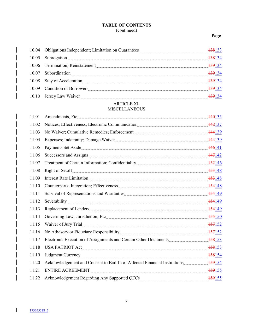 TABLE OF CONTENTS (continued) Page 10.04 Obligations Independent; Limitation on Guarantees 138133 10.05 Subrogation 138134 10.06 Termination; Reinstatement 139134 10.07 Subordination 139134 10.08 Stay of Acceleration 139134 10.09 Condition of Borrowers 139134 10.10 Jersey Law Waiver 139134 ARTICLE XI. MISCELLANEOUS 11.01 Amendments, Etc 140135 11.02 Notices; Effectiveness; Electronic Communication 142137 11.03 No Waiver; Cumulative Remedies; Enforcement 144139 11.04 Expenses; Indemnity; Damage Waiver 144139 11.05 Payments Set Aside 146141 11.06 Successors and Assigns 147142 11.07 Treatment of Certain Information; Confidentiality 152146 11.08 Right of Setoff 153148 11.09 Interest Rate Limitation 153148 11.10 Counterparts; Integration; Effectiveness 154148 11.11 Survival of Representations and Warranties 154149 11.12 Severability 154149 11.13 Replacement of Lenders 154149 11.14 Governing Law; Jurisdiction; Etc 155150 11.15 Waiver of Jury Trial 157152 11.16 No Advisory or Fiduciary Responsibility 157152 11.17 Electronic Execution of Assignments and Certain Other Documents 158153 11.18 USA PATRIOT Act 158153 11.19 Judgment Currency 158154 11.20 Acknowledgement and Consent to Bail-In of Affected Financial Institutions 159154 11.21 ENTIRE AGREEMENT 159155 11.22 Acknowledgement Regarding Any Supported QFCs 159155 v 173655518_5