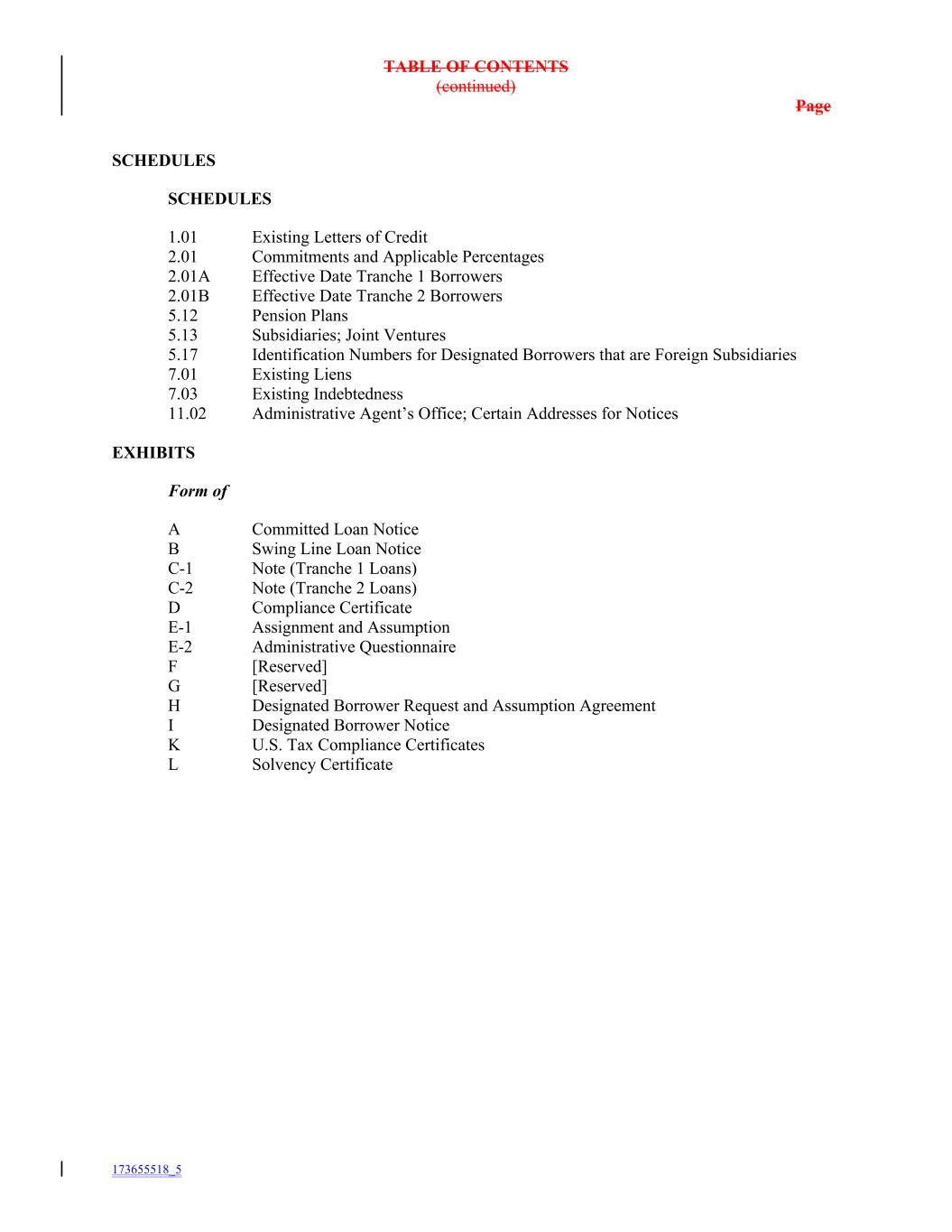 TABLE OF CONTENTS (continued) Page SCHEDULES SCHEDULES 1.01 Existing Letters of Credit 2.01 Commitments and Applicable Percentages 2.01A Effective Date Tranche 1 Borrowers 2.01B Effective Date Tranche 2 Borrowers 5.12 Pension Plans 5.13 Subsidiaries; Joint Ventures 5.17 Identification Numbers for Designated Borrowers that are Foreign Subsidiaries 7.01 Existing Liens 7.03 Existing Indebtedness 11.02 Administrative Agent’s Office; Certain Addresses for Notices EXHIBITS Form of A Committed Loan Notice B Swing Line Loan Notice C-1 Note (Tranche 1 Loans) C-2 Note (Tranche 2 Loans) D Compliance Certificate E-1 Assignment and Assumption E-2 Administrative Questionnaire F [Reserved] G [Reserved] H Designated Borrower Request and Assumption Agreement I Designated Borrower Notice K U.S. Tax Compliance Certificates L Solvency Certificate 173655518_5