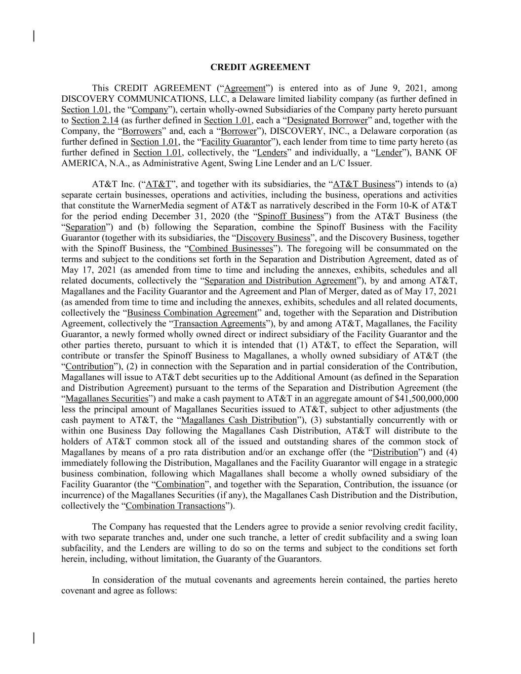 CREDIT AGREEMENT This CREDIT AGREEMENT (“Agreement”) is entered into as of June 9, 2021, among DISCOVERY COMMUNICATIONS, LLC, a Delaware limited liability company (as further defined in Section 1.01, the “Company”), certain wholly-owned Subsidiaries of the Company party hereto pursuant to Section 2.14 (as further defined in Section 1.01, each a “Designated Borrower” and, together with the Company, the “Borrowers” and, each a “Borrower”), DISCOVERY, INC., a Delaware corporation (as further defined in Section 1.01, the “Facility Guarantor”), each lender from time to time party hereto (as further defined in Section 1.01, collectively, the “Lenders” and individually, a “Lender”), BANK OF AMERICA, N.A., as Administrative Agent, Swing Line Lender and an L/C Issuer. AT&T Inc. (“AT&T”, and together with its subsidiaries, the “AT&T Business”) intends to (a) separate certain businesses, operations and activities, including the business, operations and activities that constitute the WarnerMedia segment of AT&T as narratively described in the Form 10-K of AT&T for the period ending December 31, 2020 (the “Spinoff Business”) from the AT&T Business (the “Separation”) and (b) following the Separation, combine the Spinoff Business with the Facility Guarantor (together with its subsidiaries, the “Discovery Business”, and the Discovery Business, together with the Spinoff Business, the “Combined Businesses”). The foregoing will be consummated on the terms and subject to the conditions set forth in the Separation and Distribution Agreement, dated as of May 17, 2021 (as amended from time to time and including the annexes, exhibits, schedules and all related documents, collectively the “Separation and Distribution Agreement”), by and among AT&T, Magallanes and the Facility Guarantor and the Agreement and Plan of Merger, dated as of May 17, 2021 (as amended from time to time and including the annexes, exhibits, schedules and all related documents, collectively the “Business Combination Agreement” and, together with the Separation and Distribution Agreement, collectively the “Transaction Agreements”), by and among AT&T, Magallanes, the Facility Guarantor, a newly formed wholly owned direct or indirect subsidiary of the Facility Guarantor and the other parties thereto, pursuant to which it is intended that (1) AT&T, to effect the Separation, will contribute or transfer the Spinoff Business to Magallanes, a wholly owned subsidiary of AT&T (the “Contribution”), (2) in connection with the Separation and in partial consideration of the Contribution, Magallanes will issue to AT&T debt securities up to the Additional Amount (as defined in the Separation and Distribution Agreement) pursuant to the terms of the Separation and Distribution Agreement (the “Magallanes Securities”) and make a cash payment to AT&T in an aggregate amount of $41,500,000,000 less the principal amount of Magallanes Securities issued to AT&T, subject to other adjustments (the cash payment to AT&T, the “Magallanes Cash Distribution”), (3) substantially concurrently with or within one Business Day following the Magallanes Cash Distribution, AT&T will distribute to the holders of AT&T common stock all of the issued and outstanding shares of the common stock of Magallanes by means of a pro rata distribution and/or an exchange offer (the “Distribution”) and (4) immediately following the Distribution, Magallanes and the Facility Guarantor will engage in a strategic business combination, following which Magallanes shall become a wholly owned subsidiary of the Facility Guarantor (the “Combination”, and together with the Separation, Contribution, the issuance (or incurrence) of the Magallanes Securities (if any), the Magallanes Cash Distribution and the Distribution, collectively the “Combination Transactions”). The Company has requested that the Lenders agree to provide a senior revolving credit facility, with two separate tranches and, under one such tranche, a letter of credit subfacility and a swing loan subfacility, and the Lenders are willing to do so on the terms and subject to the conditions set forth herein, including, without limitation, the Guaranty of the Guarantors. In consideration of the mutual covenants and agreements herein contained, the parties hereto covenant and agree as follows: