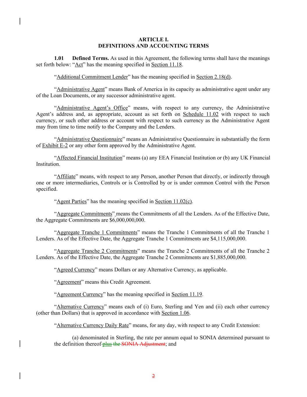 ARTICLE I. DEFINITIONS AND ACCOUNTING TERMS 1.01 Defined Terms. As used in this Agreement, the following terms shall have the meanings set forth below: “Act” has the meaning specified in Section 11.18. “Additional Commitment Lender” has the meaning specified in Section 2.18(d). “Administrative Agent” means Bank of America in its capacity as administrative agent under any of the Loan Documents, or any successor administrative agent. “Administrative Agent’s Office” means, with respect to any currency, the Administrative Agent’s address and, as appropriate, account as set forth on Schedule 11.02 with respect to such currency, or such other address or account with respect to such currency as the Administrative Agent may from time to time notify to the Company and the Lenders. “Administrative Questionnaire” means an Administrative Questionnaire in substantially the form of Exhibit E-2 or any other form approved by the Administrative Agent. “Affected Financial Institution” means (a) any EEA Financial Institution or (b) any UK Financial Institution. “Affiliate” means, with respect to any Person, another Person that directly, or indirectly through one or more intermediaries, Controls or is Controlled by or is under common Control with the Person specified. “Agent Parties” has the meaning specified in Section 11.02(c). “Aggregate Commitments” means the Commitments of all the Lenders. As of the Effective Date, the Aggregate Commitments are $6,000,000,000. “Aggregate Tranche 1 Commitments” means the Tranche 1 Commitments of all the Tranche 1 Lenders. As of the Effective Date, the Aggregate Tranche 1 Commitments are $4,115,000,000. “Aggregate Tranche 2 Commitments” means the Tranche 2 Commitments of all the Tranche 2 Lenders. As of the Effective Date, the Aggregate Tranche 2 Commitments are $1,885,000,000. “Agreed Currency” means Dollars or any Alternative Currency, as applicable. “Agreement” means this Credit Agreement. “Agreement Currency” has the meaning specified in Section 11.19. “Alternative Currency” means each of (i) Euro, Sterling and Yen and (ii) each other currency (other than Dollars) that is approved in accordance with Section 1.06. “Alternative Currency Daily Rate” means, for any day, with respect to any Credit Extension: (a) denominated in Sterling, the rate per annum equal to SONIA determined pursuant to the definition thereof plus the SONIA Adjustment; and 2