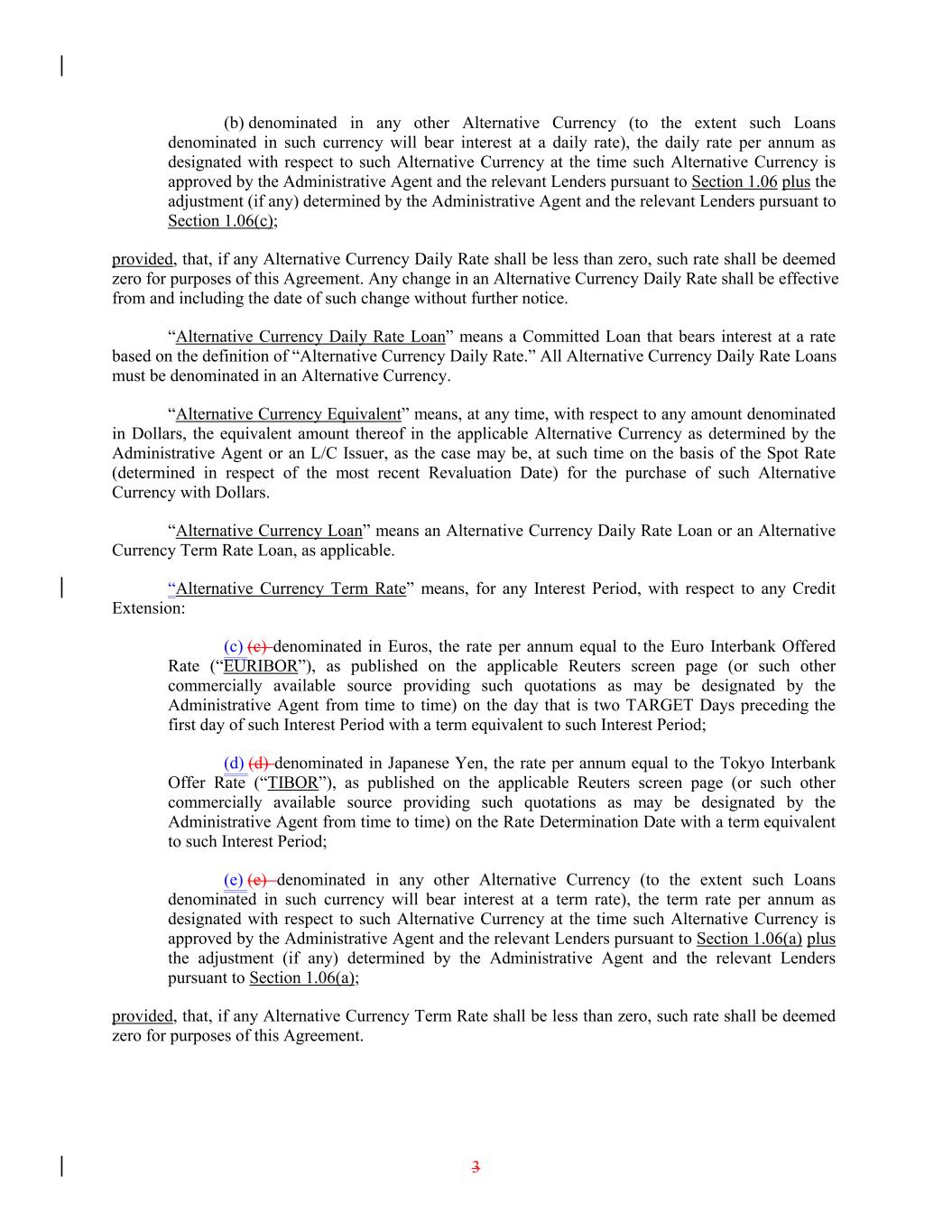 (b) denominated in any other Alternative Currency (to the extent such Loans denominated in such currency will bear interest at a daily rate), the daily rate per annum as designated with respect to such Alternative Currency at the time such Alternative Currency is approved by the Administrative Agent and the relevant Lenders pursuant to Section 1.06 plus the adjustment (if any) determined by the Administrative Agent and the relevant Lenders pursuant to Section 1.06(c); provided, that, if any Alternative Currency Daily Rate shall be less than zero, such rate shall be deemed zero for purposes of this Agreement. Any change in an Alternative Currency Daily Rate shall be effective from and including the date of such change without further notice. “Alternative Currency Daily Rate Loan” means a Committed Loan that bears interest at a rate based on the definition of “Alternative Currency Daily Rate.” All Alternative Currency Daily Rate Loans must be denominated in an Alternative Currency. “Alternative Currency Equivalent” means, at any time, with respect to any amount denominated in Dollars, the equivalent amount thereof in the applicable Alternative Currency as determined by the Administrative Agent or an L/C Issuer, as the case may be, at such time on the basis of the Spot Rate (determined in respect of the most recent Revaluation Date) for the purchase of such Alternative Currency with Dollars. “Alternative Currency Loan” means an Alternative Currency Daily Rate Loan or an Alternative Currency Term Rate Loan, as applicable. “Alternative Currency Term Rate” means, for any Interest Period, with respect to any Credit Extension: (c) (c) denominated in Euros, the rate per annum equal to the Euro Interbank Offered Rate (“EURIBOR”), as published on the applicable Reuters screen page (or such other commercially available source providing such quotations as may be designated by the Administrative Agent from time to time) on the day that is two TARGET Days preceding the first day of such Interest Period with a term equivalent to such Interest Period; (d) (d) denominated in Japanese Yen, the rate per annum equal to the Tokyo Interbank Offer Rate (“TIBOR”), as published on the applicable Reuters screen page (or such other commercially available source providing such quotations as may be designated by the Administrative Agent from time to time) on the Rate Determination Date with a term equivalent to such Interest Period; (e) (e) denominated in any other Alternative Currency (to the extent such Loans denominated in such currency will bear interest at a term rate), the term rate per annum as designated with respect to such Alternative Currency at the time such Alternative Currency is approved by the Administrative Agent and the relevant Lenders pursuant to Section 1.06(a) plus the adjustment (if any) determined by the Administrative Agent and the relevant Lenders pursuant to Section 1.06(a); provided, that, if any Alternative Currency Term Rate shall be less than zero, such rate shall be deemed zero for purposes of this Agreement. 3