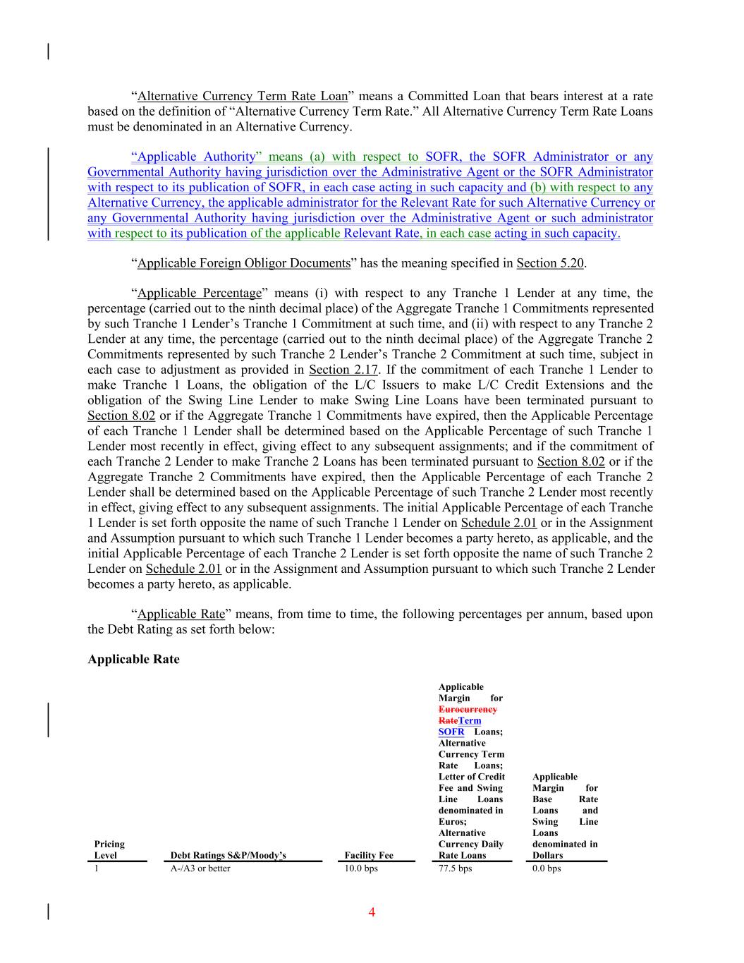4 Applicable Margin for Base Rate Loans and Swing Line Loans denominated in DollarsDebt Ratings S&P/Moody’s 1 A-/A3 or better Facility Fee Pricing Level 10.0 bps 77.5 bps Applicable Margin for Eurocurrency RateTerm SOFR Loans; Alternative Currency Term Rate Loans; Letter of Credit Fee and Swing Line Loans denominated in Euros; Alternative Currency Daily Rate Loans 0.0 bps “Alternative Currency Term Rate Loan” means a Committed Loan that bears interest at a rate based on the definition of “Alternative Currency Term Rate.” All Alternative Currency Term Rate Loans must be denominated in an Alternative Currency. “Applicable Authority” means (a) with respect to SOFR, the SOFR Administrator or any Governmental Authority having jurisdiction over the Administrative Agent or the SOFR Administrator with respect to its publication of SOFR, in each case acting in such capacity and (b) with respect to any Alternative Currency, the applicable administrator for the Relevant Rate for such Alternative Currency or any Governmental Authority having jurisdiction over the Administrative Agent or such administrator with respect to its publication of the applicable Relevant Rate, in each case acting in such capacity. “Applicable Foreign Obligor Documents” has the meaning specified in Section 5.20. “Applicable Percentage” means (i) with respect to any Tranche 1 Lender at any time, the percentage (carried out to the ninth decimal place) of the Aggregate Tranche 1 Commitments represented by such Tranche 1 Lender’s Tranche 1 Commitment at such time, and (ii) with respect to any Tranche 2 Lender at any time, the percentage (carried out to the ninth decimal place) of the Aggregate Tranche 2 Commitments represented by such Tranche 2 Lender’s Tranche 2 Commitment at such time, subject in each case to adjustment as provided in Section 2.17. If the commitment of each Tranche 1 Lender to make Tranche 1 Loans, the obligation of the L/C Issuers to make L/C Credit Extensions and the obligation of the Swing Line Lender to make Swing Line Loans have been terminated pursuant to Section 8.02 or if the Aggregate Tranche 1 Commitments have expired, then the Applicable Percentage of each Tranche 1 Lender shall be determined based on the Applicable Percentage of such Tranche 1 Lender most recently in effect, giving effect to any subsequent assignments; and if the commitment of each Tranche 2 Lender to make Tranche 2 Loans has been terminated pursuant to Section 8.02 or if the Aggregate Tranche 2 Commitments have expired, then the Applicable Percentage of each Tranche 2 Lender shall be determined based on the Applicable Percentage of such Tranche 2 Lender most recently in effect, giving effect to any subsequent assignments. The initial Applicable Percentage of each Tranche 1 Lender is set forth opposite the name of such Tranche 1 Lender on Schedule 2.01 or in the Assignment and Assumption pursuant to which such Tranche 1 Lender becomes a party hereto, as applicable, and the initial Applicable Percentage of each Tranche 2 Lender is set forth opposite the name of such Tranche 2 Lender on Schedule 2.01 or in the Assignment and Assumption pursuant to which such Tranche 2 Lender becomes a party hereto, as applicable. “Applicable Rate” means, from time to time, the following percentages per annum, based upon the Debt Rating as set forth below: Applicable Rate