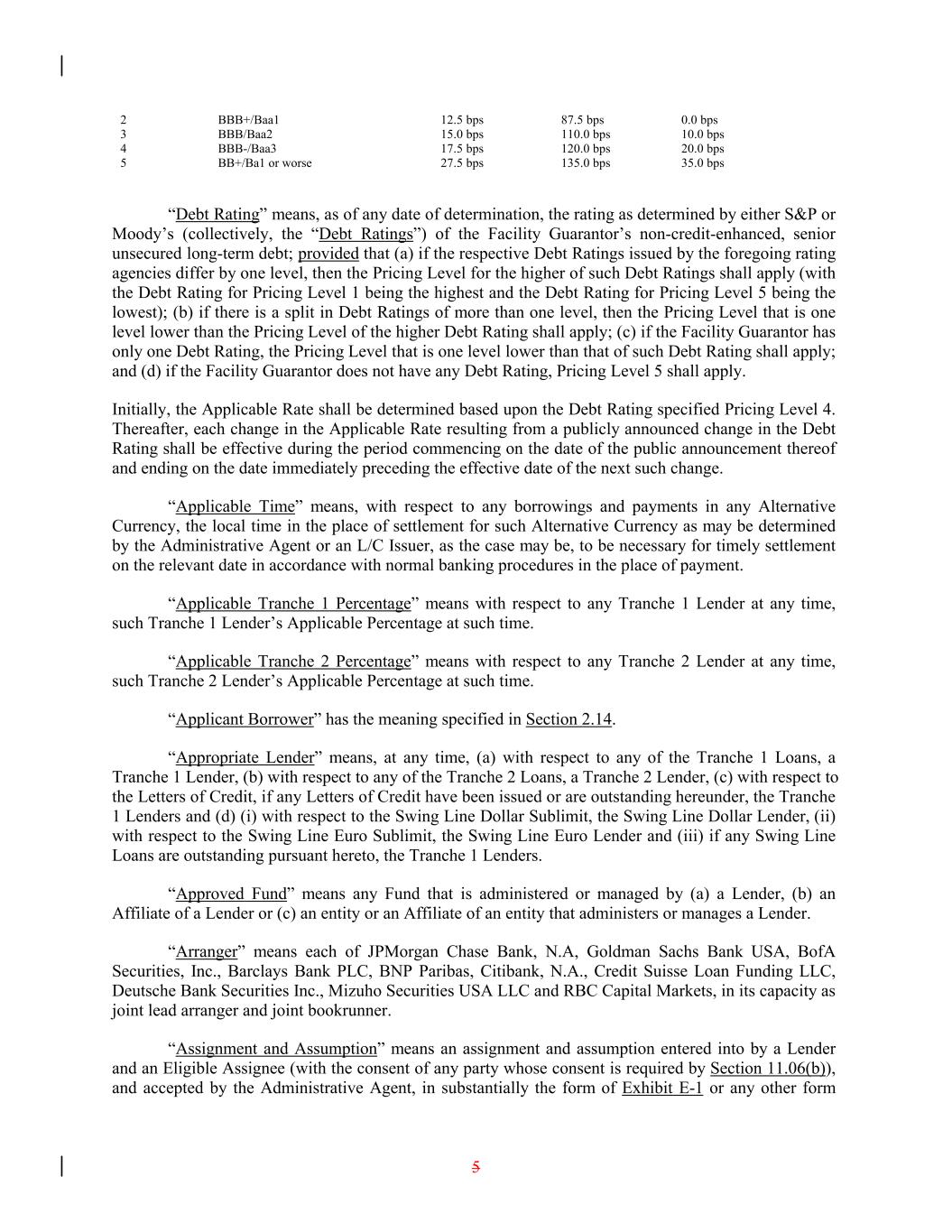 5 3 17.5 bps 2 120.0 bps 12.5 bps BBB/Baa2 20.0 bps 5 15.0 bps BB+/Ba1 or worse 27.5 bps 87.5 bps 110.0 bps 135.0 bps 35.0 bps 10.0 bps BBB+/Baa1 0.0 bps 4 BBB-/Baa3 “Debt Rating” means, as of any date of determination, the rating as determined by either S&P or Moody’s (collectively, the “Debt Ratings”) of the Facility Guarantor’s non-credit-enhanced, senior unsecured long-term debt; provided that (a) if the respective Debt Ratings issued by the foregoing rating agencies differ by one level, then the Pricing Level for the higher of such Debt Ratings shall apply (with the Debt Rating for Pricing Level 1 being the highest and the Debt Rating for Pricing Level 5 being the lowest); (b) if there is a split in Debt Ratings of more than one level, then the Pricing Level that is one level lower than the Pricing Level of the higher Debt Rating shall apply; (c) if the Facility Guarantor has only one Debt Rating, the Pricing Level that is one level lower than that of such Debt Rating shall apply; and (d) if the Facility Guarantor does not have any Debt Rating, Pricing Level 5 shall apply. Initially, the Applicable Rate shall be determined based upon the Debt Rating specified Pricing Level 4. Thereafter, each change in the Applicable Rate resulting from a publicly announced change in the Debt Rating shall be effective during the period commencing on the date of the public announcement thereof and ending on the date immediately preceding the effective date of the next such change. “Applicable Time” means, with respect to any borrowings and payments in any Alternative Currency, the local time in the place of settlement for such Alternative Currency as may be determined by the Administrative Agent or an L/C Issuer, as the case may be, to be necessary for timely settlement on the relevant date in accordance with normal banking procedures in the place of payment. “Applicable Tranche 1 Percentage” means with respect to any Tranche 1 Lender at any time, such Tranche 1 Lender’s Applicable Percentage at such time. “Applicable Tranche 2 Percentage” means with respect to any Tranche 2 Lender at any time, such Tranche 2 Lender’s Applicable Percentage at such time. “Applicant Borrower” has the meaning specified in Section 2.14. “Appropriate Lender” means, at any time, (a) with respect to any of the Tranche 1 Loans, a Tranche 1 Lender, (b) with respect to any of the Tranche 2 Loans, a Tranche 2 Lender, (c) with respect to the Letters of Credit, if any Letters of Credit have been issued or are outstanding hereunder, the Tranche 1 Lenders and (d) (i) with respect to the Swing Line Dollar Sublimit, the Swing Line Dollar Lender, (ii) with respect to the Swing Line Euro Sublimit, the Swing Line Euro Lender and (iii) if any Swing Line Loans are outstanding pursuant hereto, the Tranche 1 Lenders. “Approved Fund” means any Fund that is administered or managed by (a) a Lender, (b) an Affiliate of a Lender or (c) an entity or an Affiliate of an entity that administers or manages a Lender. “Arranger” means each of JPMorgan Chase Bank, N.A, Goldman Sachs Bank USA, BofA Securities, Inc., Barclays Bank PLC, BNP Paribas, Citibank, N.A., Credit Suisse Loan Funding LLC, Deutsche Bank Securities Inc., Mizuho Securities USA LLC and RBC Capital Markets, in its capacity as joint lead arranger and joint bookrunner. “Assignment and Assumption” means an assignment and assumption entered into by a Lender and an Eligible Assignee (with the consent of any party whose consent is required by Section 11.06(b)), and accepted by the Administrative Agent, in substantially the form of Exhibit E-1 or any other form