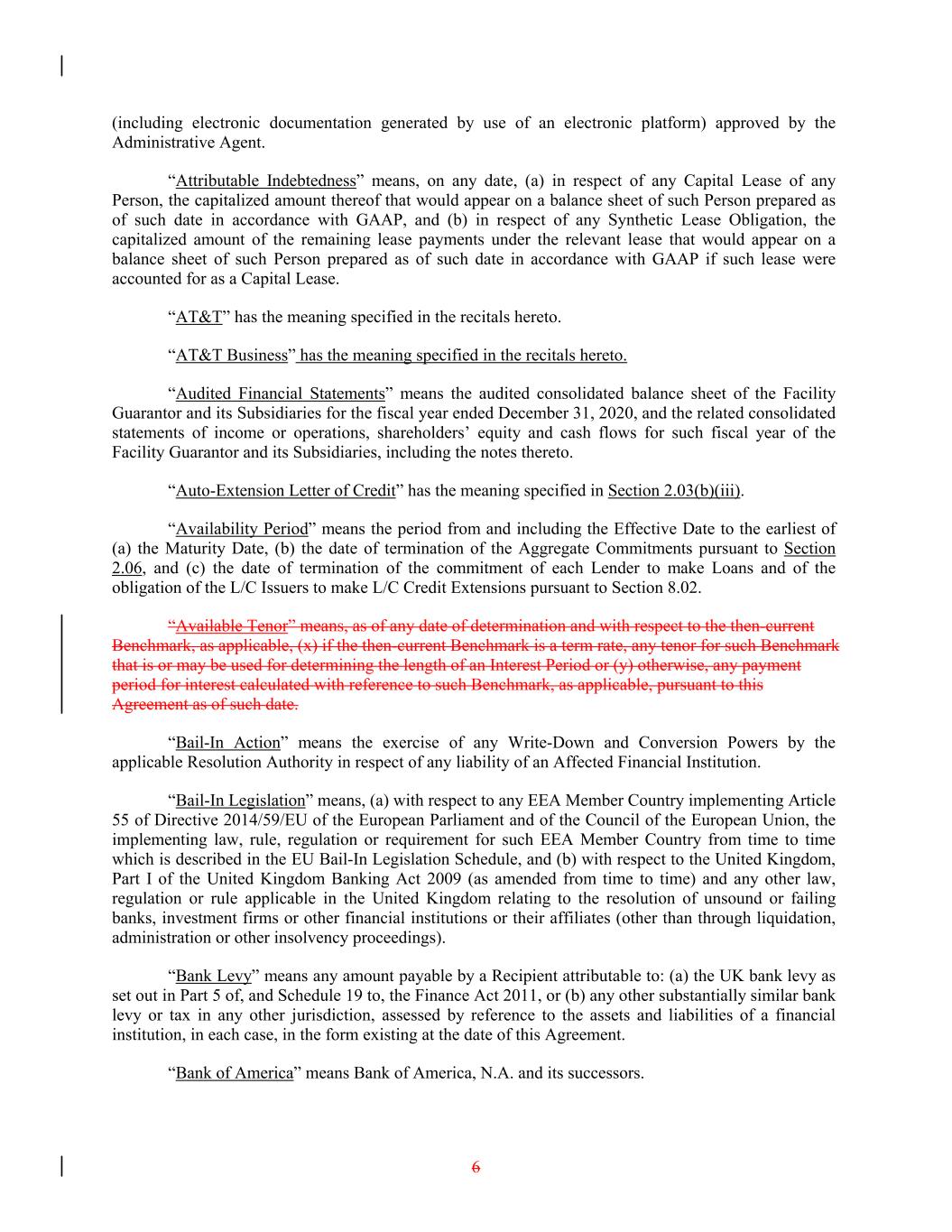 (including electronic documentation generated by use of an electronic platform) approved by the Administrative Agent. “Attributable Indebtedness” means, on any date, (a) in respect of any Capital Lease of any Person, the capitalized amount thereof that would appear on a balance sheet of such Person prepared as of such date in accordance with GAAP, and (b) in respect of any Synthetic Lease Obligation, the capitalized amount of the remaining lease payments under the relevant lease that would appear on a balance sheet of such Person prepared as of such date in accordance with GAAP if such lease were accounted for as a Capital Lease. “AT&T” has the meaning specified in the recitals hereto. “AT&T Business” has the meaning specified in the recitals hereto. “Audited Financial Statements” means the audited consolidated balance sheet of the Facility Guarantor and its Subsidiaries for the fiscal year ended December 31, 2020, and the related consolidated statements of income or operations, shareholders’ equity and cash flows for such fiscal year of the Facility Guarantor and its Subsidiaries, including the notes thereto. “Auto-Extension Letter of Credit” has the meaning specified in Section 2.03(b)(iii). “Availability Period” means the period from and including the Effective Date to the earliest of (a) the Maturity Date, (b) the date of termination of the Aggregate Commitments pursuant to Section 2.06, and (c) the date of termination of the commitment of each Lender to make Loans and of the obligation of the L/C Issuers to make L/C Credit Extensions pursuant to Section 8.02. “Available Tenor” means, as of any date of determination and with respect to the then-current Benchmark, as applicable, (x) if the then-current Benchmark is a term rate, any tenor for such Benchmark that is or may be used for determining the length of an Interest Period or (y) otherwise, any payment period for interest calculated with reference to such Benchmark, as applicable, pursuant to this Agreement as of such date. “Bail-In Action” means the exercise of any Write-Down and Conversion Powers by the applicable Resolution Authority in respect of any liability of an Affected Financial Institution. “Bail-In Legislation” means, (a) with respect to any EEA Member Country implementing Article 55 of Directive 2014/59/EU of the European Parliament and of the Council of the European Union, the implementing law, rule, regulation or requirement for such EEA Member Country from time to time which is described in the EU Bail-In Legislation Schedule, and (b) with respect to the United Kingdom, Part I of the United Kingdom Banking Act 2009 (as amended from time to time) and any other law, regulation or rule applicable in the United Kingdom relating to the resolution of unsound or failing banks, investment firms or other financial institutions or their affiliates (other than through liquidation, administration or other insolvency proceedings). “Bank Levy” means any amount payable by a Recipient attributable to: (a) the UK bank levy as set out in Part 5 of, and Schedule 19 to, the Finance Act 2011, or (b) any other substantially similar bank levy or tax in any other jurisdiction, assessed by reference to the assets and liabilities of a financial institution, in each case, in the form existing at the date of this Agreement. “Bank of America” means Bank of America, N.A. and its successors. 6