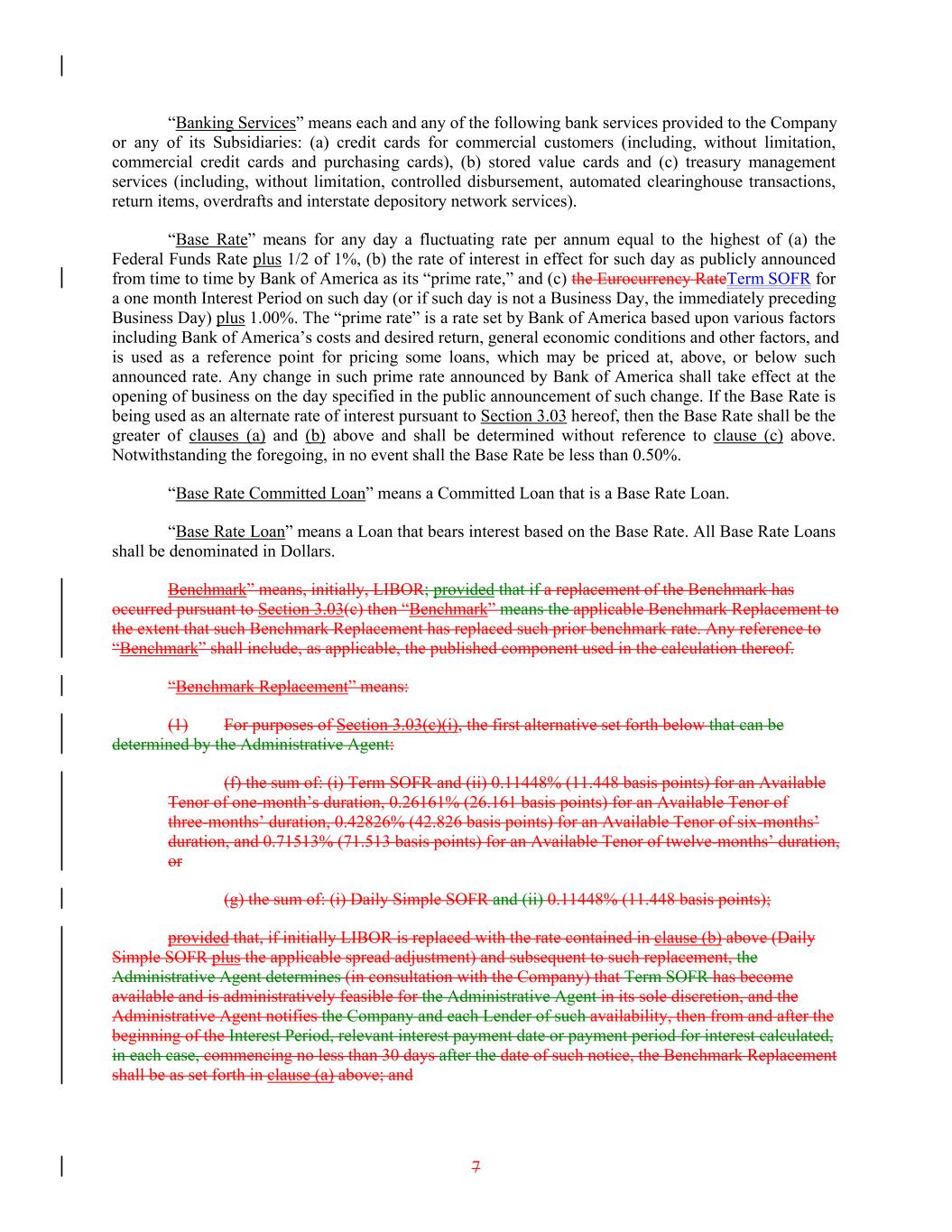 “Banking Services” means each and any of the following bank services provided to the Company or any of its Subsidiaries: (a) credit cards for commercial customers (including, without limitation, commercial credit cards and purchasing cards), (b) stored value cards and (c) treasury management services (including, without limitation, controlled disbursement, automated clearinghouse transactions, return items, overdrafts and interstate depository network services). “Base Rate” means for any day a fluctuating rate per annum equal to the highest of (a) the Federal Funds Rate plus 1/2 of 1%, (b) the rate of interest in effect for such day as publicly announced from time to time by Bank of America as its “prime rate,” and (c) the Eurocurrency RateTerm SOFR for a one month Interest Period on such day (or if such day is not a Business Day, the immediately preceding Business Day) plus 1.00%. The “prime rate” is a rate set by Bank of America based upon various factors including Bank of America’s costs and desired return, general economic conditions and other factors, and is used as a reference point for pricing some loans, which may be priced at, above, or below such announced rate. Any change in such prime rate announced by Bank of America shall take effect at the opening of business on the day specified in the public announcement of such change. If the Base Rate is being used as an alternate rate of interest pursuant to Section 3.03 hereof, then the Base Rate shall be the greater of clauses (a) and (b) above and shall be determined without reference to clause (c) above. Notwithstanding the foregoing, in no event shall the Base Rate be less than 0.50%. “Base Rate Committed Loan” means a Committed Loan that is a Base Rate Loan. “Base Rate Loan” means a Loan that bears interest based on the Base Rate. All Base Rate Loans shall be denominated in Dollars. Benchmark” means, initially, LIBOR; provided that if a replacement of the Benchmark has occurred pursuant to Section 3.03(c) then “Benchmark” means the applicable Benchmark Replacement to the extent that such Benchmark Replacement has replaced such prior benchmark rate. Any reference to “Benchmark” shall include, as applicable, the published component used in the calculation thereof. “Benchmark Replacement” means: (1) For purposes of Section 3.03(c)(i), the first alternative set forth below that can be determined by the Administrative Agent: (f) the sum of: (i) Term SOFR and (ii) 0.11448% (11.448 basis points) for an Available Tenor of one-month’s duration, 0.26161% (26.161 basis points) for an Available Tenor of three-months’ duration, 0.42826% (42.826 basis points) for an Available Tenor of six-months’ duration, and 0.71513% (71.513 basis points) for an Available Tenor of twelve-months’ duration, or (g) the sum of: (i) Daily Simple SOFR and (ii) 0.11448% (11.448 basis points); provided that, if initially LIBOR is replaced with the rate contained in clause (b) above (Daily Simple SOFR plus the applicable spread adjustment) and subsequent to such replacement, the Administrative Agent determines (in consultation with the Company) that Term SOFR has become available and is administratively feasible for the Administrative Agent in its sole discretion, and the Administrative Agent notifies the Company and each Lender of such availability, then from and after the beginning of the Interest Period, relevant interest payment date or payment period for interest calculated, in each case, commencing no less than 30 days after the date of such notice, the Benchmark Replacement shall be as set forth in clause (a) above; and 7