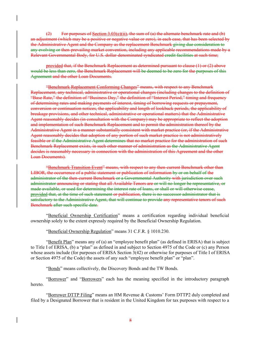 (2) For purposes of Section 3.03(c)(ii), the sum of (a) the alternate benchmark rate and (b) an adjustment (which may be a positive or negative value or zero), in each case, that has been selected by the Administrative Agent and the Company as the replacement Benchmark giving due consideration to any evolving or then-prevailing market convention, including any applicable recommendations made by a Relevant Governmental Body, for U.S. dollar-denominated syndicated credit facilities at such time; provided that, if the Benchmark Replacement as determined pursuant to clause (1) or (2) above would be less than zero, the Benchmark Replacement will be deemed to be zero for the purposes of this Agreement and the other Loan Documents. “Benchmark Replacement Conforming Changes” means, with respect to any Benchmark Replacement, any technical, administrative or operational changes (including changes to the definition of “Base Rate,” the definition of “Business Day,” the definition of “Interest Period,” timing and frequency of determining rates and making payments of interest, timing of borrowing requests or prepayment, conversion or continuation notices, the applicability and length of lookback periods, the applicability of breakage provisions, and other technical, administrative or operational matters) that the Administrative Agent reasonably decides (in consultation with the Company) may be appropriate to reflect the adoption and implementation of such Benchmark Replacement and to permit the administration thereof by the Administrative Agent in a manner substantially consistent with market practice (or, if the Administrative Agent reasonably decides that adoption of any portion of such market practice is not administratively feasible or if the Administrative Agent determines that no market practice for the administration of such Benchmark Replacement exists, in such other manner of administration as the Administrative Agent decides is reasonably necessary in connection with the administration of this Agreement and the other Loan Documents). “Benchmark Transition Event” means, with respect to any then-current Benchmark other than LIBOR, the occurrence of a public statement or publication of information by or on behalf of the administrator of the then-current Benchmark or a Governmental Authority with jurisdiction over such administrator announcing or stating that all Available Tenors are or will no longer be representative, or made available, or used for determining the interest rate of loans, or shall or will otherwise cease, provided that, at the time of such statement or publication, there is no successor administrator that is satisfactory to the Administrative Agent, that will continue to provide any representative tenors of such Benchmark after such specific date. “Beneficial Ownership Certification” means a certification regarding individual beneficial ownership solely to the extent expressly required by the Beneficial Ownership Regulation. “Beneficial Ownership Regulation” means 31 C.F.R. § 1010.230. “Benefit Plan” means any of (a) an “employee benefit plan” (as defined in ERISA) that is subject to Title I of ERISA, (b) a “plan” as defined in and subject to Section 4975 of the Code or (c) any Person whose assets include (for purposes of ERISA Section 3(42) or otherwise for purposes of Title I of ERISA or Section 4975 of the Code) the assets of any such “employee benefit plan” or “plan”. “Bonds” means collectively, the Discovery Bonds and the TW Bonds. “Borrower” and “Borrowers” each has the meaning specified in the introductory paragraph hereto. “Borrower DTTP Filing” means an HM Revenue & Customs’ Form DTTP2 duly completed and filed by a Designated Borrower that is resident in the United Kingdom for tax purposes with respect to a 8