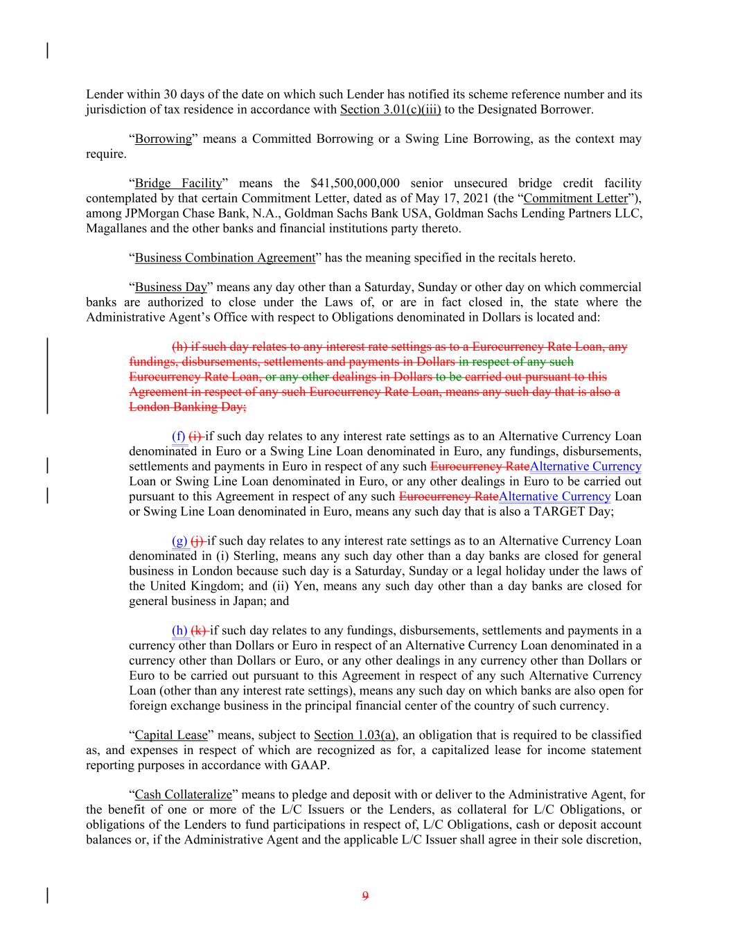Lender within 30 days of the date on which such Lender has notified its scheme reference number and its jurisdiction of tax residence in accordance with Section 3.01(c)(iii) to the Designated Borrower. “Borrowing” means a Committed Borrowing or a Swing Line Borrowing, as the context may require. “Bridge Facility” means the $41,500,000,000 senior unsecured bridge credit facility contemplated by that certain Commitment Letter, dated as of May 17, 2021 (the “Commitment Letter”), among JPMorgan Chase Bank, N.A., Goldman Sachs Bank USA, Goldman Sachs Lending Partners LLC, Magallanes and the other banks and financial institutions party thereto. “Business Combination Agreement” has the meaning specified in the recitals hereto. “Business Day” means any day other than a Saturday, Sunday or other day on which commercial banks are authorized to close under the Laws of, or are in fact closed in, the state where the Administrative Agent’s Office with respect to Obligations denominated in Dollars is located and: (h) if such day relates to any interest rate settings as to a Eurocurrency Rate Loan, any fundings, disbursements, settlements and payments in Dollars in respect of any such Eurocurrency Rate Loan, or any other dealings in Dollars to be carried out pursuant to this Agreement in respect of any such Eurocurrency Rate Loan, means any such day that is also a London Banking Day; (f) (i) if such day relates to any interest rate settings as to an Alternative Currency Loan denominated in Euro or a Swing Line Loan denominated in Euro, any fundings, disbursements, settlements and payments in Euro in respect of any such Eurocurrency RateAlternative Currency Loan or Swing Line Loan denominated in Euro, or any other dealings in Euro to be carried out pursuant to this Agreement in respect of any such Eurocurrency RateAlternative Currency Loan or Swing Line Loan denominated in Euro, means any such day that is also a TARGET Day; (g) (j) if such day relates to any interest rate settings as to an Alternative Currency Loan denominated in (i) Sterling, means any such day other than a day banks are closed for general business in London because such day is a Saturday, Sunday or a legal holiday under the laws of the United Kingdom; and (ii) Yen, means any such day other than a day banks are closed for general business in Japan; and (h) (k) if such day relates to any fundings, disbursements, settlements and payments in a currency other than Dollars or Euro in respect of an Alternative Currency Loan denominated in a currency other than Dollars or Euro, or any other dealings in any currency other than Dollars or Euro to be carried out pursuant to this Agreement in respect of any such Alternative Currency Loan (other than any interest rate settings), means any such day on which banks are also open for foreign exchange business in the principal financial center of the country of such currency. “Capital Lease” means, subject to Section 1.03(a), an obligation that is required to be classified as, and expenses in respect of which are recognized as for, a capitalized lease for income statement reporting purposes in accordance with GAAP. “Cash Collateralize” means to pledge and deposit with or deliver to the Administrative Agent, for the benefit of one or more of the L/C Issuers or the Lenders, as collateral for L/C Obligations, or obligations of the Lenders to fund participations in respect of, L/C Obligations, cash or deposit account balances or, if the Administrative Agent and the applicable L/C Issuer shall agree in their sole discretion, 9