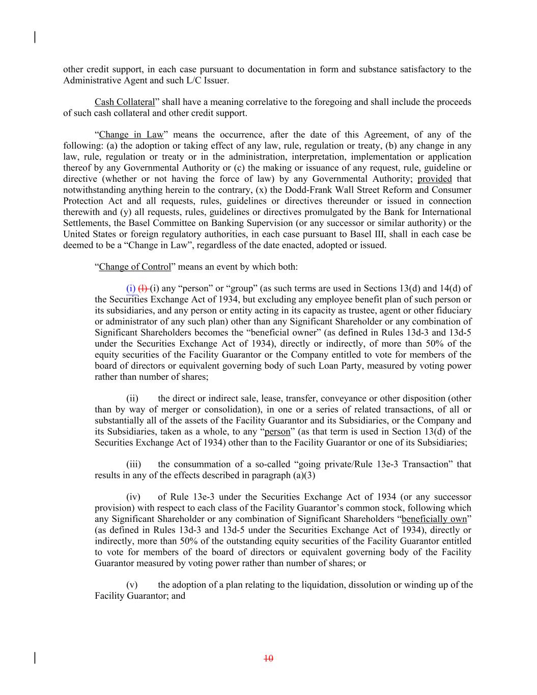 other credit support, in each case pursuant to documentation in form and substance satisfactory to the Administrative Agent and such L/C Issuer. Cash Collateral” shall have a meaning correlative to the foregoing and shall include the proceeds of such cash collateral and other credit support. “Change in Law” means the occurrence, after the date of this Agreement, of any of the following: (a) the adoption or taking effect of any law, rule, regulation or treaty, (b) any change in any law, rule, regulation or treaty or in the administration, interpretation, implementation or application thereof by any Governmental Authority or (c) the making or issuance of any request, rule, guideline or directive (whether or not having the force of law) by any Governmental Authority; provided that notwithstanding anything herein to the contrary, (x) the Dodd-Frank Wall Street Reform and Consumer Protection Act and all requests, rules, guidelines or directives thereunder or issued in connection therewith and (y) all requests, rules, guidelines or directives promulgated by the Bank for International Settlements, the Basel Committee on Banking Supervision (or any successor or similar authority) or the United States or foreign regulatory authorities, in each case pursuant to Basel III, shall in each case be deemed to be a “Change in Law”, regardless of the date enacted, adopted or issued. “Change of Control” means an event by which both: (i) (l) (i) any “person” or “group” (as such terms are used in Sections 13(d) and 14(d) of the Securities Exchange Act of 1934, but excluding any employee benefit plan of such person or its subsidiaries, and any person or entity acting in its capacity as trustee, agent or other fiduciary or administrator of any such plan) other than any Significant Shareholder or any combination of Significant Shareholders becomes the “beneficial owner” (as defined in Rules 13d-3 and 13d-5 under the Securities Exchange Act of 1934), directly or indirectly, of more than 50% of the equity securities of the Facility Guarantor or the Company entitled to vote for members of the board of directors or equivalent governing body of such Loan Party, measured by voting power rather than number of shares; (ii) the direct or indirect sale, lease, transfer, conveyance or other disposition (other than by way of merger or consolidation), in one or a series of related transactions, of all or substantially all of the assets of the Facility Guarantor and its Subsidiaries, or the Company and its Subsidiaries, taken as a whole, to any “person” (as that term is used in Section 13(d) of the Securities Exchange Act of 1934) other than to the Facility Guarantor or one of its Subsidiaries; (iii) the consummation of a so-called “going private/Rule 13e-3 Transaction” that results in any of the effects described in paragraph (a)(3) (iv) of Rule 13e-3 under the Securities Exchange Act of 1934 (or any successor provision) with respect to each class of the Facility Guarantor’s common stock, following which any Significant Shareholder or any combination of Significant Shareholders “beneficially own” (as defined in Rules 13d-3 and 13d-5 under the Securities Exchange Act of 1934), directly or indirectly, more than 50% of the outstanding equity securities of the Facility Guarantor entitled to vote for members of the board of directors or equivalent governing body of the Facility Guarantor measured by voting power rather than number of shares; or (v) the adoption of a plan relating to the liquidation, dissolution or winding up of the Facility Guarantor; and 10