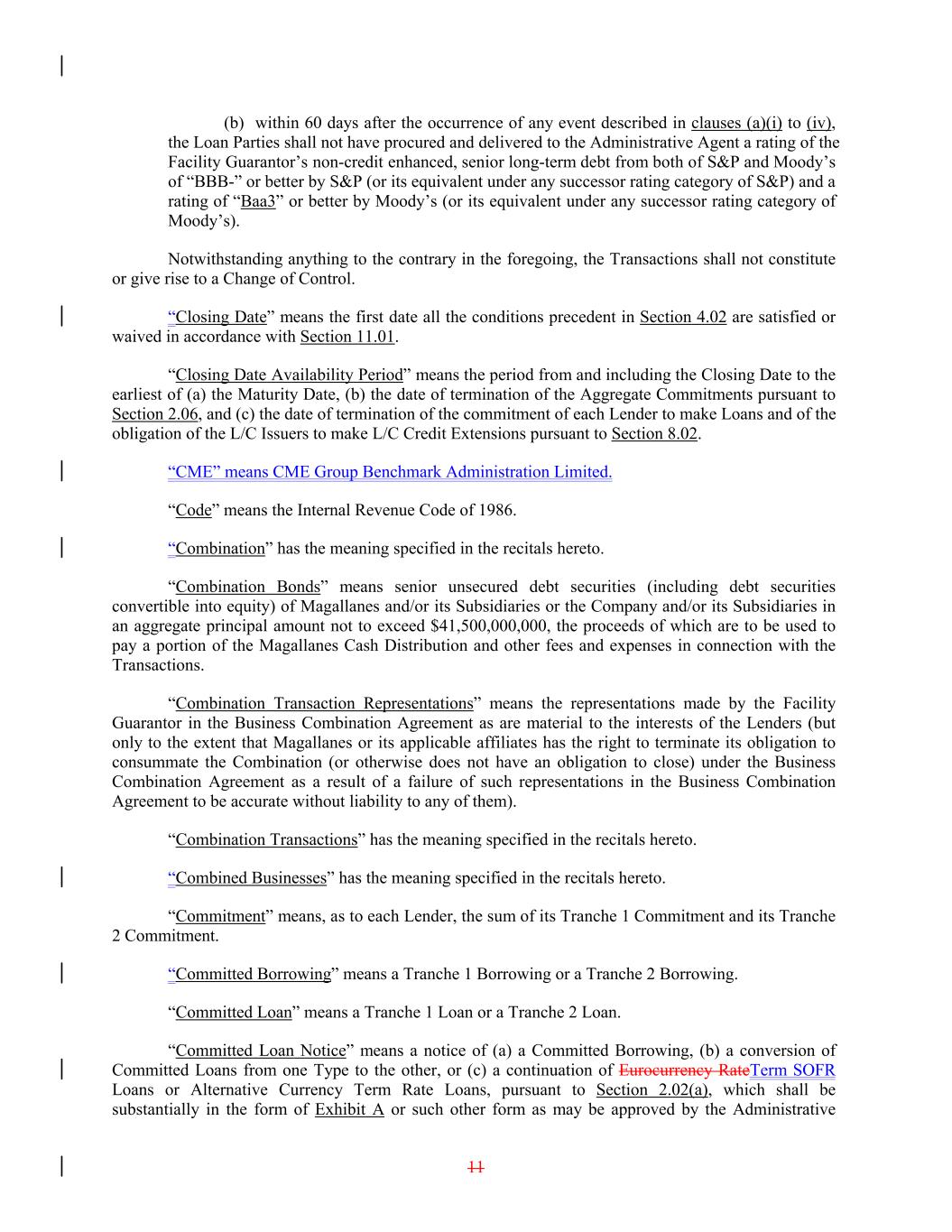 (b) within 60 days after the occurrence of any event described in clauses (a)(i) to (iv), the Loan Parties shall not have procured and delivered to the Administrative Agent a rating of the Facility Guarantor’s non-credit enhanced, senior long-term debt from both of S&P and Moody’s of “BBB-” or better by S&P (or its equivalent under any successor rating category of S&P) and a rating of “Baa3” or better by Moody’s (or its equivalent under any successor rating category of Moody’s). Notwithstanding anything to the contrary in the foregoing, the Transactions shall not constitute or give rise to a Change of Control. “Closing Date” means the first date all the conditions precedent in Section 4.02 are satisfied or waived in accordance with Section 11.01. “Closing Date Availability Period” means the period from and including the Closing Date to the earliest of (a) the Maturity Date, (b) the date of termination of the Aggregate Commitments pursuant to Section 2.06, and (c) the date of termination of the commitment of each Lender to make Loans and of the obligation of the L/C Issuers to make L/C Credit Extensions pursuant to Section 8.02. “CME” means CME Group Benchmark Administration Limited. “Code” means the Internal Revenue Code of 1986. “Combination” has the meaning specified in the recitals hereto. “Combination Bonds” means senior unsecured debt securities (including debt securities convertible into equity) of Magallanes and/or its Subsidiaries or the Company and/or its Subsidiaries in an aggregate principal amount not to exceed $41,500,000,000, the proceeds of which are to be used to pay a portion of the Magallanes Cash Distribution and other fees and expenses in connection with the Transactions. “Combination Transaction Representations” means the representations made by the Facility Guarantor in the Business Combination Agreement as are material to the interests of the Lenders (but only to the extent that Magallanes or its applicable affiliates has the right to terminate its obligation to consummate the Combination (or otherwise does not have an obligation to close) under the Business Combination Agreement as a result of a failure of such representations in the Business Combination Agreement to be accurate without liability to any of them). “Combination Transactions” has the meaning specified in the recitals hereto. “Combined Businesses” has the meaning specified in the recitals hereto. “Commitment” means, as to each Lender, the sum of its Tranche 1 Commitment and its Tranche 2 Commitment. “Committed Borrowing” means a Tranche 1 Borrowing or a Tranche 2 Borrowing. “Committed Loan” means a Tranche 1 Loan or a Tranche 2 Loan. “Committed Loan Notice” means a notice of (a) a Committed Borrowing, (b) a conversion of Committed Loans from one Type to the other, or (c) a continuation of Eurocurrency RateTerm SOFR Loans or Alternative Currency Term Rate Loans, pursuant to Section 2.02(a), which shall be substantially in the form of Exhibit A or such other form as may be approved by the Administrative 11