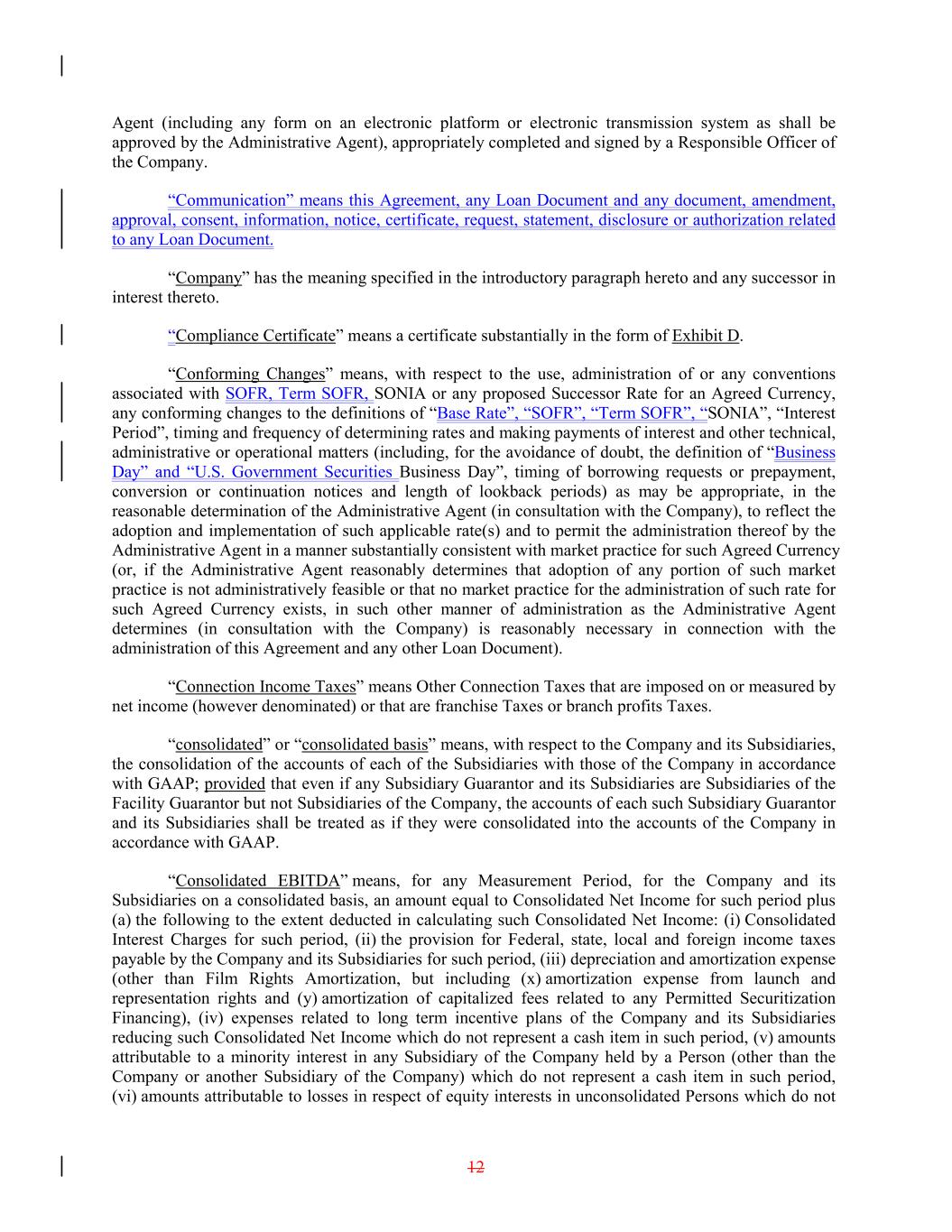 Agent (including any form on an electronic platform or electronic transmission system as shall be approved by the Administrative Agent), appropriately completed and signed by a Responsible Officer of the Company. “Communication” means this Agreement, any Loan Document and any document, amendment, approval, consent, information, notice, certificate, request, statement, disclosure or authorization related to any Loan Document. “Company” has the meaning specified in the introductory paragraph hereto and any successor in interest thereto. “Compliance Certificate” means a certificate substantially in the form of Exhibit D. “Conforming Changes” means, with respect to the use, administration of or any conventions associated with SOFR, Term SOFR, SONIA or any proposed Successor Rate for an Agreed Currency, any conforming changes to the definitions of “Base Rate”, “SOFR”, “Term SOFR”, “SONIA”, “Interest Period”, timing and frequency of determining rates and making payments of interest and other technical, administrative or operational matters (including, for the avoidance of doubt, the definition of “Business Day” and “U.S. Government Securities Business Day”, timing of borrowing requests or prepayment, conversion or continuation notices and length of lookback periods) as may be appropriate, in the reasonable determination of the Administrative Agent (in consultation with the Company), to reflect the adoption and implementation of such applicable rate(s) and to permit the administration thereof by the Administrative Agent in a manner substantially consistent with market practice for such Agreed Currency (or, if the Administrative Agent reasonably determines that adoption of any portion of such market practice is not administratively feasible or that no market practice for the administration of such rate for such Agreed Currency exists, in such other manner of administration as the Administrative Agent determines (in consultation with the Company) is reasonably necessary in connection with the administration of this Agreement and any other Loan Document). “Connection Income Taxes” means Other Connection Taxes that are imposed on or measured by net income (however denominated) or that are franchise Taxes or branch profits Taxes. “consolidated” or “consolidated basis” means, with respect to the Company and its Subsidiaries, the consolidation of the accounts of each of the Subsidiaries with those of the Company in accordance with GAAP; provided that even if any Subsidiary Guarantor and its Subsidiaries are Subsidiaries of the Facility Guarantor but not Subsidiaries of the Company, the accounts of each such Subsidiary Guarantor and its Subsidiaries shall be treated as if they were consolidated into the accounts of the Company in accordance with GAAP. “Consolidated EBITDA” means, for any Measurement Period, for the Company and its Subsidiaries on a consolidated basis, an amount equal to Consolidated Net Income for such period plus (a) the following to the extent deducted in calculating such Consolidated Net Income: (i) Consolidated Interest Charges for such period, (ii) the provision for Federal, state, local and foreign income taxes payable by the Company and its Subsidiaries for such period, (iii) depreciation and amortization expense (other than Film Rights Amortization, but including (x) amortization expense from launch and representation rights and (y) amortization of capitalized fees related to any Permitted Securitization Financing), (iv) expenses related to long term incentive plans of the Company and its Subsidiaries reducing such Consolidated Net Income which do not represent a cash item in such period, (v) amounts attributable to a minority interest in any Subsidiary of the Company held by a Person (other than the Company or another Subsidiary of the Company) which do not represent a cash item in such period, (vi) amounts attributable to losses in respect of equity interests in unconsolidated Persons which do not 12