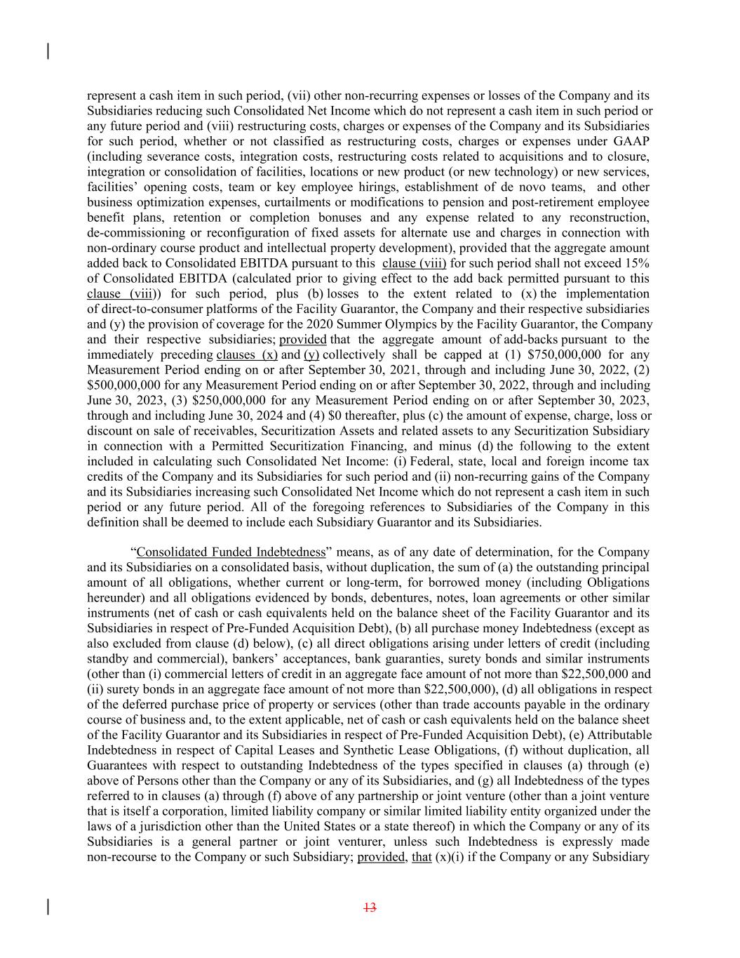 represent a cash item in such period, (vii) other non-recurring expenses or losses of the Company and its Subsidiaries reducing such Consolidated Net Income which do not represent a cash item in such period or any future period and (viii) restructuring costs, charges or expenses of the Company and its Subsidiaries for such period, whether or not classified as restructuring costs, charges or expenses under GAAP (including severance costs, integration costs, restructuring costs related to acquisitions and to closure, integration or consolidation of facilities, locations or new product (or new technology) or new services, facilities’ opening costs, team or key employee hirings, establishment of de novo teams, and other business optimization expenses, curtailments or modifications to pension and post-retirement employee benefit plans, retention or completion bonuses and any expense related to any reconstruction, de-commissioning or reconfiguration of fixed assets for alternate use and charges in connection with non-ordinary course product and intellectual property development), provided that the aggregate amount added back to Consolidated EBITDA pursuant to this clause (viii) for such period shall not exceed 15% of Consolidated EBITDA (calculated prior to giving effect to the add back permitted pursuant to this clause (viii)) for such period, plus (b) losses to the extent related to (x) the implementation of direct-to-consumer platforms of the Facility Guarantor, the Company and their respective subsidiaries and (y) the provision of coverage for the 2020 Summer Olympics by the Facility Guarantor, the Company and their respective subsidiaries; provided that the aggregate amount of add-backs pursuant to the immediately preceding clauses (x) and (y) collectively shall be capped at (1) $750,000,000 for any Measurement Period ending on or after September 30, 2021, through and including June 30, 2022, (2) $500,000,000 for any Measurement Period ending on or after September 30, 2022, through and including June 30, 2023, (3) $250,000,000 for any Measurement Period ending on or after September 30, 2023, through and including June 30, 2024 and (4) $0 thereafter, plus (c) the amount of expense, charge, loss or discount on sale of receivables, Securitization Assets and related assets to any Securitization Subsidiary in connection with a Permitted Securitization Financing, and minus (d) the following to the extent included in calculating such Consolidated Net Income: (i) Federal, state, local and foreign income tax credits of the Company and its Subsidiaries for such period and (ii) non-recurring gains of the Company and its Subsidiaries increasing such Consolidated Net Income which do not represent a cash item in such period or any future period. All of the foregoing references to Subsidiaries of the Company in this definition shall be deemed to include each Subsidiary Guarantor and its Subsidiaries. “Consolidated Funded Indebtedness” means, as of any date of determination, for the Company and its Subsidiaries on a consolidated basis, without duplication, the sum of (a) the outstanding principal amount of all obligations, whether current or long-term, for borrowed money (including Obligations hereunder) and all obligations evidenced by bonds, debentures, notes, loan agreements or other similar instruments (net of cash or cash equivalents held on the balance sheet of the Facility Guarantor and its Subsidiaries in respect of Pre-Funded Acquisition Debt), (b) all purchase money Indebtedness (except as also excluded from clause (d) below), (c) all direct obligations arising under letters of credit (including standby and commercial), bankers’ acceptances, bank guaranties, surety bonds and similar instruments (other than (i) commercial letters of credit in an aggregate face amount of not more than $22,500,000 and (ii) surety bonds in an aggregate face amount of not more than $22,500,000), (d) all obligations in respect of the deferred purchase price of property or services (other than trade accounts payable in the ordinary course of business and, to the extent applicable, net of cash or cash equivalents held on the balance sheet of the Facility Guarantor and its Subsidiaries in respect of Pre-Funded Acquisition Debt), (e) Attributable Indebtedness in respect of Capital Leases and Synthetic Lease Obligations, (f) without duplication, all Guarantees with respect to outstanding Indebtedness of the types specified in clauses (a) through (e) above of Persons other than the Company or any of its Subsidiaries, and (g) all Indebtedness of the types referred to in clauses (a) through (f) above of any partnership or joint venture (other than a joint venture that is itself a corporation, limited liability company or similar limited liability entity organized under the laws of a jurisdiction other than the United States or a state thereof) in which the Company or any of its Subsidiaries is a general partner or joint venturer, unless such Indebtedness is expressly made non-recourse to the Company or such Subsidiary; provided, that (x)(i) if the Company or any Subsidiary 13