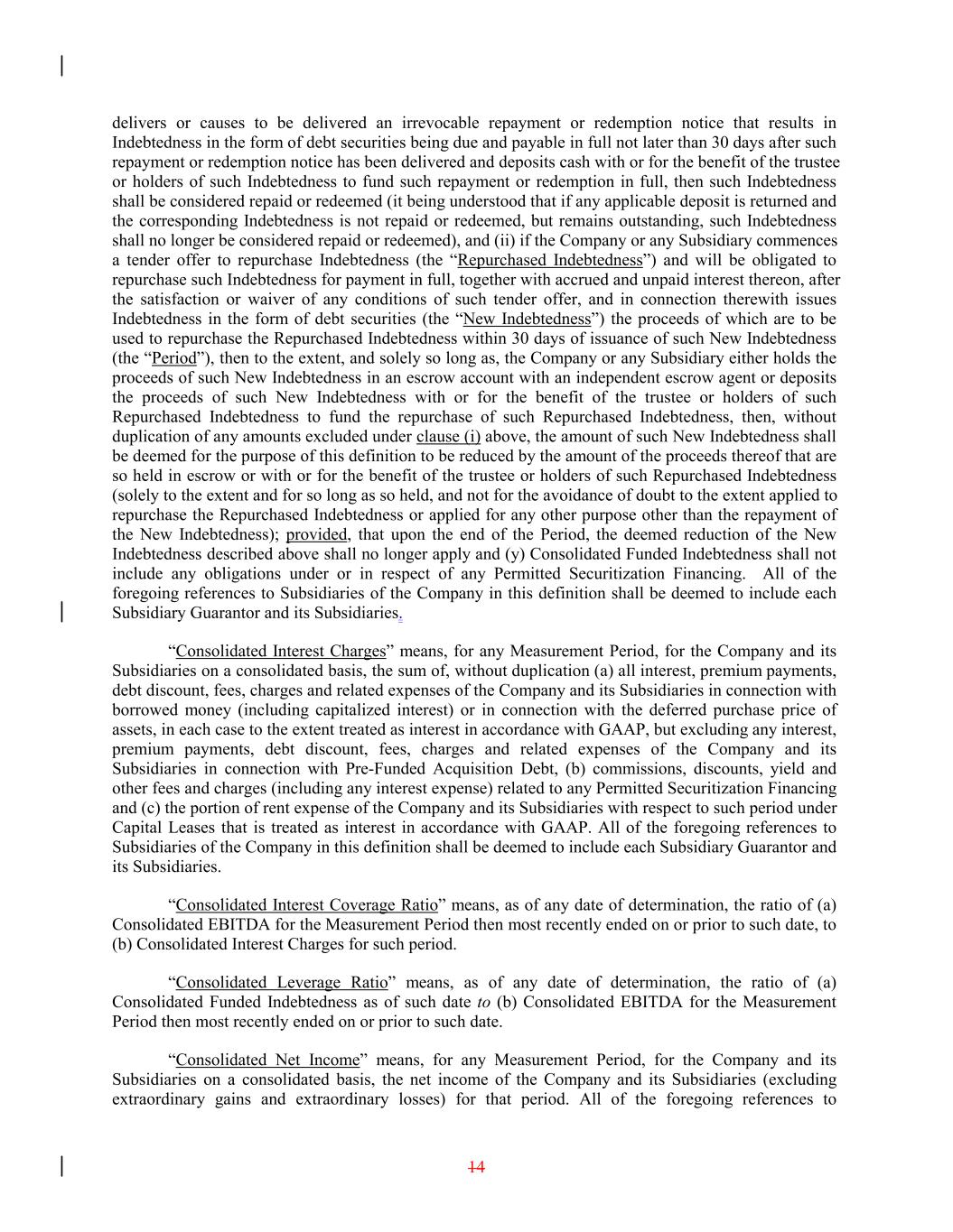 delivers or causes to be delivered an irrevocable repayment or redemption notice that results in Indebtedness in the form of debt securities being due and payable in full not later than 30 days after such repayment or redemption notice has been delivered and deposits cash with or for the benefit of the trustee or holders of such Indebtedness to fund such repayment or redemption in full, then such Indebtedness shall be considered repaid or redeemed (it being understood that if any applicable deposit is returned and the corresponding Indebtedness is not repaid or redeemed, but remains outstanding, such Indebtedness shall no longer be considered repaid or redeemed), and (ii) if the Company or any Subsidiary commences a tender offer to repurchase Indebtedness (the “Repurchased Indebtedness”) and will be obligated to repurchase such Indebtedness for payment in full, together with accrued and unpaid interest thereon, after the satisfaction or waiver of any conditions of such tender offer, and in connection therewith issues Indebtedness in the form of debt securities (the “New Indebtedness”) the proceeds of which are to be used to repurchase the Repurchased Indebtedness within 30 days of issuance of such New Indebtedness (the “Period”), then to the extent, and solely so long as, the Company or any Subsidiary either holds the proceeds of such New Indebtedness in an escrow account with an independent escrow agent or deposits the proceeds of such New Indebtedness with or for the benefit of the trustee or holders of such Repurchased Indebtedness to fund the repurchase of such Repurchased Indebtedness, then, without duplication of any amounts excluded under clause (i) above, the amount of such New Indebtedness shall be deemed for the purpose of this definition to be reduced by the amount of the proceeds thereof that are so held in escrow or with or for the benefit of the trustee or holders of such Repurchased Indebtedness (solely to the extent and for so long as so held, and not for the avoidance of doubt to the extent applied to repurchase the Repurchased Indebtedness or applied for any other purpose other than the repayment of the New Indebtedness); provided, that upon the end of the Period, the deemed reduction of the New Indebtedness described above shall no longer apply and (y) Consolidated Funded Indebtedness shall not include any obligations under or in respect of any Permitted Securitization Financing. All of the foregoing references to Subsidiaries of the Company in this definition shall be deemed to include each Subsidiary Guarantor and its Subsidiaries. “Consolidated Interest Charges” means, for any Measurement Period, for the Company and its Subsidiaries on a consolidated basis, the sum of, without duplication (a) all interest, premium payments, debt discount, fees, charges and related expenses of the Company and its Subsidiaries in connection with borrowed money (including capitalized interest) or in connection with the deferred purchase price of assets, in each case to the extent treated as interest in accordance with GAAP, but excluding any interest, premium payments, debt discount, fees, charges and related expenses of the Company and its Subsidiaries in connection with Pre-Funded Acquisition Debt, (b) commissions, discounts, yield and other fees and charges (including any interest expense) related to any Permitted Securitization Financing and (c) the portion of rent expense of the Company and its Subsidiaries with respect to such period under Capital Leases that is treated as interest in accordance with GAAP. All of the foregoing references to Subsidiaries of the Company in this definition shall be deemed to include each Subsidiary Guarantor and its Subsidiaries. “Consolidated Interest Coverage Ratio” means, as of any date of determination, the ratio of (a) Consolidated EBITDA for the Measurement Period then most recently ended on or prior to such date, to (b) Consolidated Interest Charges for such period. “Consolidated Leverage Ratio” means, as of any date of determination, the ratio of (a) Consolidated Funded Indebtedness as of such date to (b) Consolidated EBITDA for the Measurement Period then most recently ended on or prior to such date. “Consolidated Net Income” means, for any Measurement Period, for the Company and its Subsidiaries on a consolidated basis, the net income of the Company and its Subsidiaries (excluding extraordinary gains and extraordinary losses) for that period. All of the foregoing references to 14