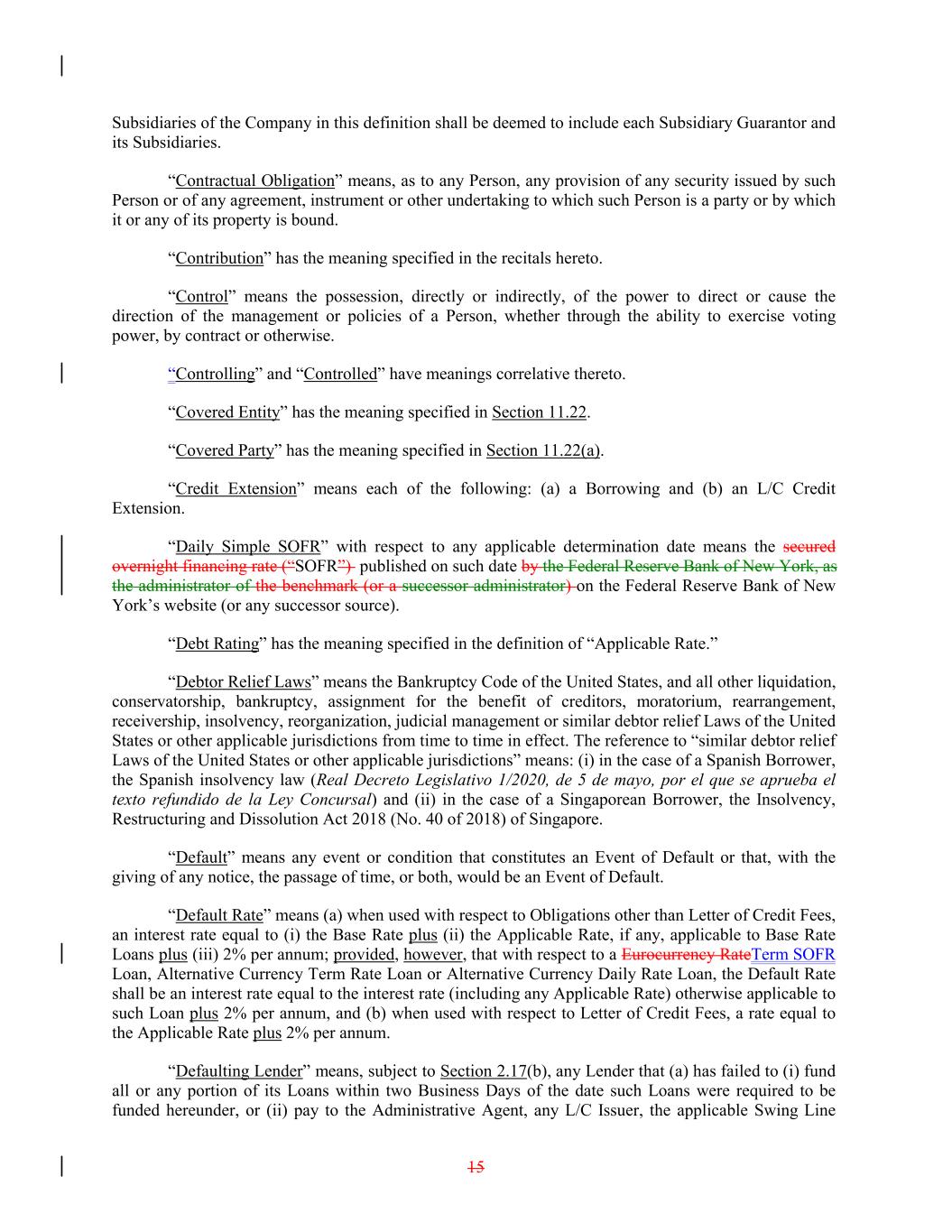 Subsidiaries of the Company in this definition shall be deemed to include each Subsidiary Guarantor and its Subsidiaries. “Contractual Obligation” means, as to any Person, any provision of any security issued by such Person or of any agreement, instrument or other undertaking to which such Person is a party or by which it or any of its property is bound. “Contribution” has the meaning specified in the recitals hereto. “Control” means the possession, directly or indirectly, of the power to direct or cause the direction of the management or policies of a Person, whether through the ability to exercise voting power, by contract or otherwise. “Controlling” and “Controlled” have meanings correlative thereto. “Covered Entity” has the meaning specified in Section 11.22. “Covered Party” has the meaning specified in Section 11.22(a). “Credit Extension” means each of the following: (a) a Borrowing and (b) an L/C Credit Extension. “Daily Simple SOFR” with respect to any applicable determination date means the secured overnight financing rate (“SOFR”) published on such date by the Federal Reserve Bank of New York, as the administrator of the benchmark (or a successor administrator) on the Federal Reserve Bank of New York’s website (or any successor source). “Debt Rating” has the meaning specified in the definition of “Applicable Rate.” “Debtor Relief Laws” means the Bankruptcy Code of the United States, and all other liquidation, conservatorship, bankruptcy, assignment for the benefit of creditors, moratorium, rearrangement, receivership, insolvency, reorganization, judicial management or similar debtor relief Laws of the United States or other applicable jurisdictions from time to time in effect. The reference to “similar debtor relief Laws of the United States or other applicable jurisdictions” means: (i) in the case of a Spanish Borrower, the Spanish insolvency law (Real Decreto Legislativo 1/2020, de 5 de mayo, por el que se aprueba el texto refundido de la Ley Concursal) and (ii) in the case of a Singaporean Borrower, the Insolvency, Restructuring and Dissolution Act 2018 (No. 40 of 2018) of Singapore. “Default” means any event or condition that constitutes an Event of Default or that, with the giving of any notice, the passage of time, or both, would be an Event of Default. “Default Rate” means (a) when used with respect to Obligations other than Letter of Credit Fees, an interest rate equal to (i) the Base Rate plus (ii) the Applicable Rate, if any, applicable to Base Rate Loans plus (iii) 2% per annum; provided, however, that with respect to a Eurocurrency RateTerm SOFR Loan, Alternative Currency Term Rate Loan or Alternative Currency Daily Rate Loan, the Default Rate shall be an interest rate equal to the interest rate (including any Applicable Rate) otherwise applicable to such Loan plus 2% per annum, and (b) when used with respect to Letter of Credit Fees, a rate equal to the Applicable Rate plus 2% per annum. “Defaulting Lender” means, subject to Section 2.17(b), any Lender that (a) has failed to (i) fund all or any portion of its Loans within two Business Days of the date such Loans were required to be funded hereunder, or (ii) pay to the Administrative Agent, any L/C Issuer, the applicable Swing Line 15