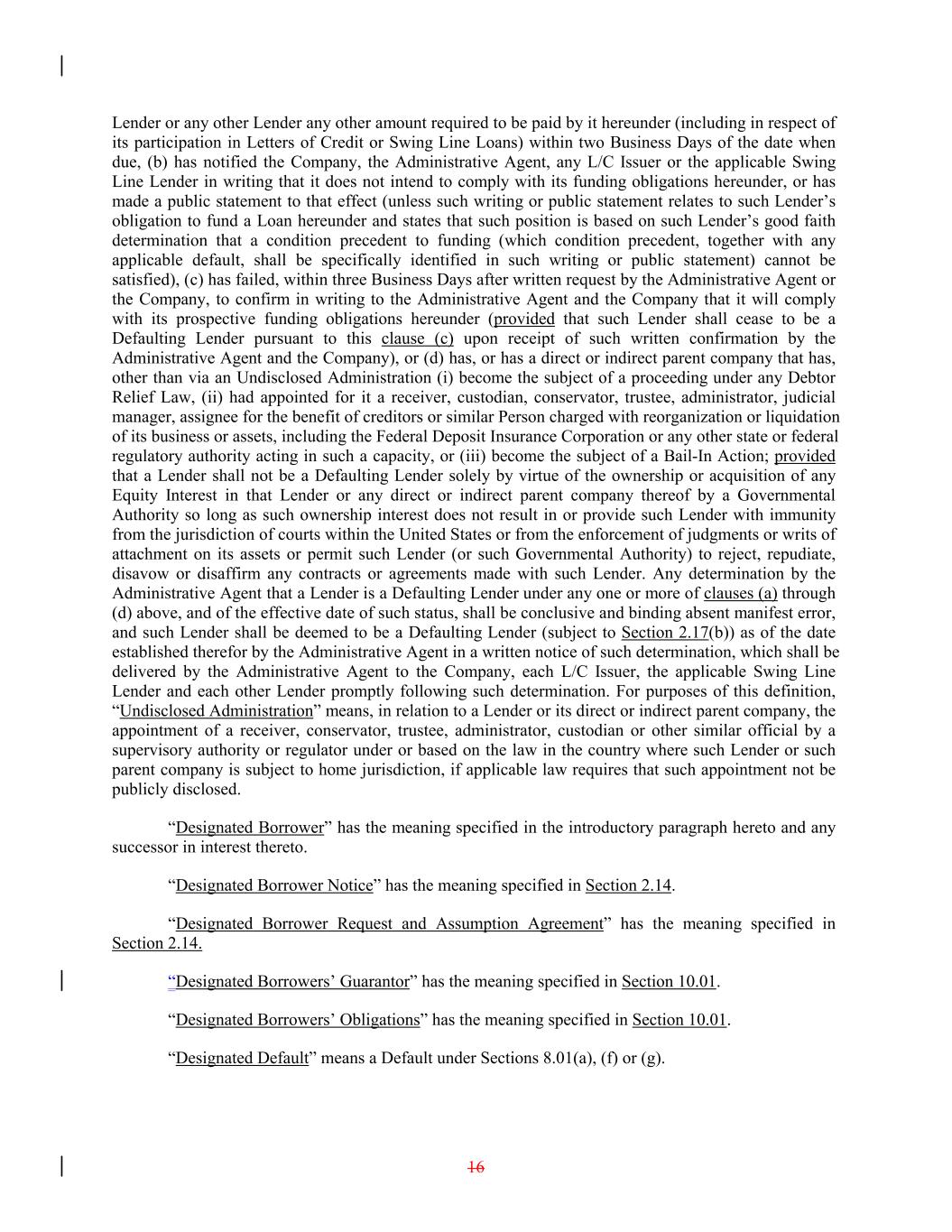 Lender or any other Lender any other amount required to be paid by it hereunder (including in respect of its participation in Letters of Credit or Swing Line Loans) within two Business Days of the date when due, (b) has notified the Company, the Administrative Agent, any L/C Issuer or the applicable Swing Line Lender in writing that it does not intend to comply with its funding obligations hereunder, or has made a public statement to that effect (unless such writing or public statement relates to such Lender’s obligation to fund a Loan hereunder and states that such position is based on such Lender’s good faith determination that a condition precedent to funding (which condition precedent, together with any applicable default, shall be specifically identified in such writing or public statement) cannot be satisfied), (c) has failed, within three Business Days after written request by the Administrative Agent or the Company, to confirm in writing to the Administrative Agent and the Company that it will comply with its prospective funding obligations hereunder (provided that such Lender shall cease to be a Defaulting Lender pursuant to this clause (c) upon receipt of such written confirmation by the Administrative Agent and the Company), or (d) has, or has a direct or indirect parent company that has, other than via an Undisclosed Administration (i) become the subject of a proceeding under any Debtor Relief Law, (ii) had appointed for it a receiver, custodian, conservator, trustee, administrator, judicial manager, assignee for the benefit of creditors or similar Person charged with reorganization or liquidation of its business or assets, including the Federal Deposit Insurance Corporation or any other state or federal regulatory authority acting in such a capacity, or (iii) become the subject of a Bail-In Action; provided that a Lender shall not be a Defaulting Lender solely by virtue of the ownership or acquisition of any Equity Interest in that Lender or any direct or indirect parent company thereof by a Governmental Authority so long as such ownership interest does not result in or provide such Lender with immunity from the jurisdiction of courts within the United States or from the enforcement of judgments or writs of attachment on its assets or permit such Lender (or such Governmental Authority) to reject, repudiate, disavow or disaffirm any contracts or agreements made with such Lender. Any determination by the Administrative Agent that a Lender is a Defaulting Lender under any one or more of clauses (a) through (d) above, and of the effective date of such status, shall be conclusive and binding absent manifest error, and such Lender shall be deemed to be a Defaulting Lender (subject to Section 2.17(b)) as of the date established therefor by the Administrative Agent in a written notice of such determination, which shall be delivered by the Administrative Agent to the Company, each L/C Issuer, the applicable Swing Line Lender and each other Lender promptly following such determination. For purposes of this definition, “Undisclosed Administration” means, in relation to a Lender or its direct or indirect parent company, the appointment of a receiver, conservator, trustee, administrator, custodian or other similar official by a supervisory authority or regulator under or based on the law in the country where such Lender or such parent company is subject to home jurisdiction, if applicable law requires that such appointment not be publicly disclosed. “Designated Borrower” has the meaning specified in the introductory paragraph hereto and any successor in interest thereto. “Designated Borrower Notice” has the meaning specified in Section 2.14. “Designated Borrower Request and Assumption Agreement” has the meaning specified in Section 2.14. “Designated Borrowers’ Guarantor” has the meaning specified in Section 10.01. “Designated Borrowers’ Obligations” has the meaning specified in Section 10.01. “Designated Default” means a Default under Sections 8.01(a), (f) or (g). 16