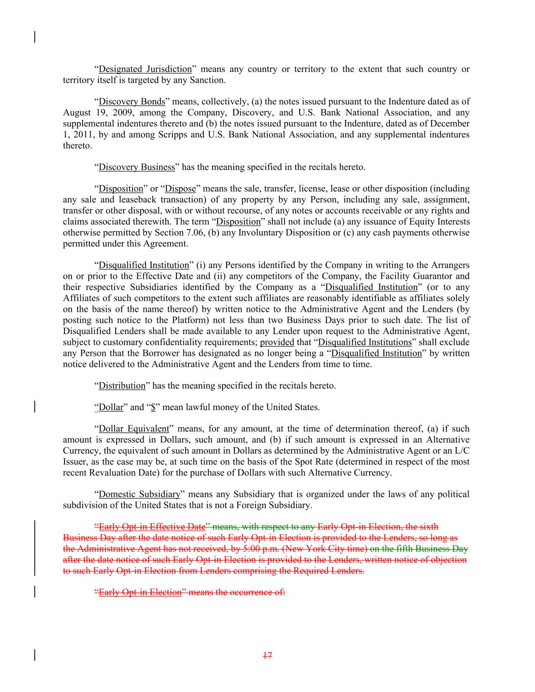 “Designated Jurisdiction” means any country or territory to the extent that such country or territory itself is targeted by any Sanction. “Discovery Bonds” means, collectively, (a) the notes issued pursuant to the Indenture dated as of August 19, 2009, among the Company, Discovery, and U.S. Bank National Association, and any supplemental indentures thereto and (b) the notes issued pursuant to the Indenture, dated as of December 1, 2011, by and among Scripps and U.S. Bank National Association, and any supplemental indentures thereto. “Discovery Business” has the meaning specified in the recitals hereto. “Disposition” or “Dispose” means the sale, transfer, license, lease or other disposition (including any sale and leaseback transaction) of any property by any Person, including any sale, assignment, transfer or other disposal, with or without recourse, of any notes or accounts receivable or any rights and claims associated therewith. The term “Disposition” shall not include (a) any issuance of Equity Interests otherwise permitted by Section 7.06, (b) any Involuntary Disposition or (c) any cash payments otherwise permitted under this Agreement. “Disqualified Institution” (i) any Persons identified by the Company in writing to the Arrangers on or prior to the Effective Date and (ii) any competitors of the Company, the Facility Guarantor and their respective Subsidiaries identified by the Company as a “Disqualified Institution” (or to any Affiliates of such competitors to the extent such affiliates are reasonably identifiable as affiliates solely on the basis of the name thereof) by written notice to the Administrative Agent and the Lenders (by posting such notice to the Platform) not less than two Business Days prior to such date. The list of Disqualified Lenders shall be made available to any Lender upon request to the Administrative Agent, subject to customary confidentiality requirements; provided that “Disqualified Institutions” shall exclude any Person that the Borrower has designated as no longer being a “Disqualified Institution” by written notice delivered to the Administrative Agent and the Lenders from time to time. “Distribution” has the meaning specified in the recitals hereto. “Dollar” and “$” mean lawful money of the United States. “Dollar Equivalent” means, for any amount, at the time of determination thereof, (a) if such amount is expressed in Dollars, such amount, and (b) if such amount is expressed in an Alternative Currency, the equivalent of such amount in Dollars as determined by the Administrative Agent or an L/C Issuer, as the case may be, at such time on the basis of the Spot Rate (determined in respect of the most recent Revaluation Date) for the purchase of Dollars with such Alternative Currency. “Domestic Subsidiary” means any Subsidiary that is organized under the laws of any political subdivision of the United States that is not a Foreign Subsidiary. “Early Opt-in Effective Date” means, with respect to any Early Opt-in Election, the sixth Business Day after the date notice of such Early Opt-in Election is provided to the Lenders, so long as the Administrative Agent has not received, by 5:00 p.m. (New York City time) on the fifth Business Day after the date notice of such Early Opt-in Election is provided to the Lenders, written notice of objection to such Early Opt-in Election from Lenders comprising the Required Lenders. “Early Opt-in Election” means the occurrence of: 17