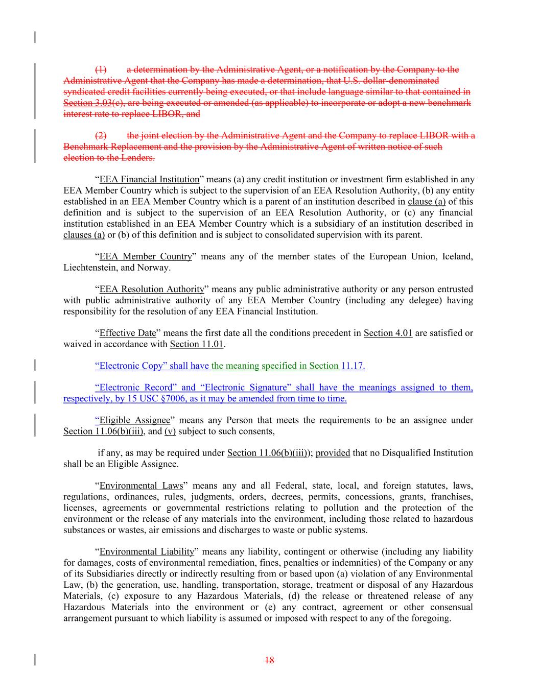 (1) a determination by the Administrative Agent, or a notification by the Company to the Administrative Agent that the Company has made a determination, that U.S. dollar-denominated syndicated credit facilities currently being executed, or that include language similar to that contained in Section 3.03(c), are being executed or amended (as applicable) to incorporate or adopt a new benchmark interest rate to replace LIBOR, and (2) the joint election by the Administrative Agent and the Company to replace LIBOR with a Benchmark Replacement and the provision by the Administrative Agent of written notice of such election to the Lenders. “EEA Financial Institution” means (a) any credit institution or investment firm established in any EEA Member Country which is subject to the supervision of an EEA Resolution Authority, (b) any entity established in an EEA Member Country which is a parent of an institution described in clause (a) of this definition and is subject to the supervision of an EEA Resolution Authority, or (c) any financial institution established in an EEA Member Country which is a subsidiary of an institution described in clauses (a) or (b) of this definition and is subject to consolidated supervision with its parent. “EEA Member Country” means any of the member states of the European Union, Iceland, Liechtenstein, and Norway. “EEA Resolution Authority” means any public administrative authority or any person entrusted with public administrative authority of any EEA Member Country (including any delegee) having responsibility for the resolution of any EEA Financial Institution. “Effective Date” means the first date all the conditions precedent in Section 4.01 are satisfied or waived in accordance with Section 11.01. “Electronic Copy” shall have the meaning specified in Section 11.17. “Electronic Record” and “Electronic Signature” shall have the meanings assigned to them, respectively, by 15 USC §7006, as it may be amended from time to time. “Eligible Assignee” means any Person that meets the requirements to be an assignee under Section 11.06(b)(iii), and (v) subject to such consents, if any, as may be required under Section 11.06(b)(iii)); provided that no Disqualified Institution shall be an Eligible Assignee. “Environmental Laws” means any and all Federal, state, local, and foreign statutes, laws, regulations, ordinances, rules, judgments, orders, decrees, permits, concessions, grants, franchises, licenses, agreements or governmental restrictions relating to pollution and the protection of the environment or the release of any materials into the environment, including those related to hazardous substances or wastes, air emissions and discharges to waste or public systems. “Environmental Liability” means any liability, contingent or otherwise (including any liability for damages, costs of environmental remediation, fines, penalties or indemnities) of the Company or any of its Subsidiaries directly or indirectly resulting from or based upon (a) violation of any Environmental Law, (b) the generation, use, handling, transportation, storage, treatment or disposal of any Hazardous Materials, (c) exposure to any Hazardous Materials, (d) the release or threatened release of any Hazardous Materials into the environment or (e) any contract, agreement or other consensual arrangement pursuant to which liability is assumed or imposed with respect to any of the foregoing. 18