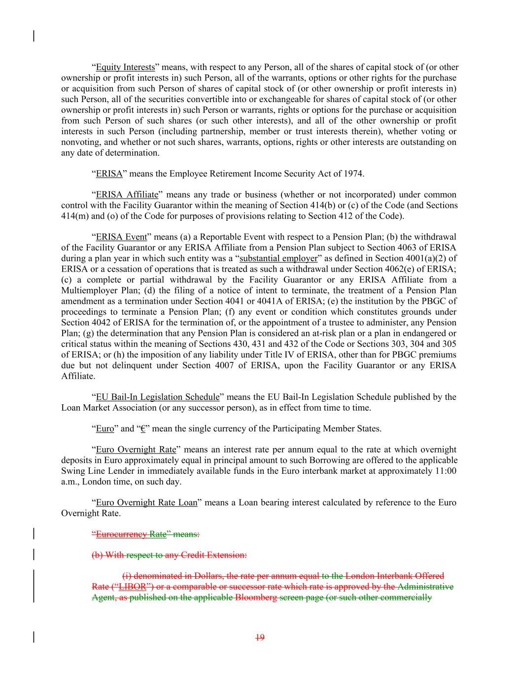 “Equity Interests” means, with respect to any Person, all of the shares of capital stock of (or other ownership or profit interests in) such Person, all of the warrants, options or other rights for the purchase or acquisition from such Person of shares of capital stock of (or other ownership or profit interests in) such Person, all of the securities convertible into or exchangeable for shares of capital stock of (or other ownership or profit interests in) such Person or warrants, rights or options for the purchase or acquisition from such Person of such shares (or such other interests), and all of the other ownership or profit interests in such Person (including partnership, member or trust interests therein), whether voting or nonvoting, and whether or not such shares, warrants, options, rights or other interests are outstanding on any date of determination. “ERISA” means the Employee Retirement Income Security Act of 1974. “ERISA Affiliate” means any trade or business (whether or not incorporated) under common control with the Facility Guarantor within the meaning of Section 414(b) or (c) of the Code (and Sections 414(m) and (o) of the Code for purposes of provisions relating to Section 412 of the Code). “ERISA Event” means (a) a Reportable Event with respect to a Pension Plan; (b) the withdrawal of the Facility Guarantor or any ERISA Affiliate from a Pension Plan subject to Section 4063 of ERISA during a plan year in which such entity was a “substantial employer” as defined in Section 4001(a)(2) of ERISA or a cessation of operations that is treated as such a withdrawal under Section 4062(e) of ERISA; (c) a complete or partial withdrawal by the Facility Guarantor or any ERISA Affiliate from a Multiemployer Plan; (d) the filing of a notice of intent to terminate, the treatment of a Pension Plan amendment as a termination under Section 4041 or 4041A of ERISA; (e) the institution by the PBGC of proceedings to terminate a Pension Plan; (f) any event or condition which constitutes grounds under Section 4042 of ERISA for the termination of, or the appointment of a trustee to administer, any Pension Plan; (g) the determination that any Pension Plan is considered an at-risk plan or a plan in endangered or critical status within the meaning of Sections 430, 431 and 432 of the Code or Sections 303, 304 and 305 of ERISA; or (h) the imposition of any liability under Title IV of ERISA, other than for PBGC premiums due but not delinquent under Section 4007 of ERISA, upon the Facility Guarantor or any ERISA Affiliate. “EU Bail-In Legislation Schedule” means the EU Bail-In Legislation Schedule published by the Loan Market Association (or any successor person), as in effect from time to time. “Euro” and “€” mean the single currency of the Participating Member States. “Euro Overnight Rate” means an interest rate per annum equal to the rate at which overnight deposits in Euro approximately equal in principal amount to such Borrowing are offered to the applicable Swing Line Lender in immediately available funds in the Euro interbank market at approximately 11:00 a.m., London time, on such day. “Euro Overnight Rate Loan” means a Loan bearing interest calculated by reference to the Euro Overnight Rate. “Eurocurrency Rate” means: (b) With respect to any Credit Extension: (i) denominated in Dollars, the rate per annum equal to the London Interbank Offered Rate (“LIBOR”) or a comparable or successor rate which rate is approved by the Administrative Agent, as published on the applicable Bloomberg screen page (or such other commercially 19