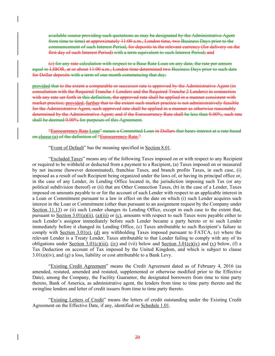 available source providing such quotations as may be designated by the Administrative Agent from time to time) at approximately 11:00 a.m., London time, two Business Days prior to the commencement of such Interest Period, for deposits in the relevant currency (for delivery on the first day of such Interest Period) with a term equivalent to such Interest Period; and (c) for any rate calculation with respect to a Base Rate Loan on any date, the rate per annum equal to LIBOR, at or about 11:00 a.m., London time determined two Business Days prior to such date for Dollar deposits with a term of one month commencing that day; provided that to the extent a comparable or successor rate is approved by the Administrative Agent (in consultation with the Required Tranche 1 Lenders and the Required Tranche 2 Lenders) in connection with any rate set forth in this definition, the approved rate shall be applied in a manner consistent with market practice; provided, further that to the extent such market practice is not administratively feasible for the Administrative Agent, such approved rate shall be applied in a manner as otherwise reasonably determined by the Administrative Agent; and if the Eurocurrency Rate shall be less than 0.00%, such rate shall be deemed 0.00% for purposes of this Agreement. “Eurocurrency Rate Loan” means a Committed Loan in Dollars that bears interest at a rate based on clause (a) of the definition of “Eurocurrency Rate.” “Event of Default” has the meaning specified in Section 8.01. “Excluded Taxes” means any of the following Taxes imposed on or with respect to any Recipient or required to be withheld or deducted from a payment to a Recipient, (a) Taxes imposed on or measured by net income (however denominated), franchise Taxes, and branch profits Taxes, in each case, (i) imposed as a result of such Recipient being organized under the laws of, or having its principal office or, in the case of any Lender, its Lending Office located in, the jurisdiction imposing such Tax (or any political subdivision thereof) or (ii) that are Other Connection Taxes, (b) in the case of a Lender, Taxes imposed on amounts payable to or for the account of such Lender with respect to an applicable interest in a Loan or Commitment pursuant to a law in effect on the date on which (i) such Lender acquires such interest in the Loan or Commitment (other than pursuant to an assignment request by the Company under Section 11.13) or (ii) such Lender changes its Lending Office, except in each case to the extent that, pursuant to Section 3.01(a)(ii), (a)(iii) or (c), amounts with respect to such Taxes were payable either to such Lender’s assignor immediately before such Lender became a party hereto or to such Lender immediately before it changed its Lending Office, (c) Taxes attributable to such Recipient’s failure to comply with Section 3.01(e), (d) any withholding Taxes imposed pursuant to FATCA, (e) where the relevant Lender is a Treaty Lender, Taxes attributable to that Lender failing to comply with any of its obligations under Section 3.01(c)(iii), (iv) and (vii) below and Section 3.01(e)(iv) and (v) below, (f) a Tax Deduction on account of Tax imposed by the United Kingdom, and which is subject to clause 3.01(a)(iv), and (g) a loss, liability or cost attributable to a Bank Levy. “Existing Credit Agreement” means the Credit Agreement dated as of February 4, 2016 (as amended, restated, amended and restated, supplemented or otherwise modified prior to the Effective Date), among the Company, the Facility Guarantor, the designated borrowers from time to time party thereto, Bank of America, as administrative agent, the lenders from time to time party thereto and the swingline lenders and letter of credit issuers from time to time party thereto. “Existing Letters of Credit” means the letters of credit outstanding under the Existing Credit Agreement on the Effective Date, if any, identified on Schedule 1.01. 20
