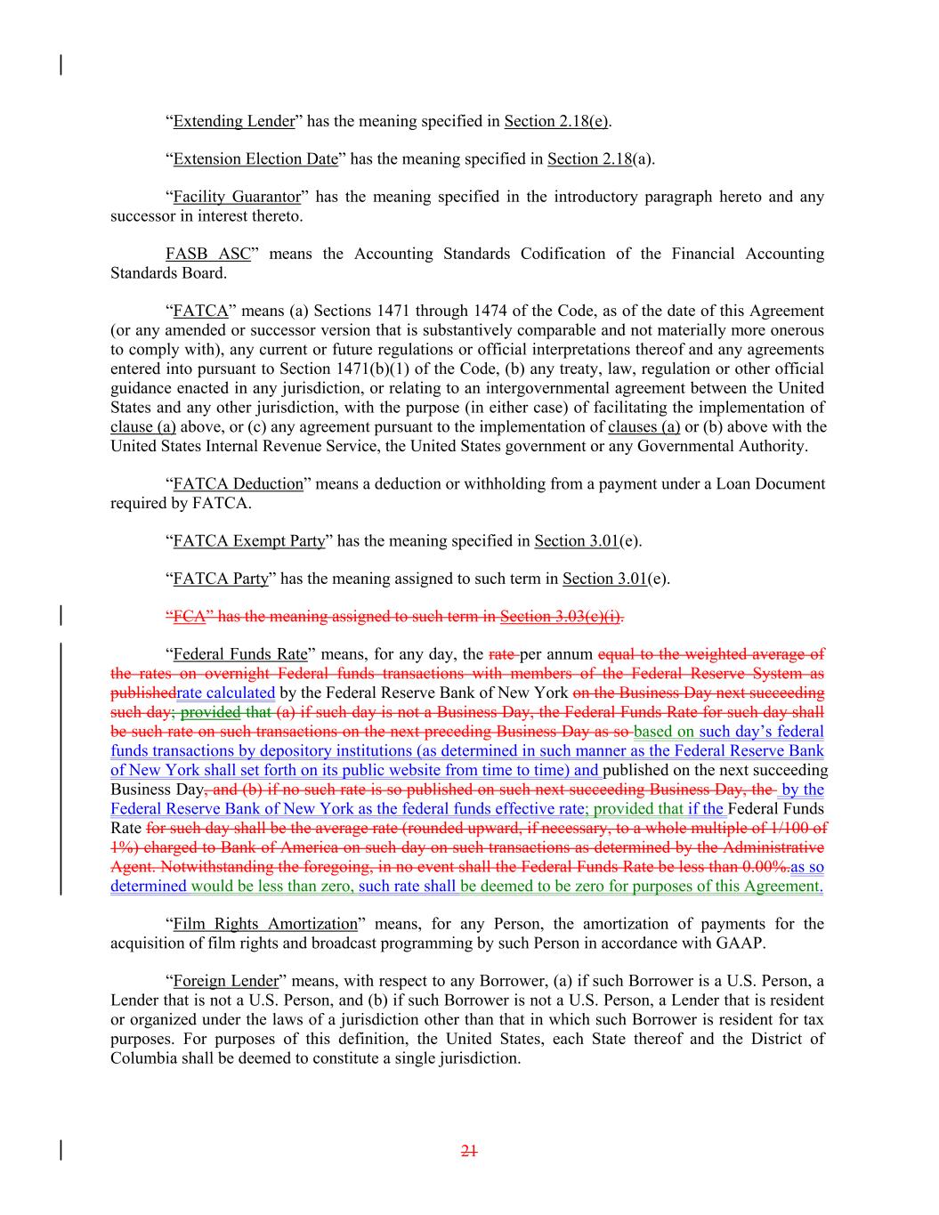 “Extending Lender” has the meaning specified in Section 2.18(e). “Extension Election Date” has the meaning specified in Section 2.18(a). “Facility Guarantor” has the meaning specified in the introductory paragraph hereto and any successor in interest thereto. FASB ASC” means the Accounting Standards Codification of the Financial Accounting Standards Board. “FATCA” means (a) Sections 1471 through 1474 of the Code, as of the date of this Agreement (or any amended or successor version that is substantively comparable and not materially more onerous to comply with), any current or future regulations or official interpretations thereof and any agreements entered into pursuant to Section 1471(b)(1) of the Code, (b) any treaty, law, regulation or other official guidance enacted in any jurisdiction, or relating to an intergovernmental agreement between the United States and any other jurisdiction, with the purpose (in either case) of facilitating the implementation of clause (a) above, or (c) any agreement pursuant to the implementation of clauses (a) or (b) above with the United States Internal Revenue Service, the United States government or any Governmental Authority. “FATCA Deduction” means a deduction or withholding from a payment under a Loan Document required by FATCA. “FATCA Exempt Party” has the meaning specified in Section 3.01(e). “FATCA Party” has the meaning assigned to such term in Section 3.01(e). “FCA” has the meaning assigned to such term in Section 3.03(c)(i). “Federal Funds Rate” means, for any day, the rate per annum equal to the weighted average of the rates on overnight Federal funds transactions with members of the Federal Reserve System as publishedrate calculated by the Federal Reserve Bank of New York on the Business Day next succeeding such day; provided that (a) if such day is not a Business Day, the Federal Funds Rate for such day shall be such rate on such transactions on the next preceding Business Day as so based on such day’s federal funds transactions by depository institutions (as determined in such manner as the Federal Reserve Bank of New York shall set forth on its public website from time to time) and published on the next succeeding Business Day, and (b) if no such rate is so published on such next succeeding Business Day, the by the Federal Reserve Bank of New York as the federal funds effective rate; provided that if the Federal Funds Rate for such day shall be the average rate (rounded upward, if necessary, to a whole multiple of 1/100 of 1%) charged to Bank of America on such day on such transactions as determined by the Administrative Agent. Notwithstanding the foregoing, in no event shall the Federal Funds Rate be less than 0.00%.as so determined would be less than zero, such rate shall be deemed to be zero for purposes of this Agreement. “Film Rights Amortization” means, for any Person, the amortization of payments for the acquisition of film rights and broadcast programming by such Person in accordance with GAAP. “Foreign Lender” means, with respect to any Borrower, (a) if such Borrower is a U.S. Person, a Lender that is not a U.S. Person, and (b) if such Borrower is not a U.S. Person, a Lender that is resident or organized under the laws of a jurisdiction other than that in which such Borrower is resident for tax purposes. For purposes of this definition, the United States, each State thereof and the District of Columbia shall be deemed to constitute a single jurisdiction. 21