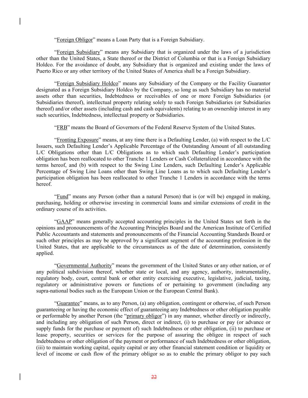 “Foreign Obligor” means a Loan Party that is a Foreign Subsidiary. “Foreign Subsidiary” means any Subsidiary that is organized under the laws of a jurisdiction other than the United States, a State thereof or the District of Columbia or that is a Foreign Subsidiary Holdco. For the avoidance of doubt, any Subsidiary that is organized and existing under the laws of Puerto Rico or any other territory of the United States of America shall be a Foreign Subsidiary. “Foreign Subsidiary Holdco” means any Subsidiary of the Company or the Facility Guarantor designated as a Foreign Subsidiary Holdco by the Company, so long as such Subsidiary has no material assets other than securities, Indebtedness or receivables of one or more Foreign Subsidiaries (or Subsidiaries thereof), intellectual property relating solely to such Foreign Subsidiaries (or Subsidiaries thereof) and/or other assets (including cash and cash equivalents) relating to an ownership interest in any such securities, Indebtedness, intellectual property or Subsidiaries. “FRB” means the Board of Governors of the Federal Reserve System of the United States. “Fronting Exposure” means, at any time there is a Defaulting Lender, (a) with respect to the L/C Issuers, such Defaulting Lender’s Applicable Percentage of the Outstanding Amount of all outstanding L/C Obligations other than L/C Obligations as to which such Defaulting Lender’s participation obligation has been reallocated to other Tranche 1 Lenders or Cash Collateralized in accordance with the terms hereof, and (b) with respect to the Swing Line Lenders, such Defaulting Lender’s Applicable Percentage of Swing Line Loans other than Swing Line Loans as to which such Defaulting Lender’s participation obligation has been reallocated to other Tranche 1 Lenders in accordance with the terms hereof. “Fund” means any Person (other than a natural Person) that is (or will be) engaged in making, purchasing, holding or otherwise investing in commercial loans and similar extensions of credit in the ordinary course of its activities. “GAAP” means generally accepted accounting principles in the United States set forth in the opinions and pronouncements of the Accounting Principles Board and the American Institute of Certified Public Accountants and statements and pronouncements of the Financial Accounting Standards Board or such other principles as may be approved by a significant segment of the accounting profession in the United States, that are applicable to the circumstances as of the date of determination, consistently applied. “Governmental Authority” means the government of the United States or any other nation, or of any political subdivision thereof, whether state or local, and any agency, authority, instrumentality, regulatory body, court, central bank or other entity exercising executive, legislative, judicial, taxing, regulatory or administrative powers or functions of or pertaining to government (including any supra-national bodies such as the European Union or the European Central Bank). “Guarantee” means, as to any Person, (a) any obligation, contingent or otherwise, of such Person guaranteeing or having the economic effect of guaranteeing any Indebtedness or other obligation payable or performable by another Person (the “primary obligor”) in any manner, whether directly or indirectly, and including any obligation of such Person, direct or indirect, (i) to purchase or pay (or advance or supply funds for the purchase or payment of) such Indebtedness or other obligation, (ii) to purchase or lease property, securities or services for the purpose of assuring the obligee in respect of such Indebtedness or other obligation of the payment or performance of such Indebtedness or other obligation, (iii) to maintain working capital, equity capital or any other financial statement condition or liquidity or level of income or cash flow of the primary obligor so as to enable the primary obligor to pay such 22