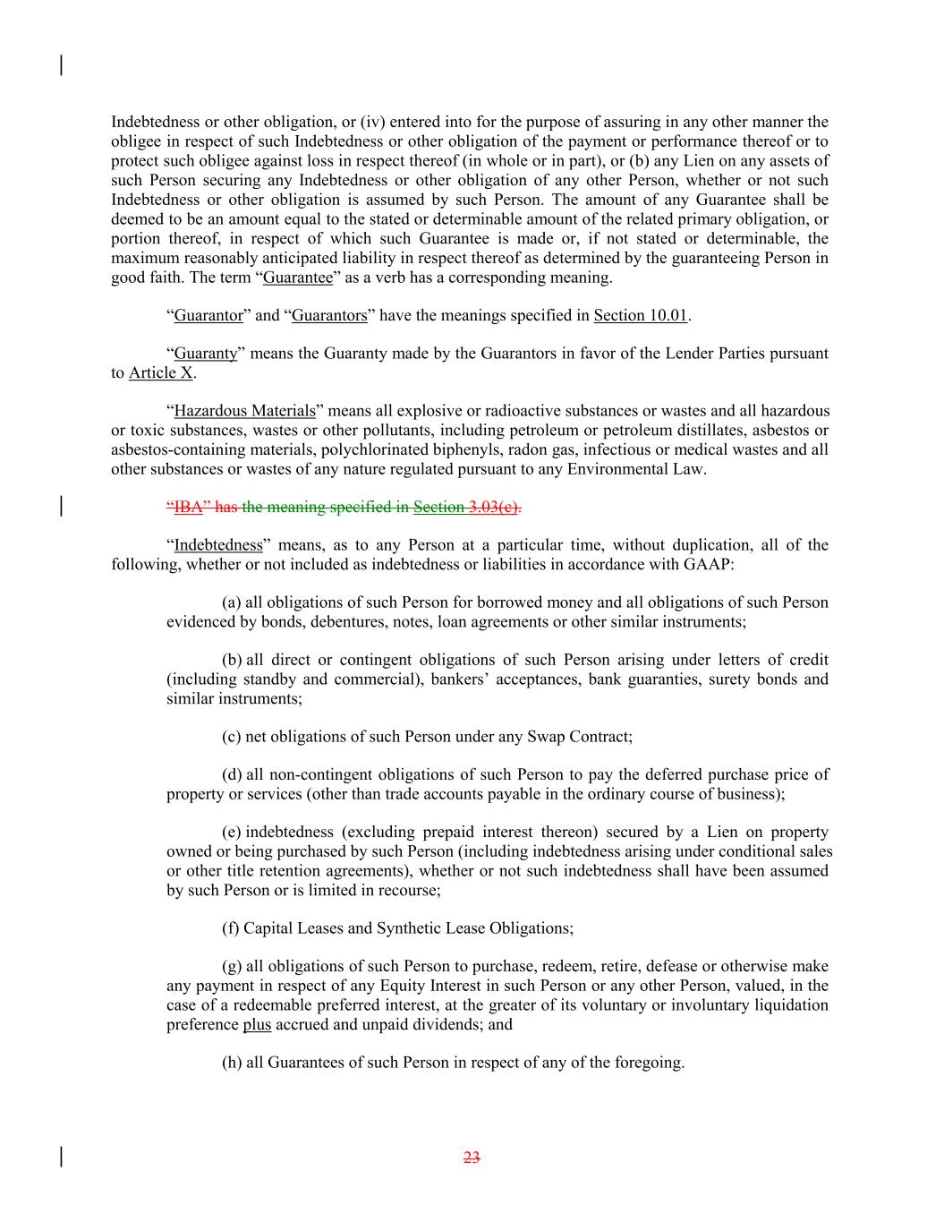 Indebtedness or other obligation, or (iv) entered into for the purpose of assuring in any other manner the obligee in respect of such Indebtedness or other obligation of the payment or performance thereof or to protect such obligee against loss in respect thereof (in whole or in part), or (b) any Lien on any assets of such Person securing any Indebtedness or other obligation of any other Person, whether or not such Indebtedness or other obligation is assumed by such Person. The amount of any Guarantee shall be deemed to be an amount equal to the stated or determinable amount of the related primary obligation, or portion thereof, in respect of which such Guarantee is made or, if not stated or determinable, the maximum reasonably anticipated liability in respect thereof as determined by the guaranteeing Person in good faith. The term “Guarantee” as a verb has a corresponding meaning. “Guarantor” and “Guarantors” have the meanings specified in Section 10.01. “Guaranty” means the Guaranty made by the Guarantors in favor of the Lender Parties pursuant to Article X. “Hazardous Materials” means all explosive or radioactive substances or wastes and all hazardous or toxic substances, wastes or other pollutants, including petroleum or petroleum distillates, asbestos or asbestos-containing materials, polychlorinated biphenyls, radon gas, infectious or medical wastes and all other substances or wastes of any nature regulated pursuant to any Environmental Law. “IBA” has the meaning specified in Section 3.03(c). “Indebtedness” means, as to any Person at a particular time, without duplication, all of the following, whether or not included as indebtedness or liabilities in accordance with GAAP: (a) all obligations of such Person for borrowed money and all obligations of such Person evidenced by bonds, debentures, notes, loan agreements or other similar instruments; (b) all direct or contingent obligations of such Person arising under letters of credit (including standby and commercial), bankers’ acceptances, bank guaranties, surety bonds and similar instruments; (c) net obligations of such Person under any Swap Contract; (d) all non-contingent obligations of such Person to pay the deferred purchase price of property or services (other than trade accounts payable in the ordinary course of business); (e) indebtedness (excluding prepaid interest thereon) secured by a Lien on property owned or being purchased by such Person (including indebtedness arising under conditional sales or other title retention agreements), whether or not such indebtedness shall have been assumed by such Person or is limited in recourse; (f) Capital Leases and Synthetic Lease Obligations; (g) all obligations of such Person to purchase, redeem, retire, defease or otherwise make any payment in respect of any Equity Interest in such Person or any other Person, valued, in the case of a redeemable preferred interest, at the greater of its voluntary or involuntary liquidation preference plus accrued and unpaid dividends; and (h) all Guarantees of such Person in respect of any of the foregoing. 23