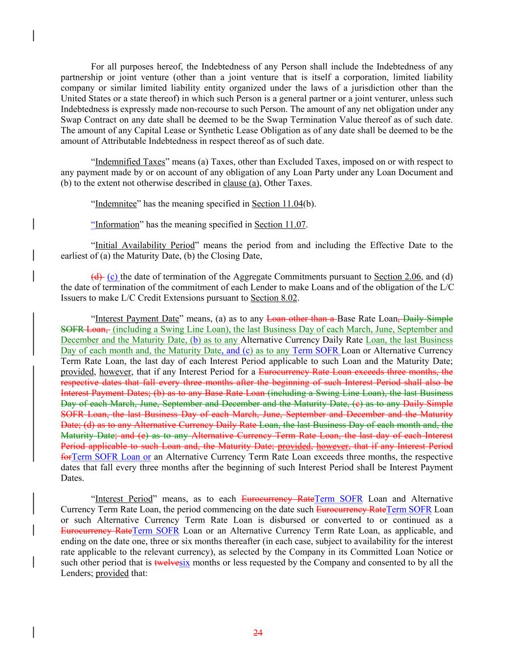 For all purposes hereof, the Indebtedness of any Person shall include the Indebtedness of any partnership or joint venture (other than a joint venture that is itself a corporation, limited liability company or similar limited liability entity organized under the laws of a jurisdiction other than the United States or a state thereof) in which such Person is a general partner or a joint venturer, unless such Indebtedness is expressly made non-recourse to such Person. The amount of any net obligation under any Swap Contract on any date shall be deemed to be the Swap Termination Value thereof as of such date. The amount of any Capital Lease or Synthetic Lease Obligation as of any date shall be deemed to be the amount of Attributable Indebtedness in respect thereof as of such date. “Indemnified Taxes” means (a) Taxes, other than Excluded Taxes, imposed on or with respect to any payment made by or on account of any obligation of any Loan Party under any Loan Document and (b) to the extent not otherwise described in clause (a), Other Taxes. “Indemnitee” has the meaning specified in Section 11.04(b). “Information” has the meaning specified in Section 11.07. “Initial Availability Period” means the period from and including the Effective Date to the earliest of (a) the Maturity Date, (b) the Closing Date, (d) (c) the date of termination of the Aggregate Commitments pursuant to Section 2.06, and (d) the date of termination of the commitment of each Lender to make Loans and of the obligation of the L/C Issuers to make L/C Credit Extensions pursuant to Section 8.02. “Interest Payment Date” means, (a) as to any Loan other than a Base Rate Loan, Daily Simple SOFR Loan, (including a Swing Line Loan), the last Business Day of each March, June, September and December and the Maturity Date, (b) as to any Alternative Currency Daily Rate Loan, the last Business Day of each month and, the Maturity Date, and (c) as to any Term SOFR Loan or Alternative Currency Term Rate Loan, the last day of each Interest Period applicable to such Loan and the Maturity Date; provided, however, that if any Interest Period for a Eurocurrency Rate Loan exceeds three months, the respective dates that fall every three months after the beginning of such Interest Period shall also be Interest Payment Dates; (b) as to any Base Rate Loan (including a Swing Line Loan), the last Business Day of each March, June, September and December and the Maturity Date, (c) as to any Daily Simple SOFR Loan, the last Business Day of each March, June, September and December and the Maturity Date; (d) as to any Alternative Currency Daily Rate Loan, the last Business Day of each month and, the Maturity Date; and (e) as to any Alternative Currency Term Rate Loan, the last day of each Interest Period applicable to such Loan and, the Maturity Date; provided, however, that if any Interest Period forTerm SOFR Loan or an Alternative Currency Term Rate Loan exceeds three months, the respective dates that fall every three months after the beginning of such Interest Period shall be Interest Payment Dates. “Interest Period” means, as to each Eurocurrency RateTerm SOFR Loan and Alternative Currency Term Rate Loan, the period commencing on the date such Eurocurrency RateTerm SOFR Loan or such Alternative Currency Term Rate Loan is disbursed or converted to or continued as a Eurocurrency RateTerm SOFR Loan or an Alternative Currency Term Rate Loan, as applicable, and ending on the date one, three or six months thereafter (in each case, subject to availability for the interest rate applicable to the relevant currency), as selected by the Company in its Committed Loan Notice or such other period that is twelvesix months or less requested by the Company and consented to by all the Lenders; provided that: 24