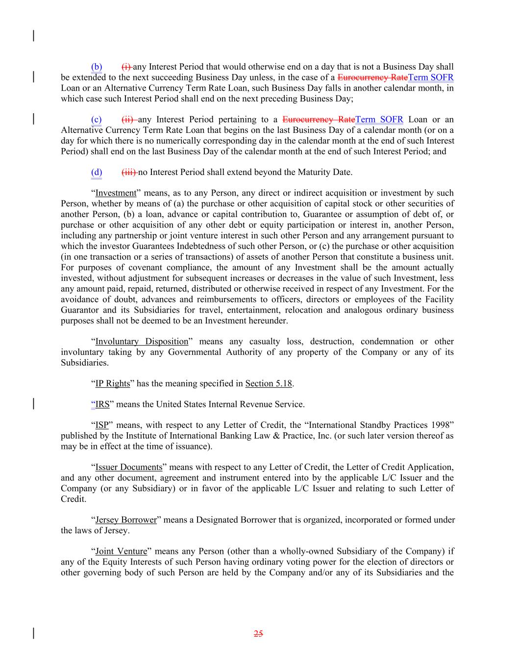(b) (i) any Interest Period that would otherwise end on a day that is not a Business Day shall be extended to the next succeeding Business Day unless, in the case of a Eurocurrency RateTerm SOFR Loan or an Alternative Currency Term Rate Loan, such Business Day falls in another calendar month, in which case such Interest Period shall end on the next preceding Business Day; (c) (ii) any Interest Period pertaining to a Eurocurrency RateTerm SOFR Loan or an Alternative Currency Term Rate Loan that begins on the last Business Day of a calendar month (or on a day for which there is no numerically corresponding day in the calendar month at the end of such Interest Period) shall end on the last Business Day of the calendar month at the end of such Interest Period; and (d) (iii) no Interest Period shall extend beyond the Maturity Date. “Investment” means, as to any Person, any direct or indirect acquisition or investment by such Person, whether by means of (a) the purchase or other acquisition of capital stock or other securities of another Person, (b) a loan, advance or capital contribution to, Guarantee or assumption of debt of, or purchase or other acquisition of any other debt or equity participation or interest in, another Person, including any partnership or joint venture interest in such other Person and any arrangement pursuant to which the investor Guarantees Indebtedness of such other Person, or (c) the purchase or other acquisition (in one transaction or a series of transactions) of assets of another Person that constitute a business unit. For purposes of covenant compliance, the amount of any Investment shall be the amount actually invested, without adjustment for subsequent increases or decreases in the value of such Investment, less any amount paid, repaid, returned, distributed or otherwise received in respect of any Investment. For the avoidance of doubt, advances and reimbursements to officers, directors or employees of the Facility Guarantor and its Subsidiaries for travel, entertainment, relocation and analogous ordinary business purposes shall not be deemed to be an Investment hereunder. “Involuntary Disposition” means any casualty loss, destruction, condemnation or other involuntary taking by any Governmental Authority of any property of the Company or any of its Subsidiaries. “IP Rights” has the meaning specified in Section 5.18. “IRS” means the United States Internal Revenue Service. “ISP” means, with respect to any Letter of Credit, the “International Standby Practices 1998” published by the Institute of International Banking Law & Practice, Inc. (or such later version thereof as may be in effect at the time of issuance). “Issuer Documents” means with respect to any Letter of Credit, the Letter of Credit Application, and any other document, agreement and instrument entered into by the applicable L/C Issuer and the Company (or any Subsidiary) or in favor of the applicable L/C Issuer and relating to such Letter of Credit. “Jersey Borrower” means a Designated Borrower that is organized, incorporated or formed under the laws of Jersey. “Joint Venture” means any Person (other than a wholly-owned Subsidiary of the Company) if any of the Equity Interests of such Person having ordinary voting power for the election of directors or other governing body of such Person are held by the Company and/or any of its Subsidiaries and the 25